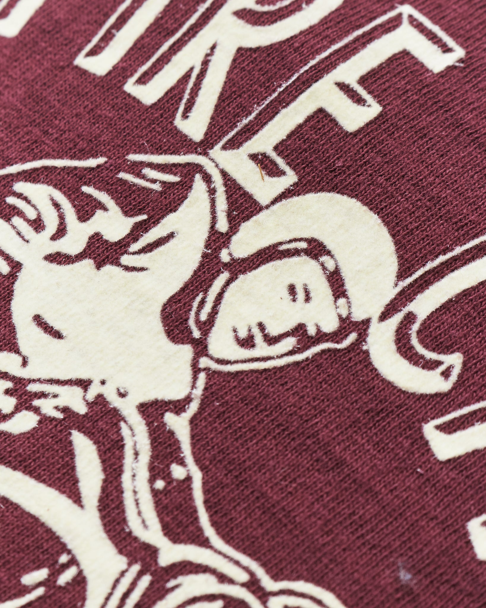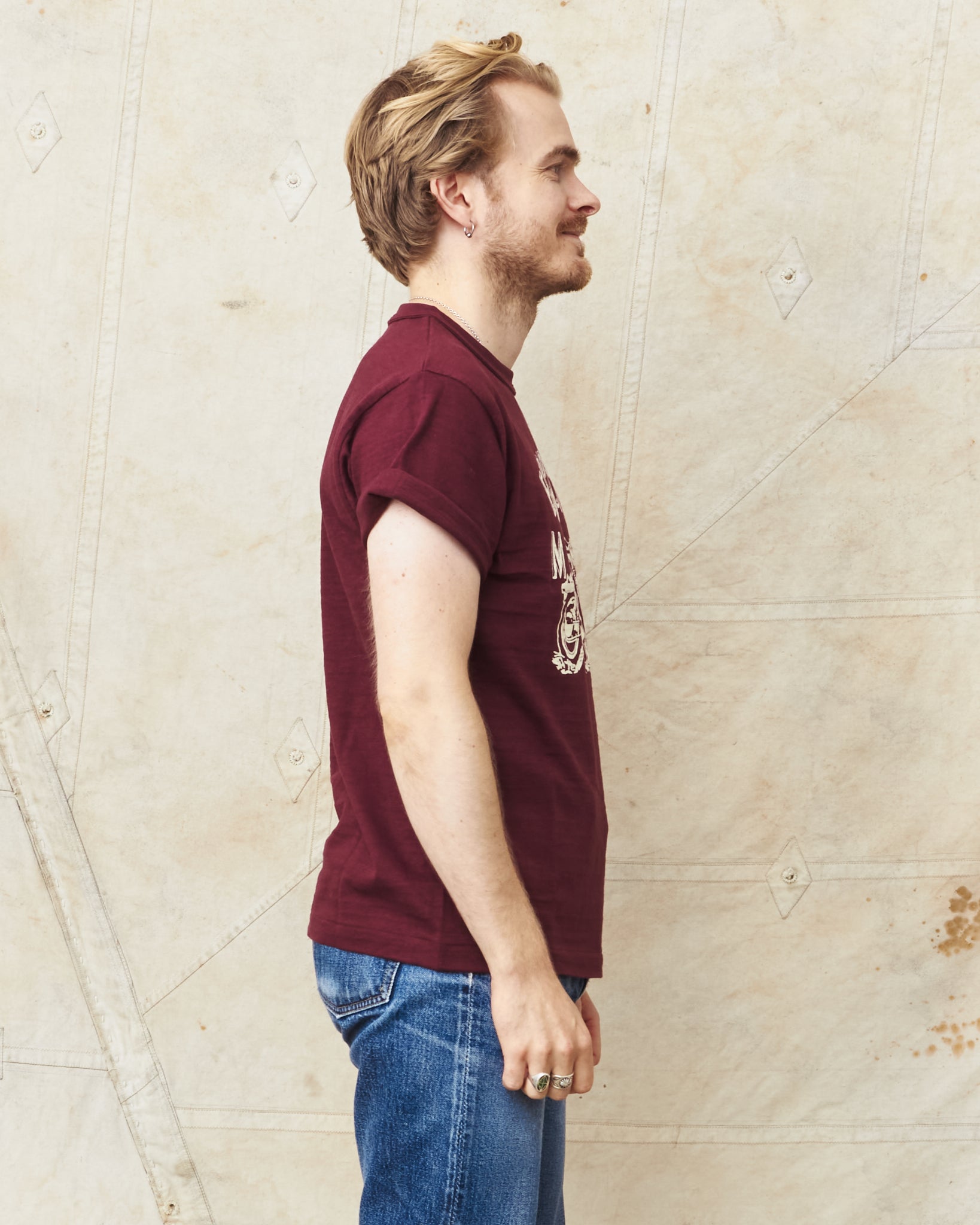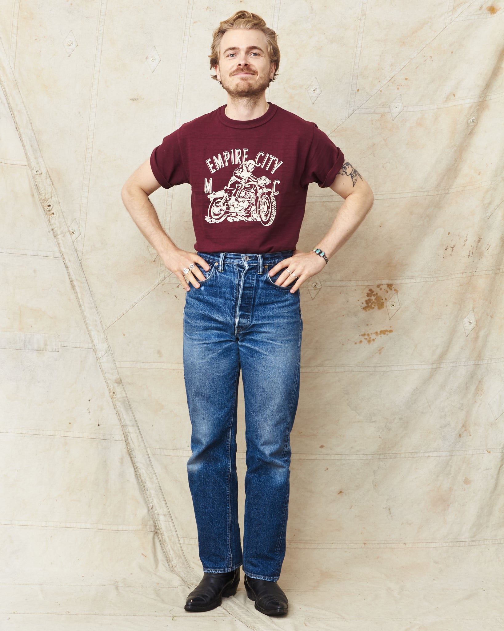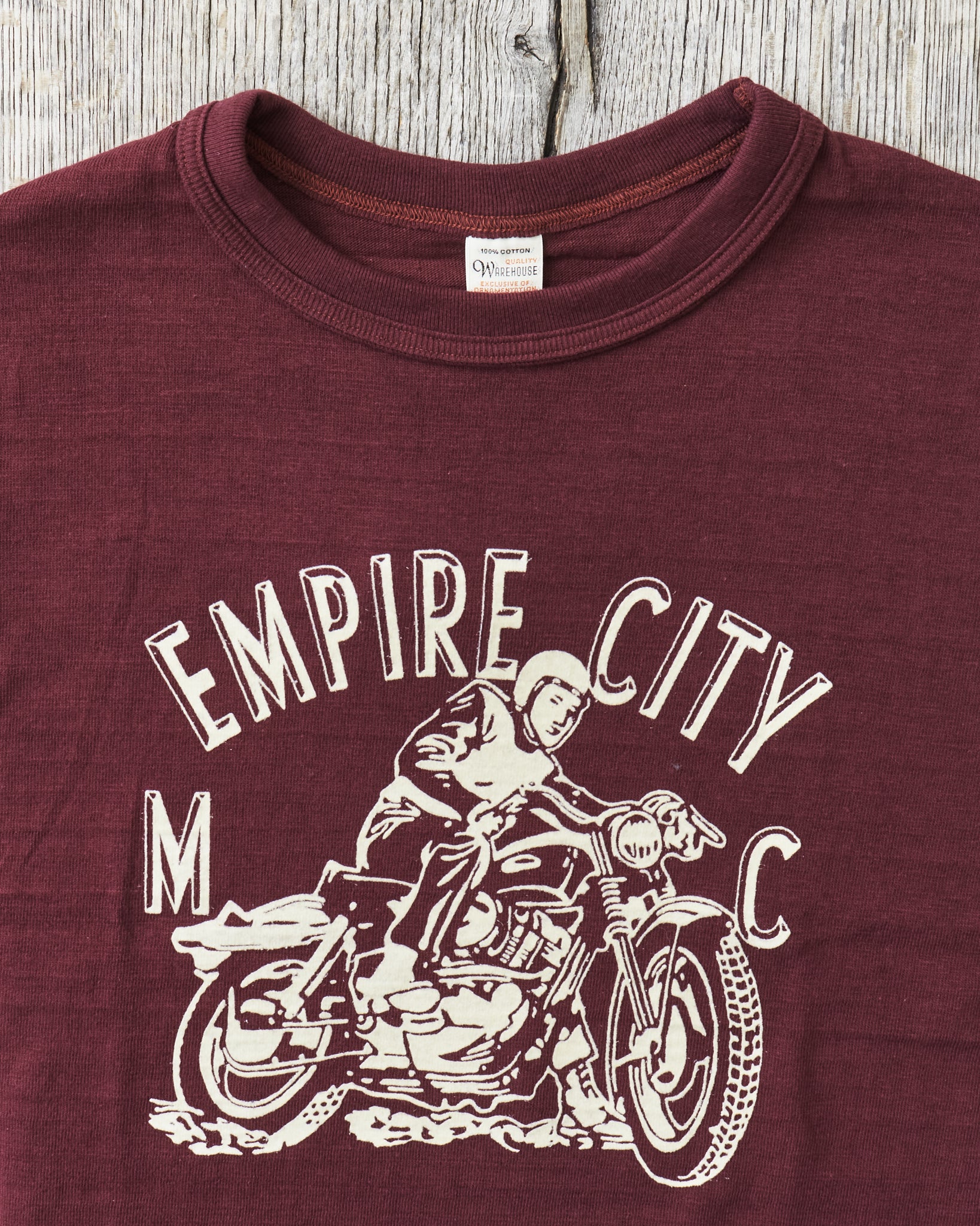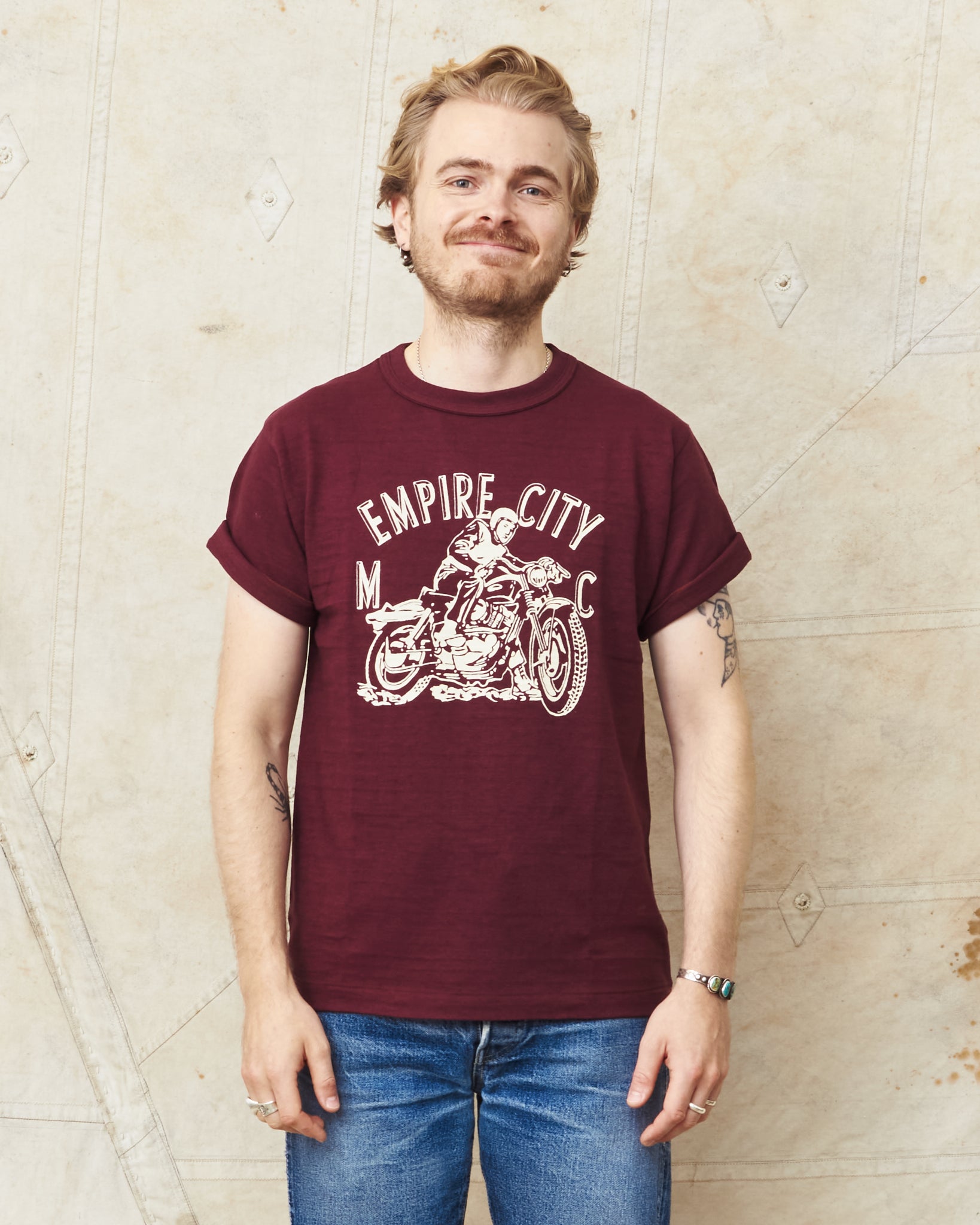This version comes in the classic bordeaux color and with a white flock print, the motif is of a vintage style track biker and with the letters Empire City MC to accompany the rider.