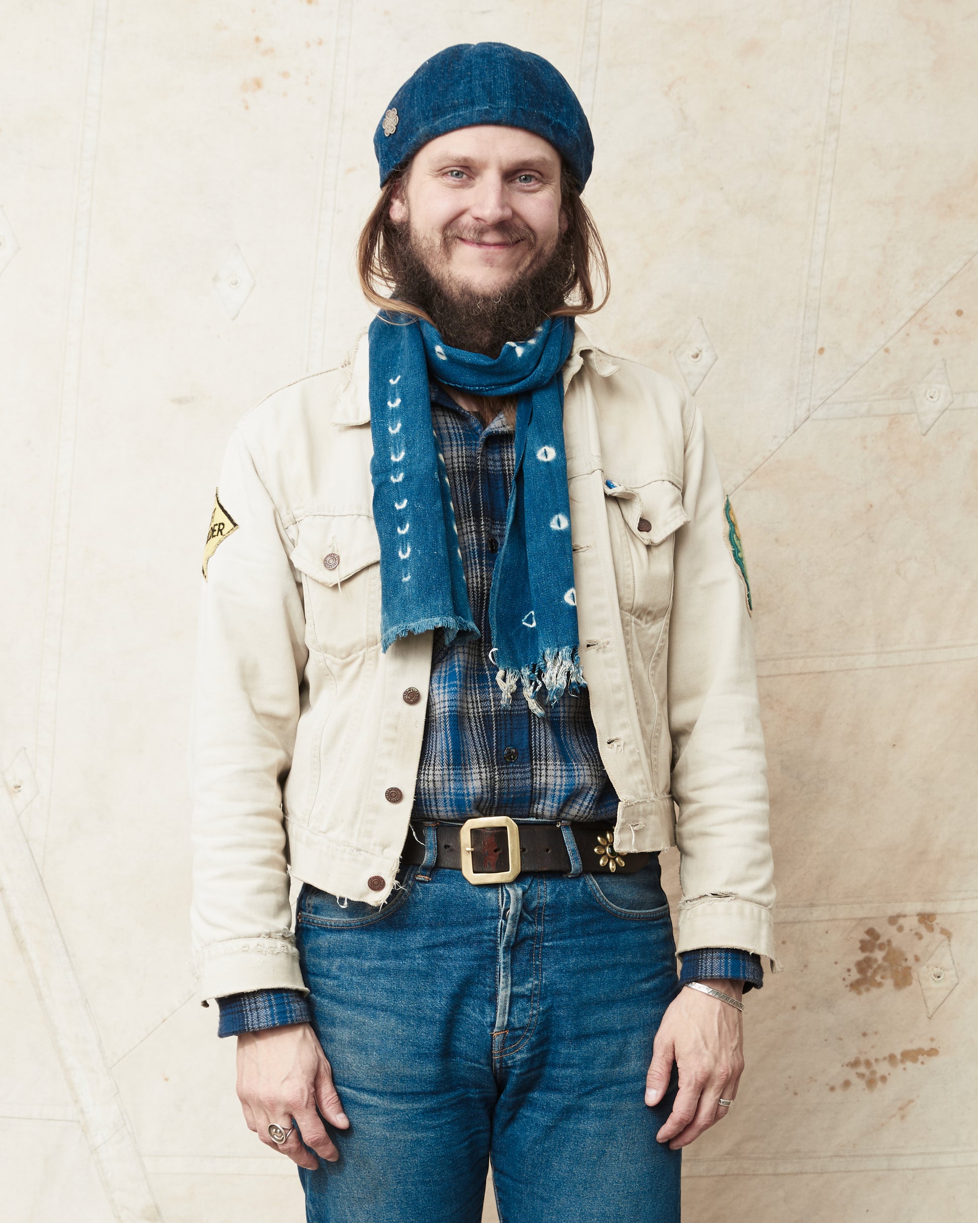 The pattern on this one is made using a stitch resist dye technique were the pattern is made by sewing rows of stitches in the fabric before it is dyed in indigo.