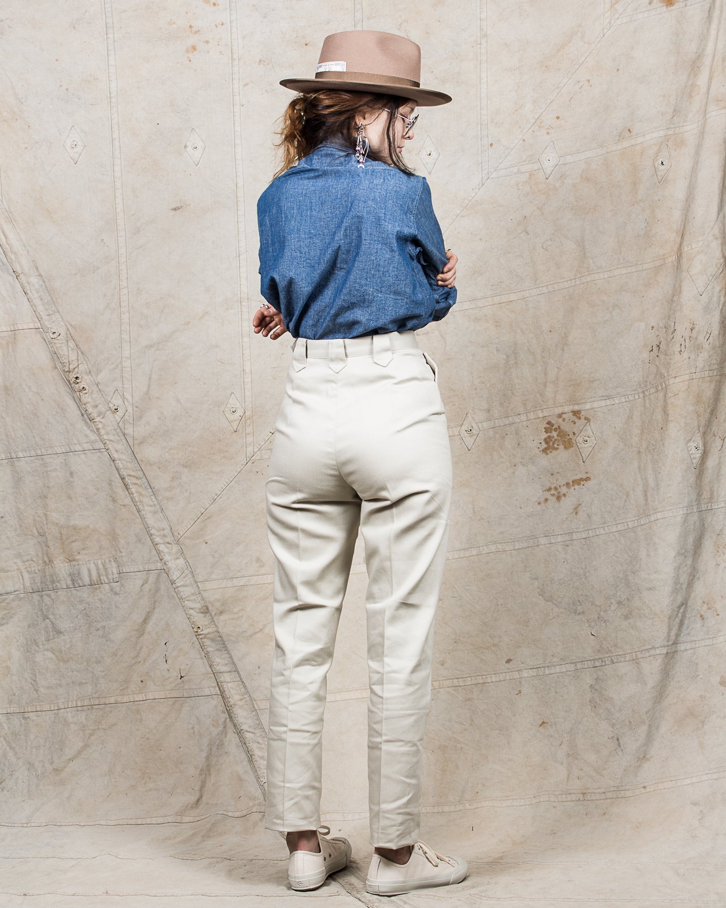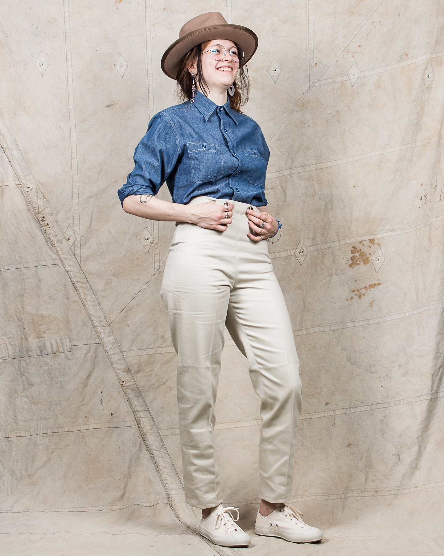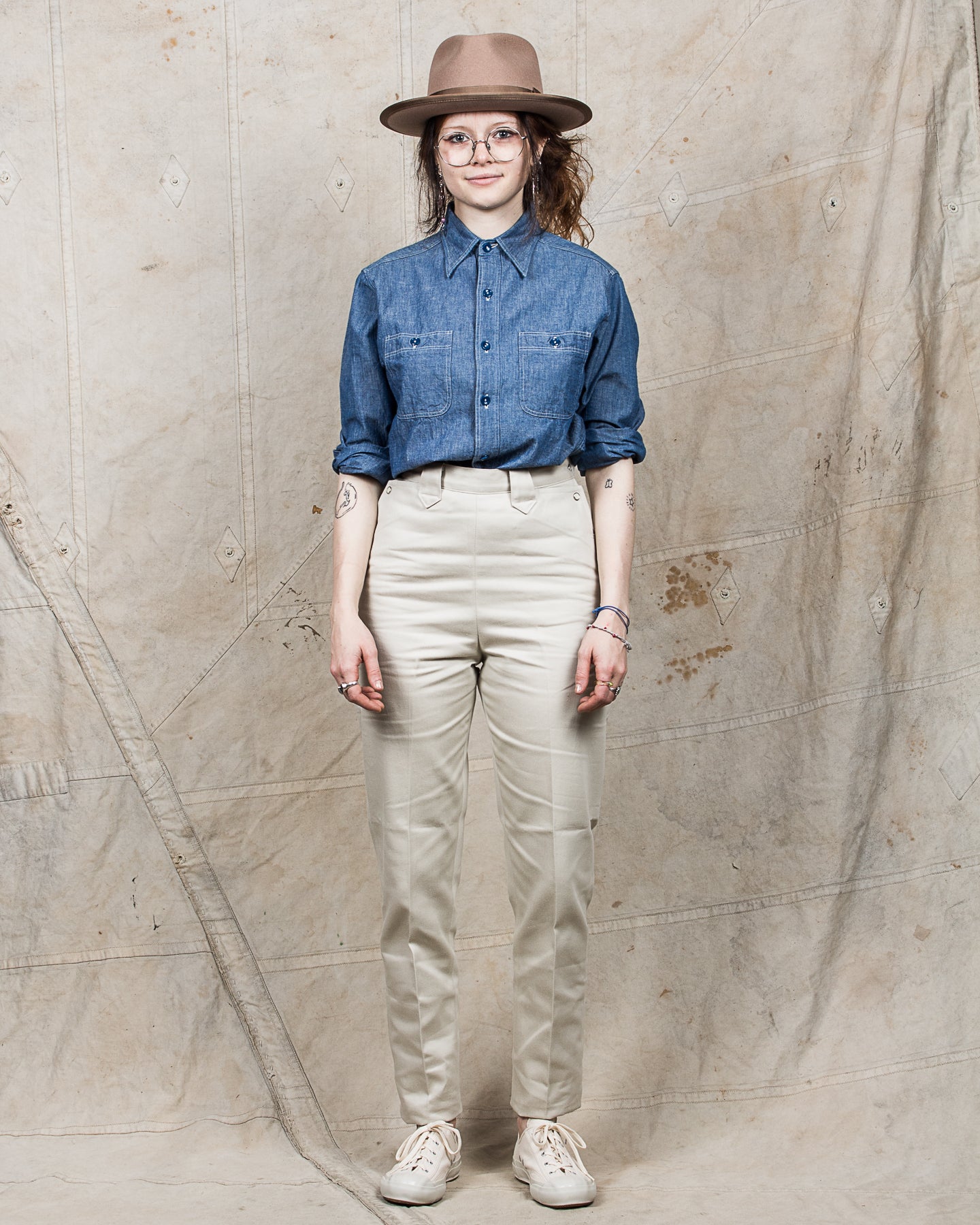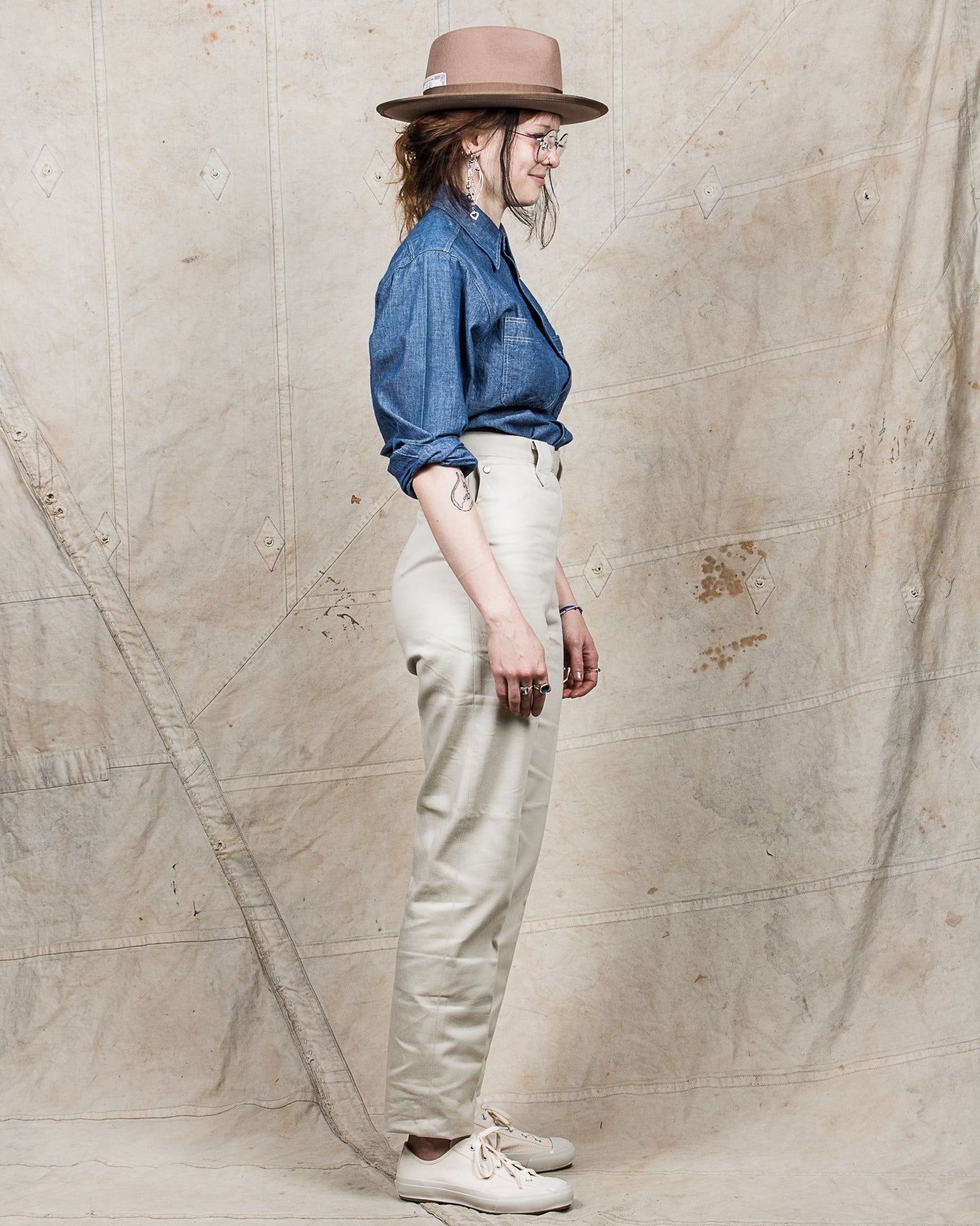 Anatomica lot 618 finds its inspiration in women's western pants from the middle of the last century. These pants are cut with a high waist and they follow the shape of the body, the darts at the back are made to follow the shape of the hips. A Universal brass zipper is covered at the side of the pants and the zipper is long enough to make them easy to get in. The pants has western style front pockets and the time typical wide dart belt loops thats associate with old time western wear.