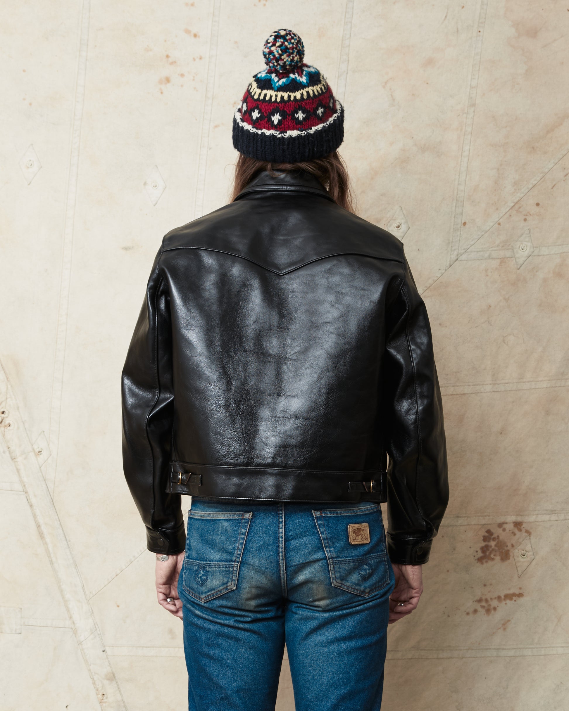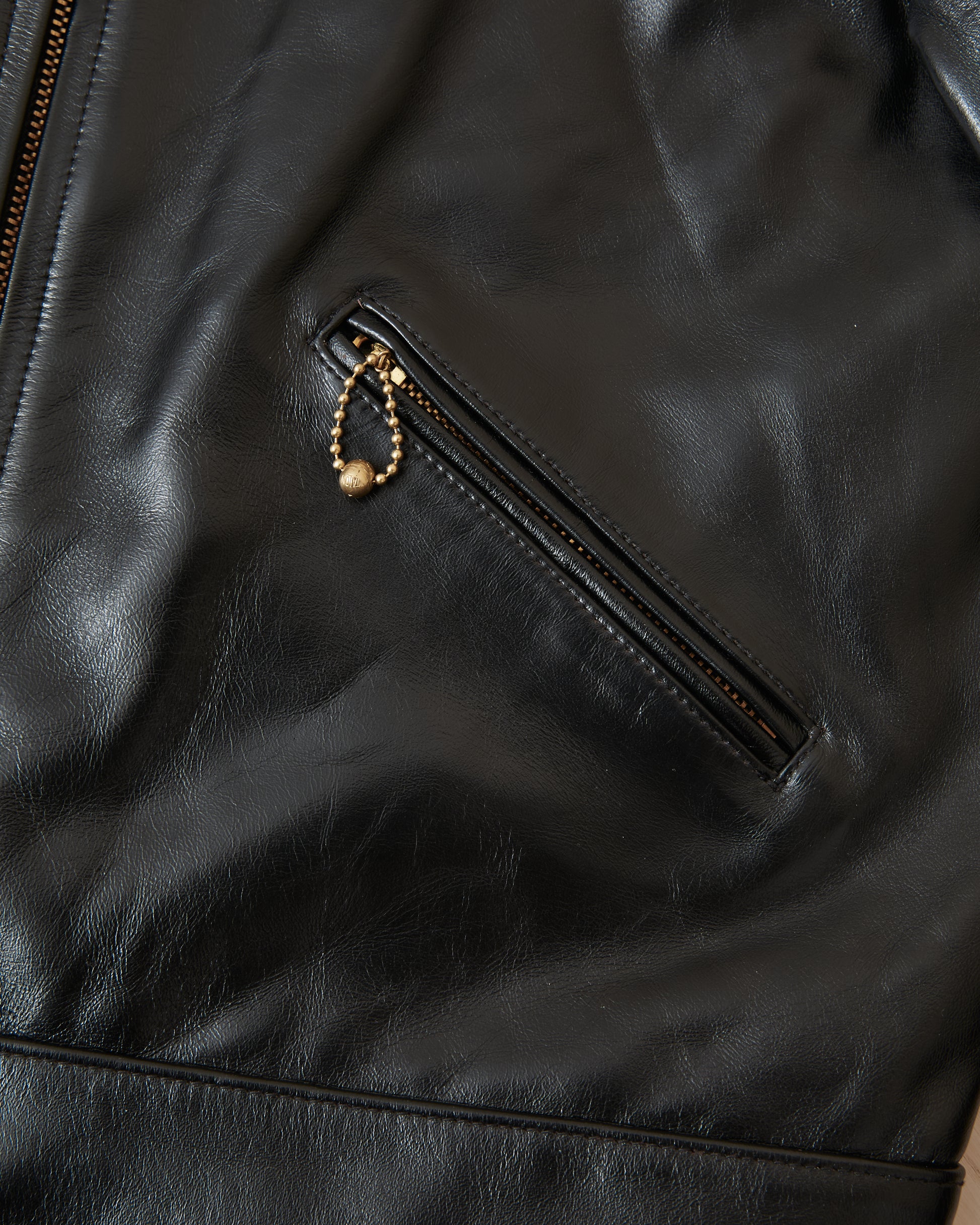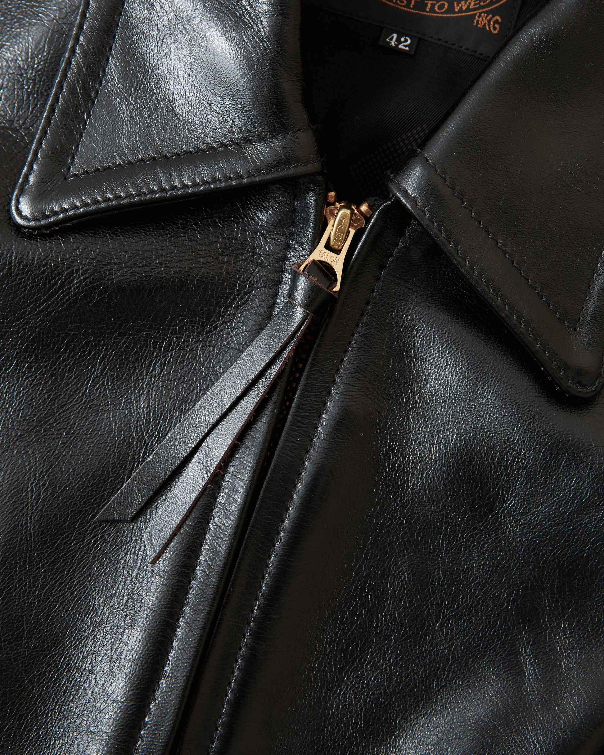 Made in Kanagawa, just outside of Tokyo, using a veg tanned black over brown horsehide, as the jacket ages it will uncover brown highlights. With solid brass zippers from Talon Japan and Bryceland's original print rayon lining, the short blouson type jacket is meant to be thrown over a tee and jeans, a light layering piece that needs a cafe racer and an empty road.