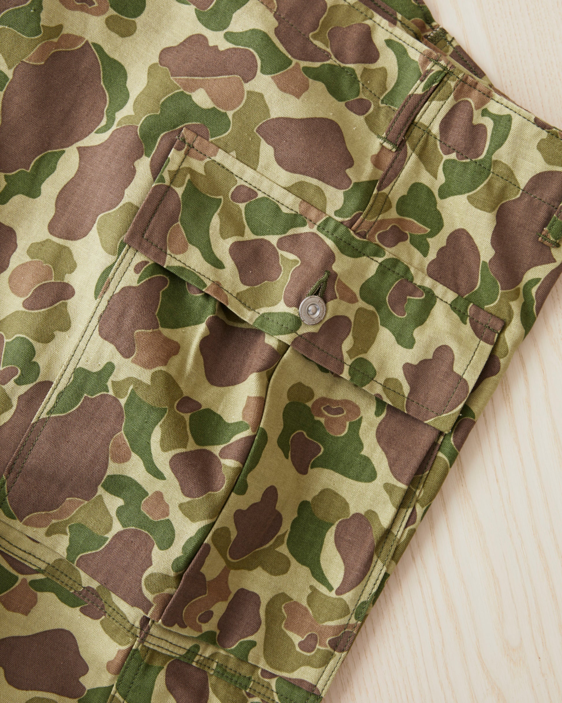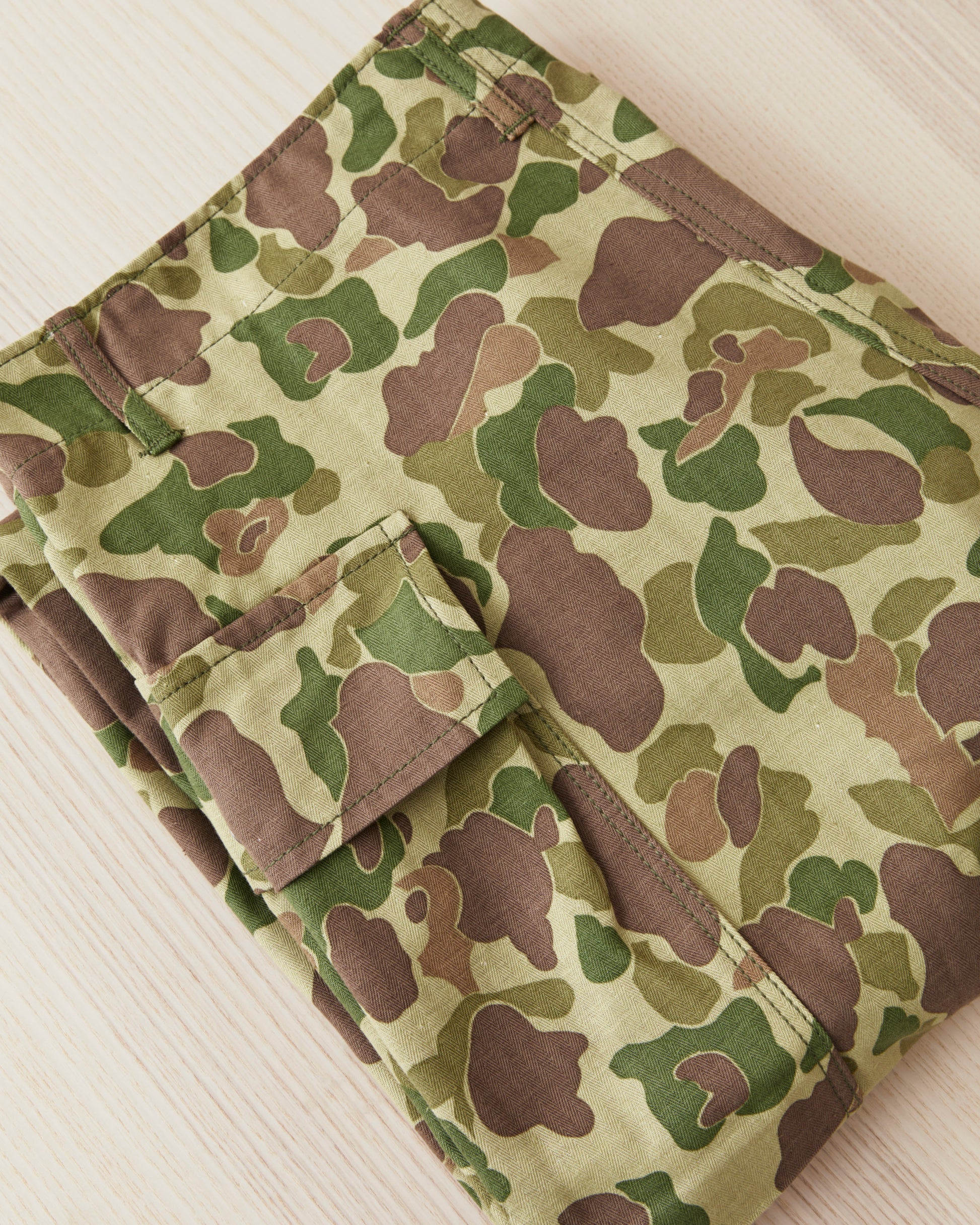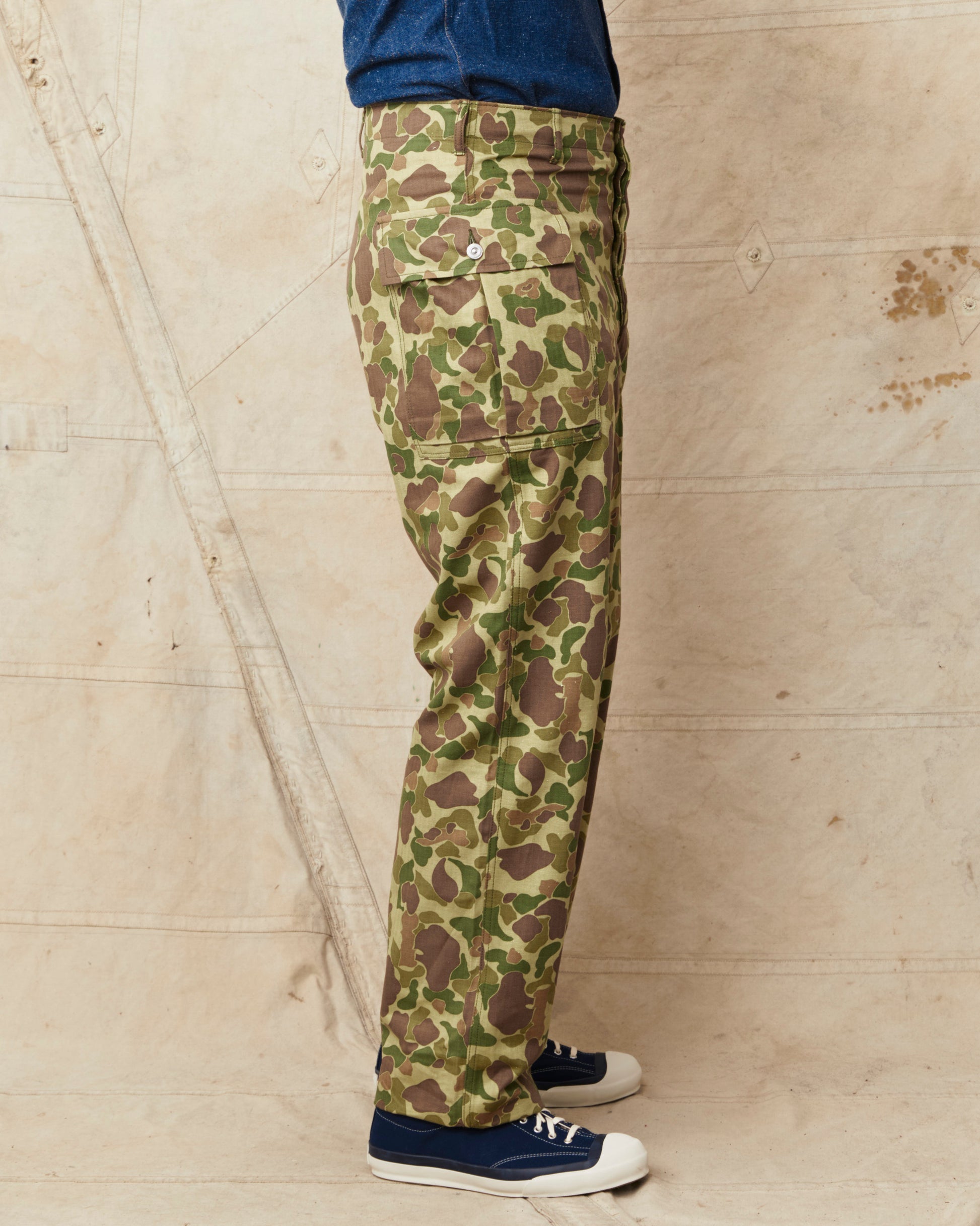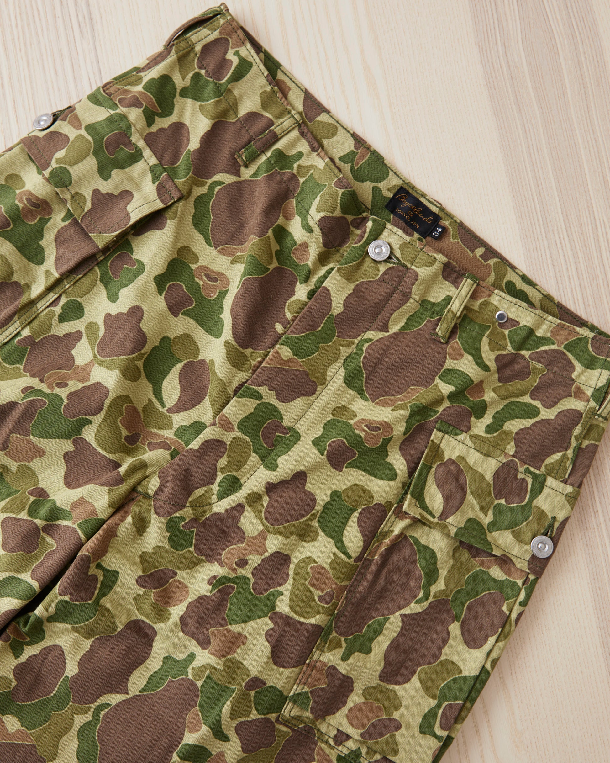 This is Bryceland's P13's Camouflage pants. The inspiration for these comes from Vintage Army classics like the P-44, P-44 & P-47, alongside classic tailored pants from the first half of the 20th century. The pants sits high at the waist, there is room for the hip and a straight leg with a slight taper. They are made in Japan out of a 10oz heavy cotton HBT twill fabric. The buttons are unfinished metal buttons that will patina with wear and wash. Giving the pants more and more of a vintage look.