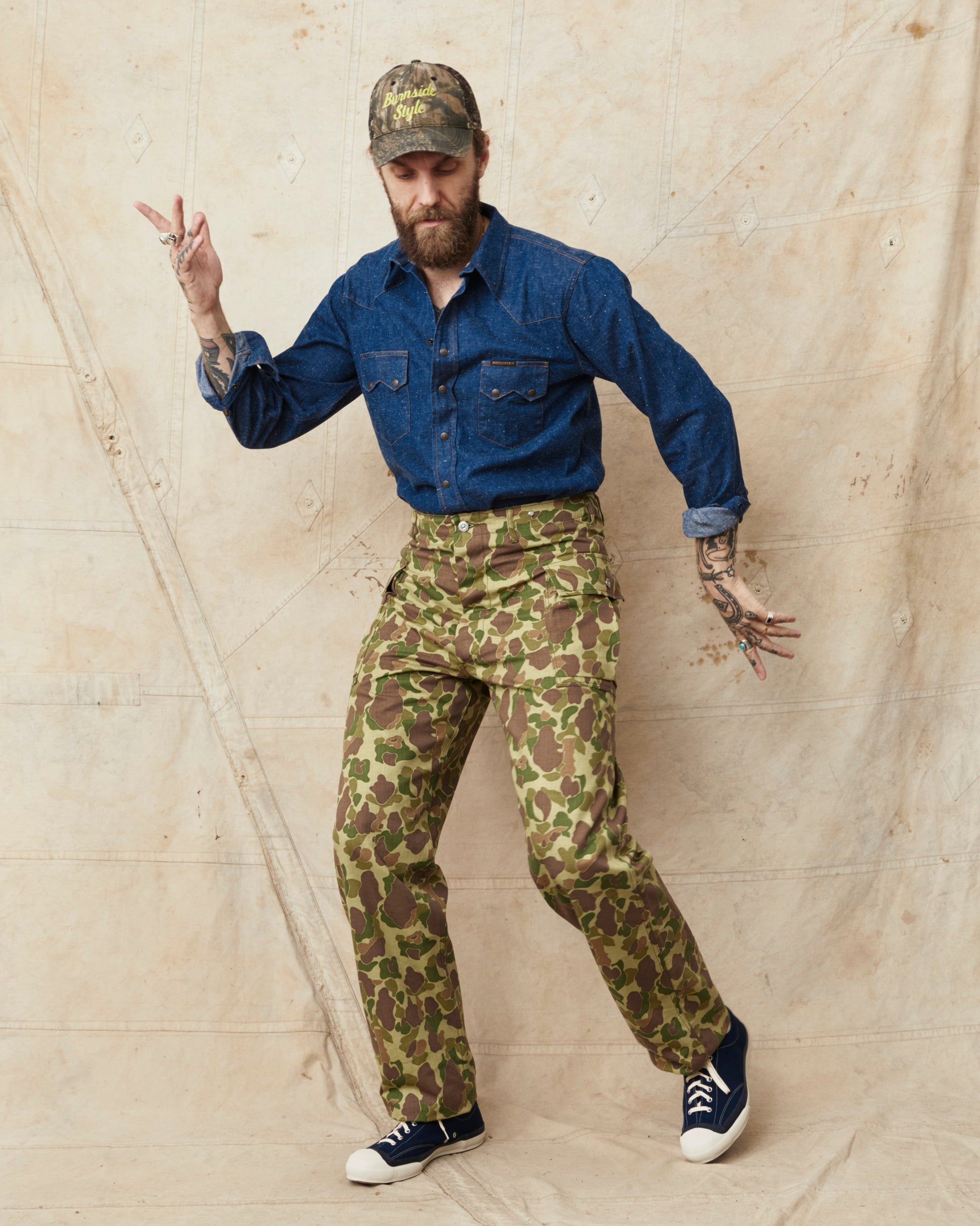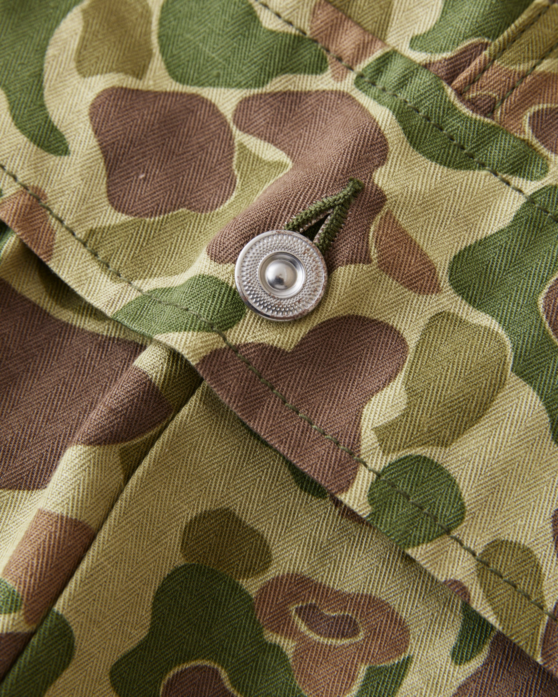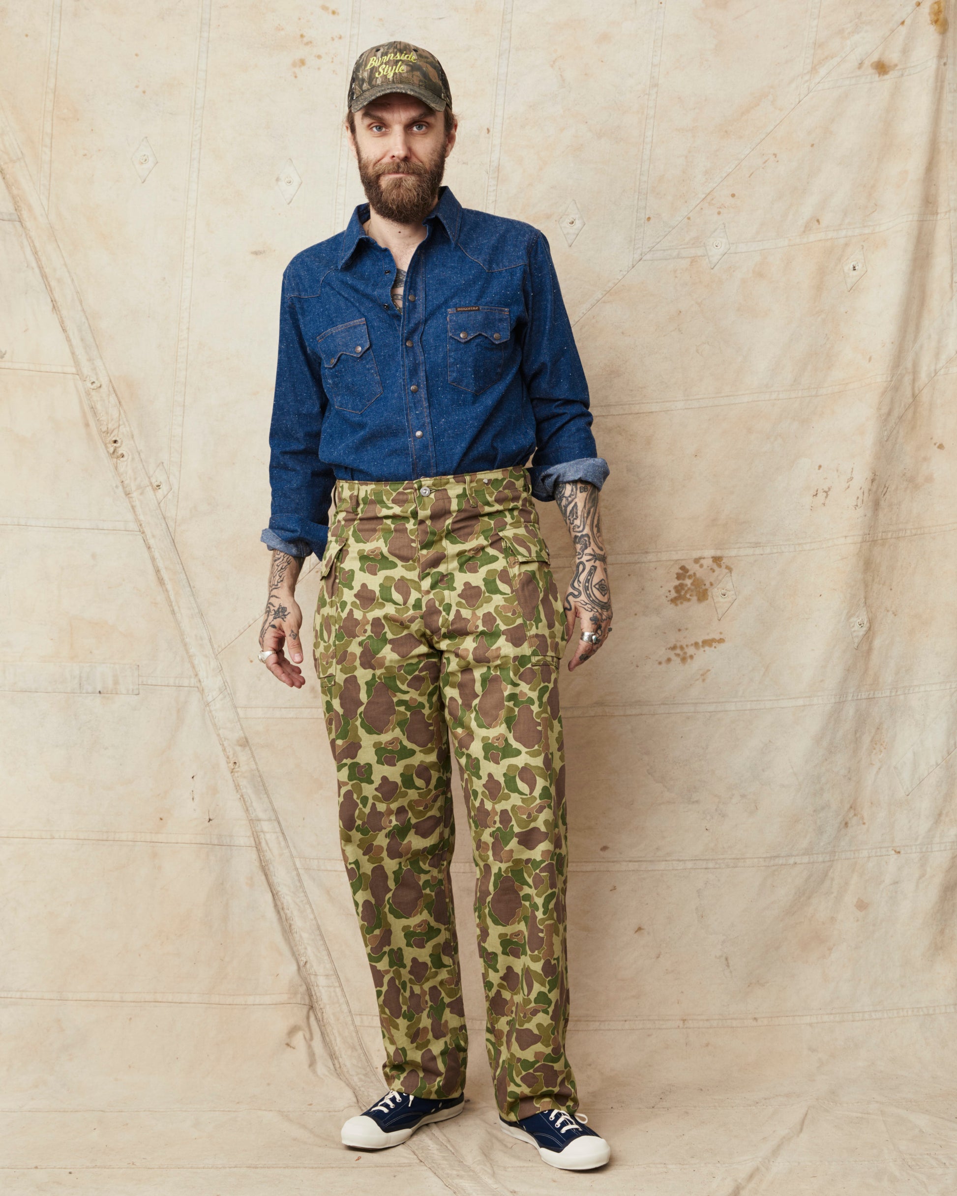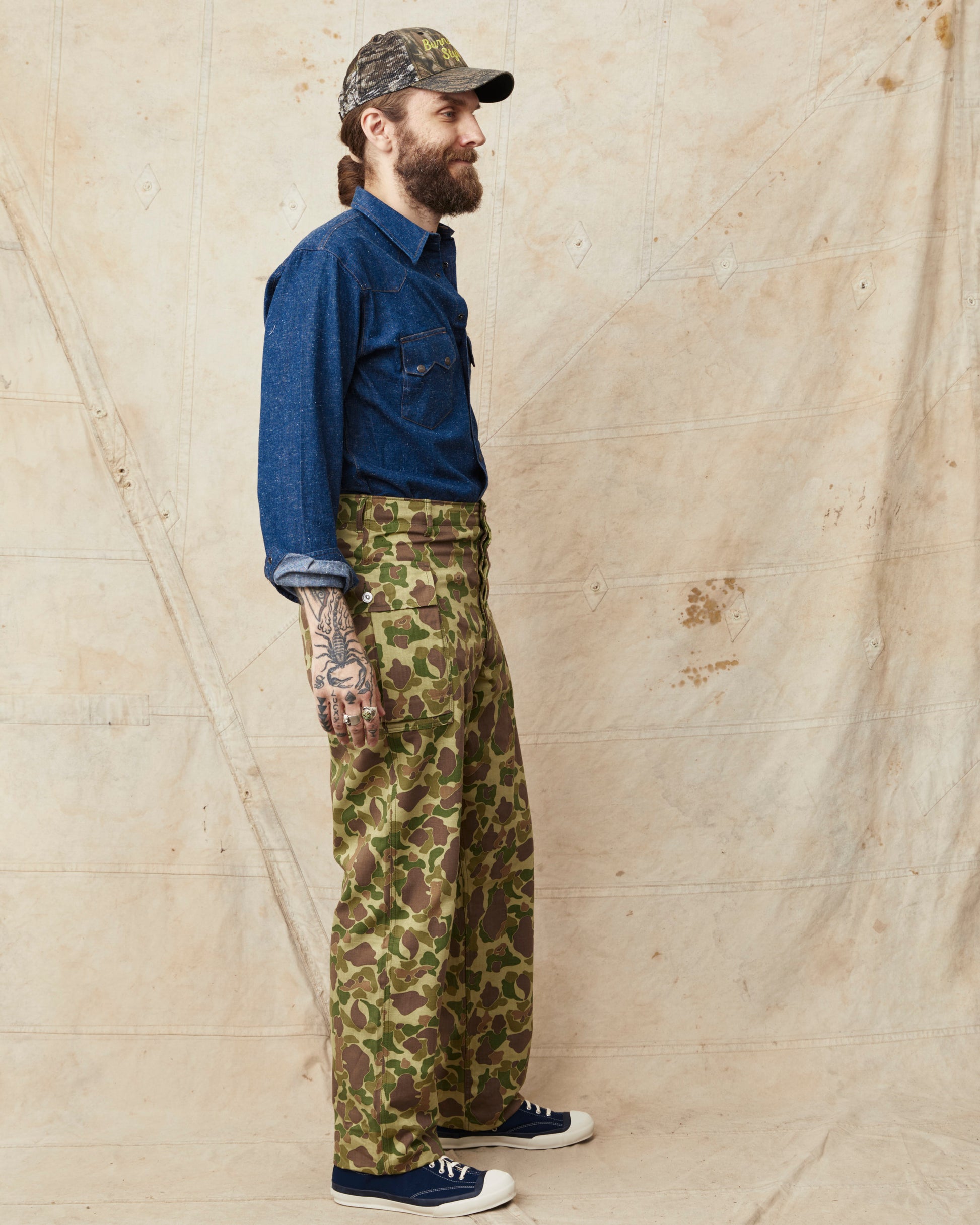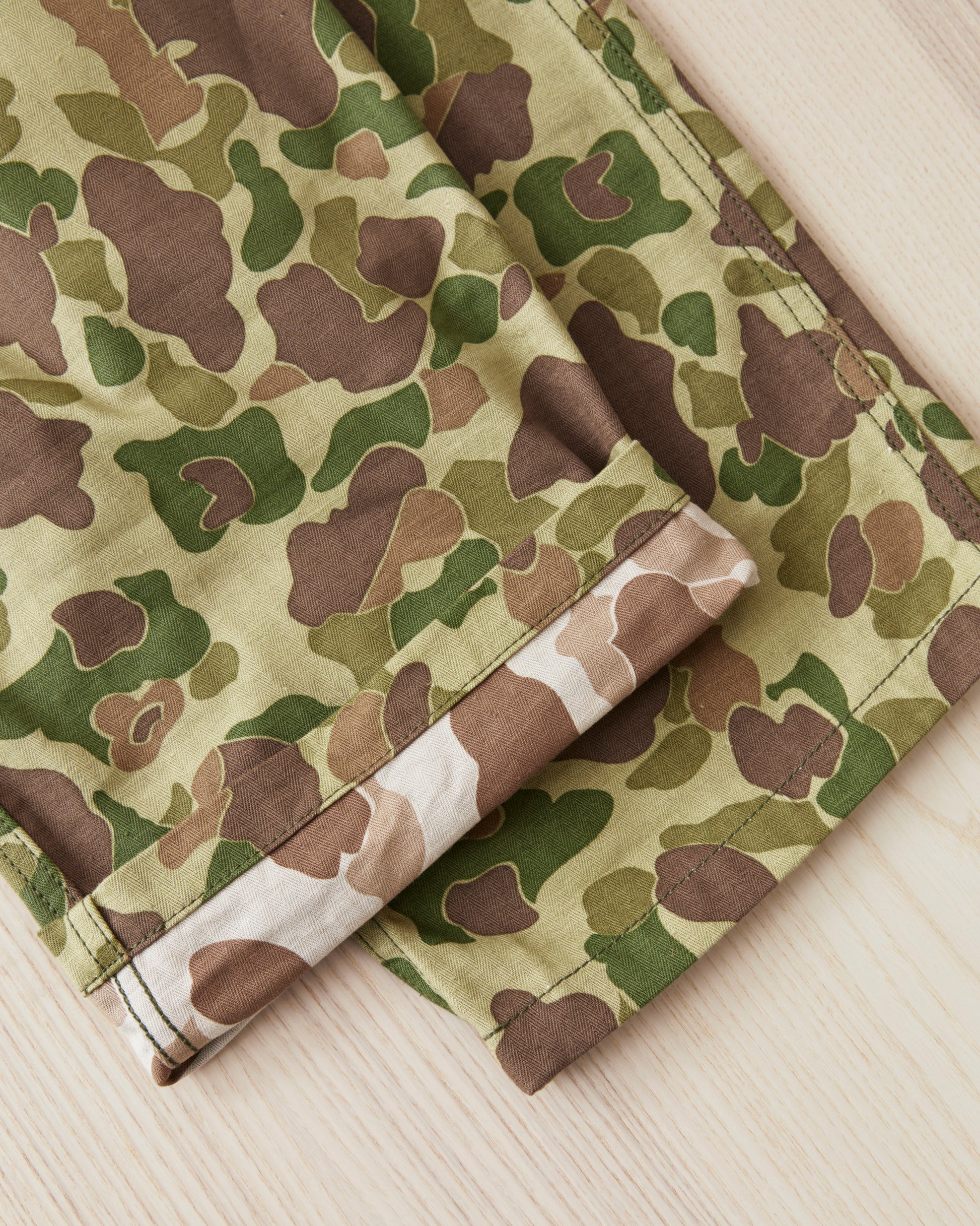 This is Bryceland's P13's Camouflage pants. The inspiration for these comes from Vintage Army classics like the P-44, P-44 & P-47, alongside classic tailored pants from the first half of the 20th century. The pants sits high at the waist, there is room for the hip and a straight leg with a slight taper. They are made in Japan out of a 10oz heavy cotton HBT twill fabric. The buttons are unfinished metal buttons that will patina with wear and wash. Giving the pants more and more of a vintage look.