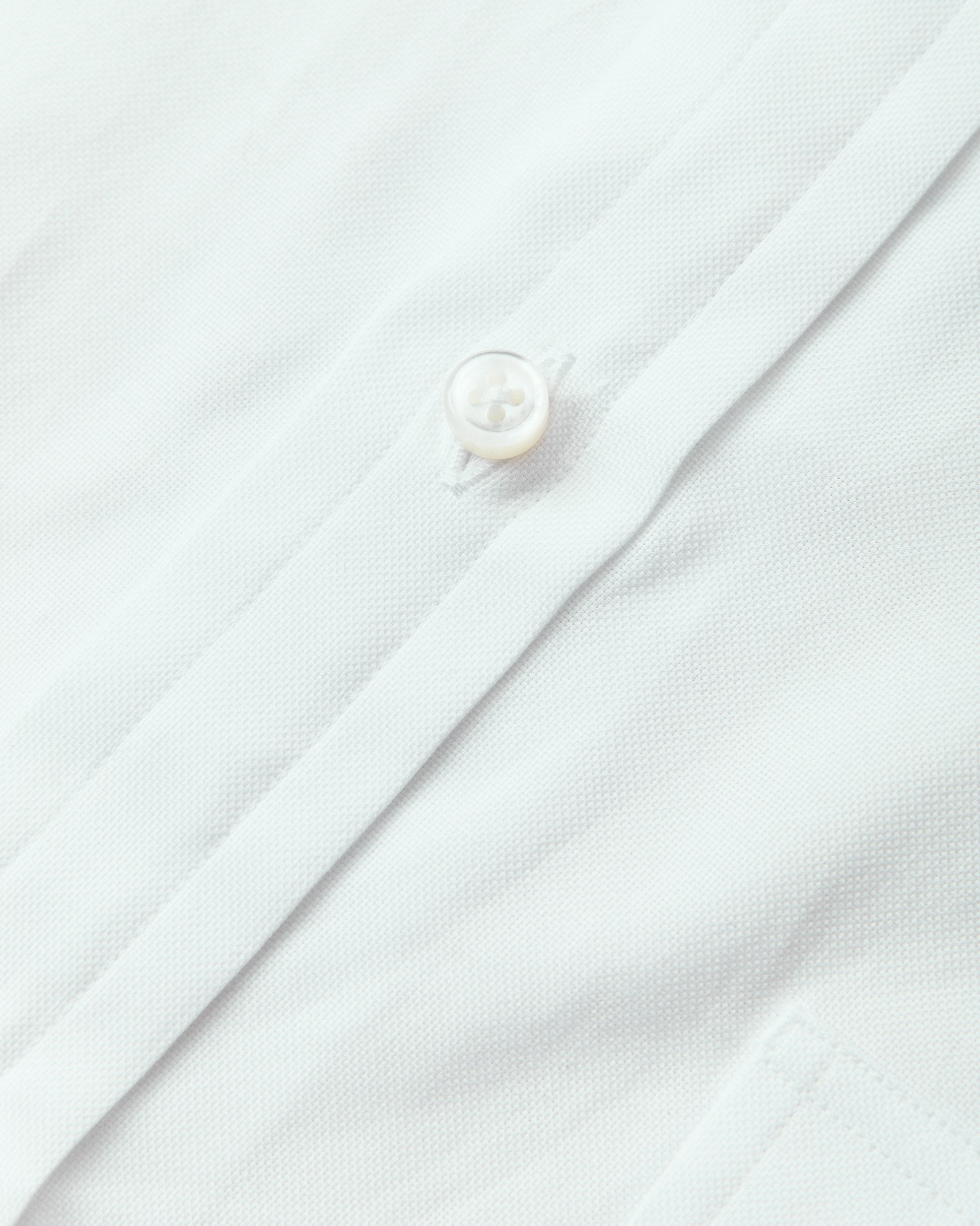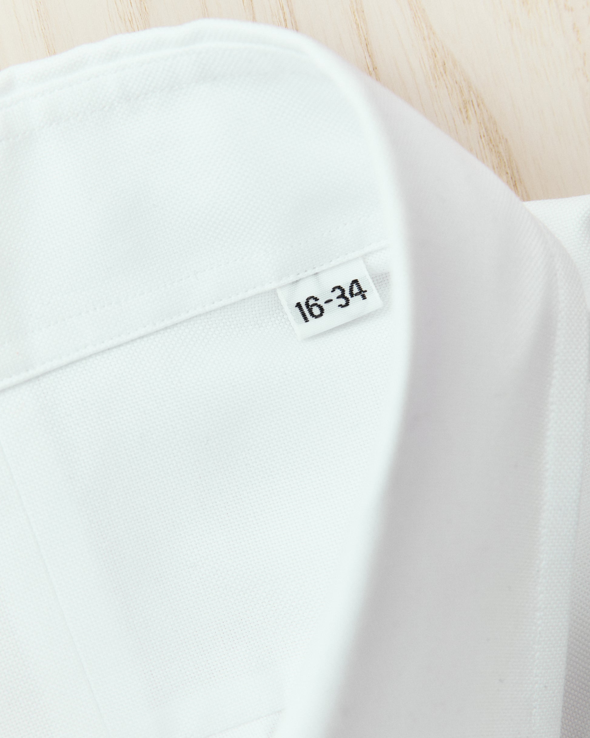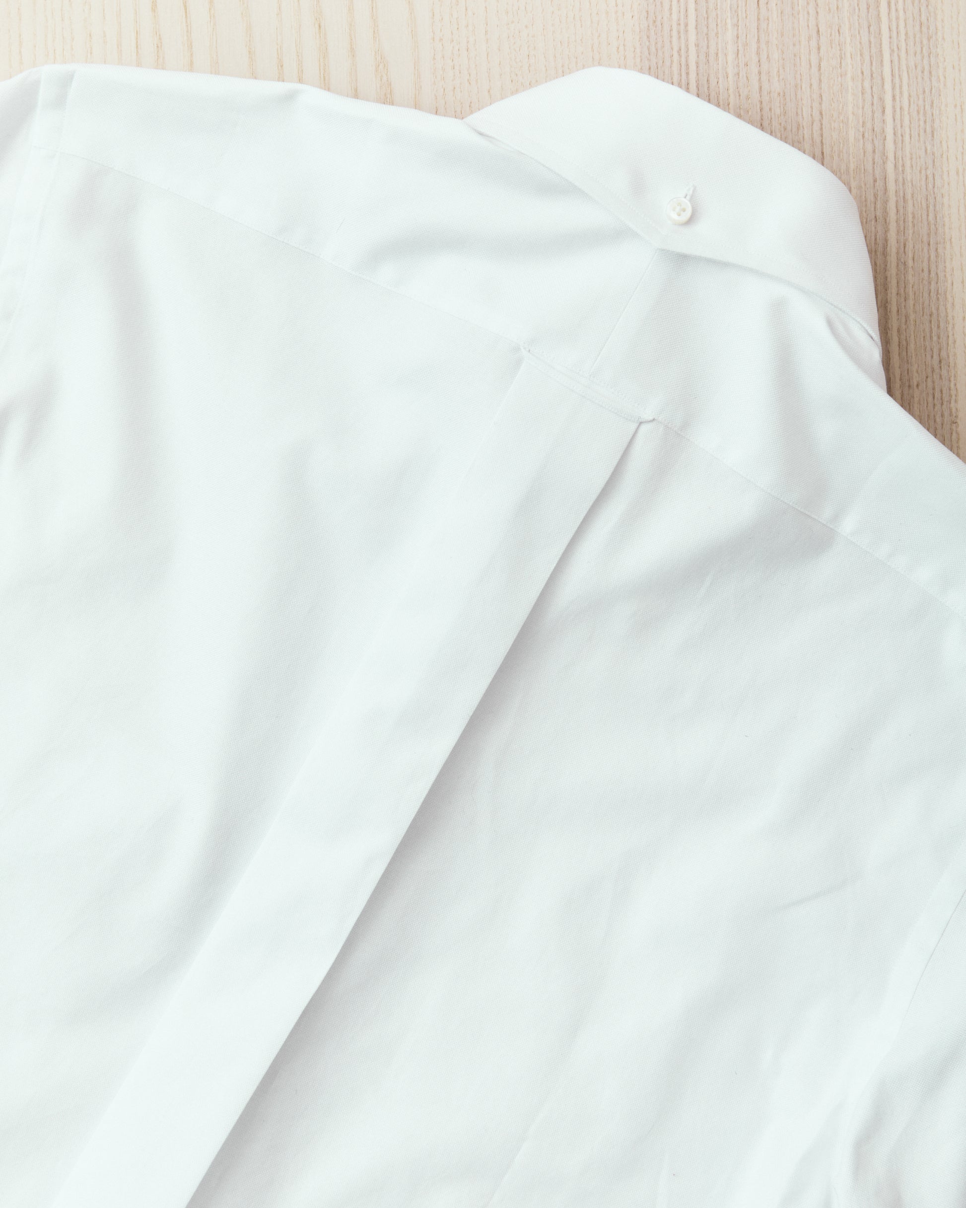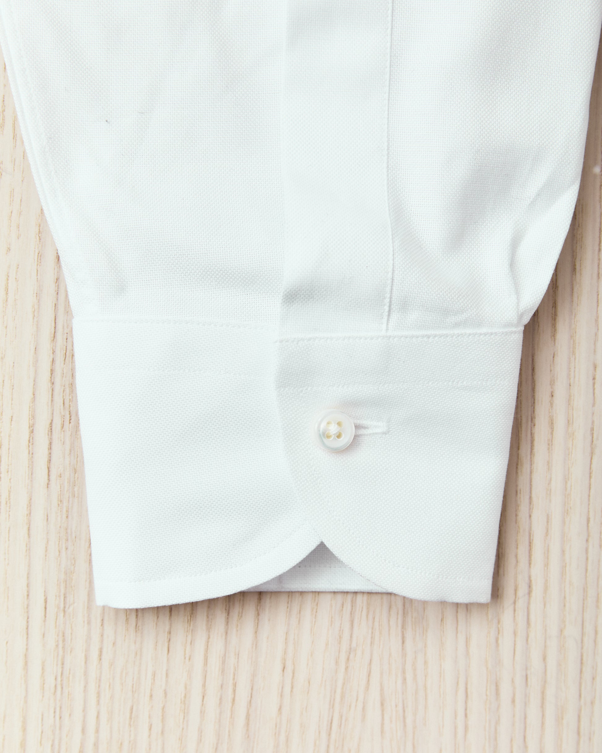 This is Bryceland's Perfect OCBD Shirt in white. It is part of their HK Label collection. This is the perfect workhorse shirt for the elegant person. It has a high rolling collar with a button in the back to keep everything in it's place. The back has a wider box pleat for added comfort in the back, it has a long tail with gussets so the shirt stays tucked with ease. The cuffs are round with a single button closure.