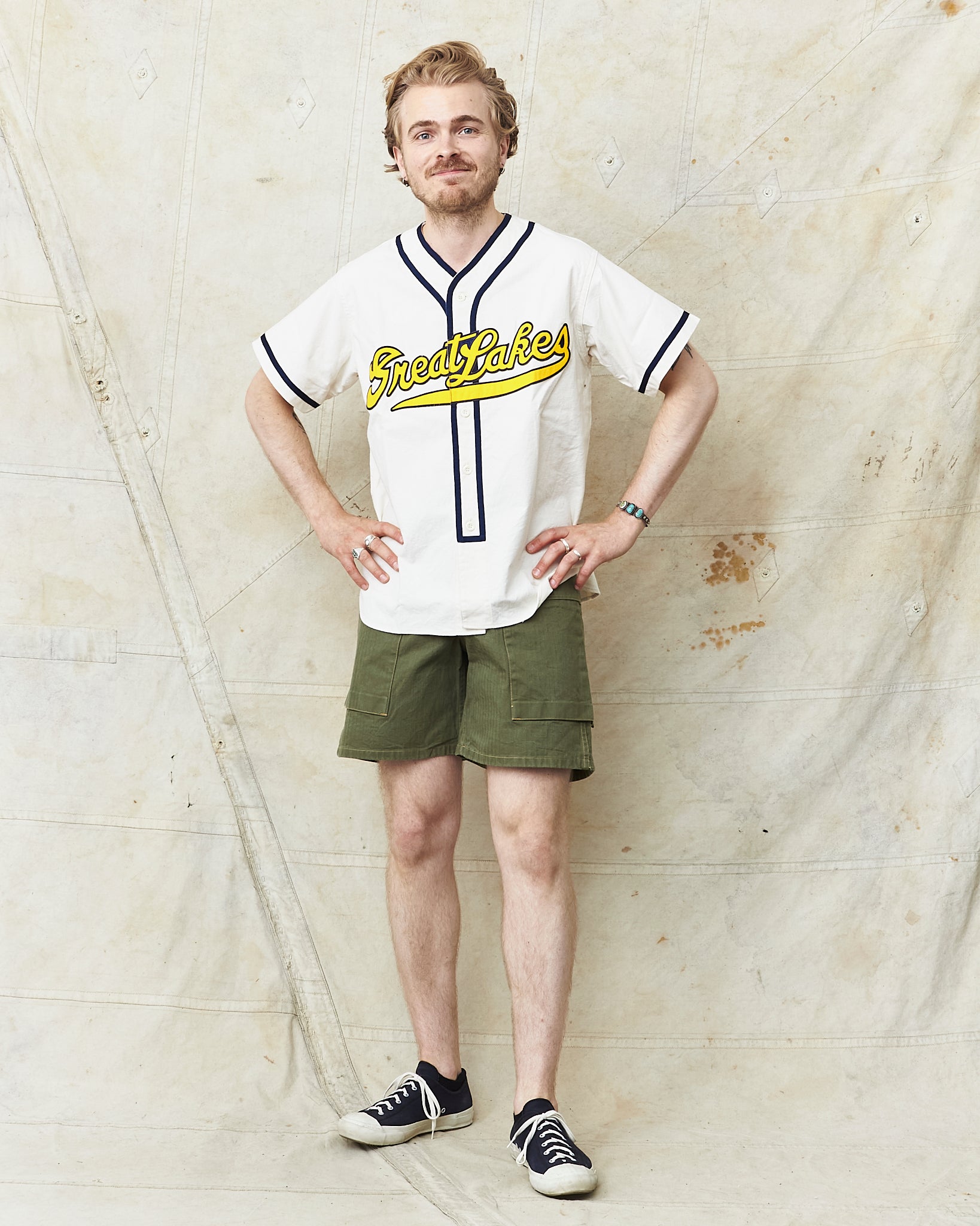 The Buzz Rickson's Baseball shirt is a reproduction of the 1940's Baseball Shirts that was used by both the US Marine Corps and the US Navy. During this time there where different teams from different parts within the army and they face each other within different sports. The name Great Lakes comes from a Naval Station at Great Lakes in Chicago, Illinois. This shirt is made out of a heavy 100% cotton fabric in an Off-white color. It has a felt logo on the chest and reinforcements in the armpits.