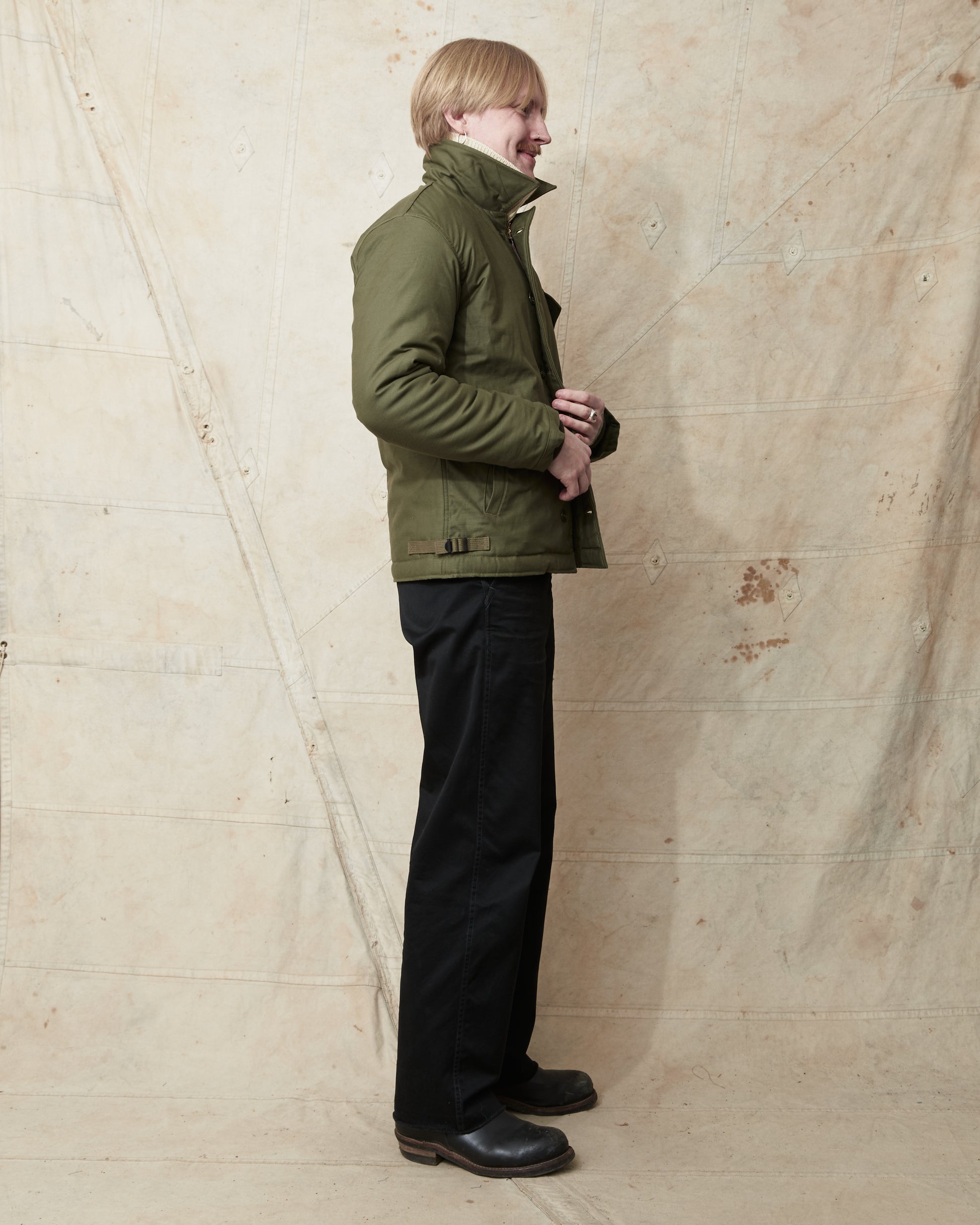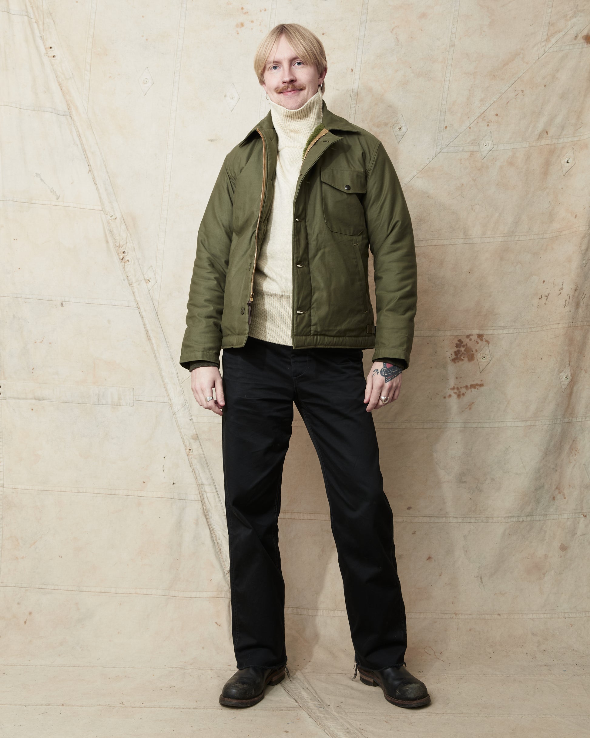 Rasmus is 183cm and is wearing size M. Combining the jacket with a pair of Buzz Rickson's William Gibson Chinos and a North Sea Clothing Submariner Sweater.