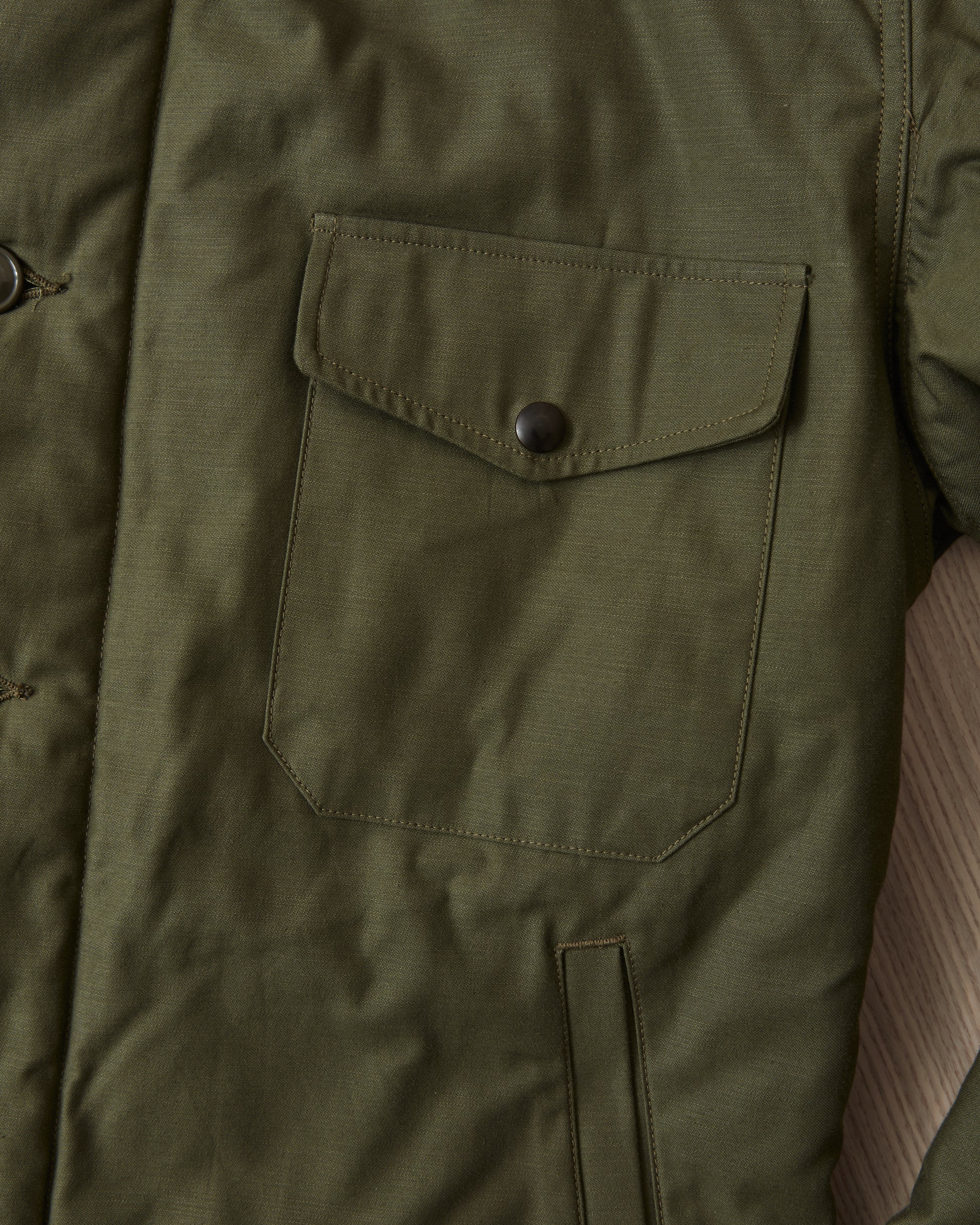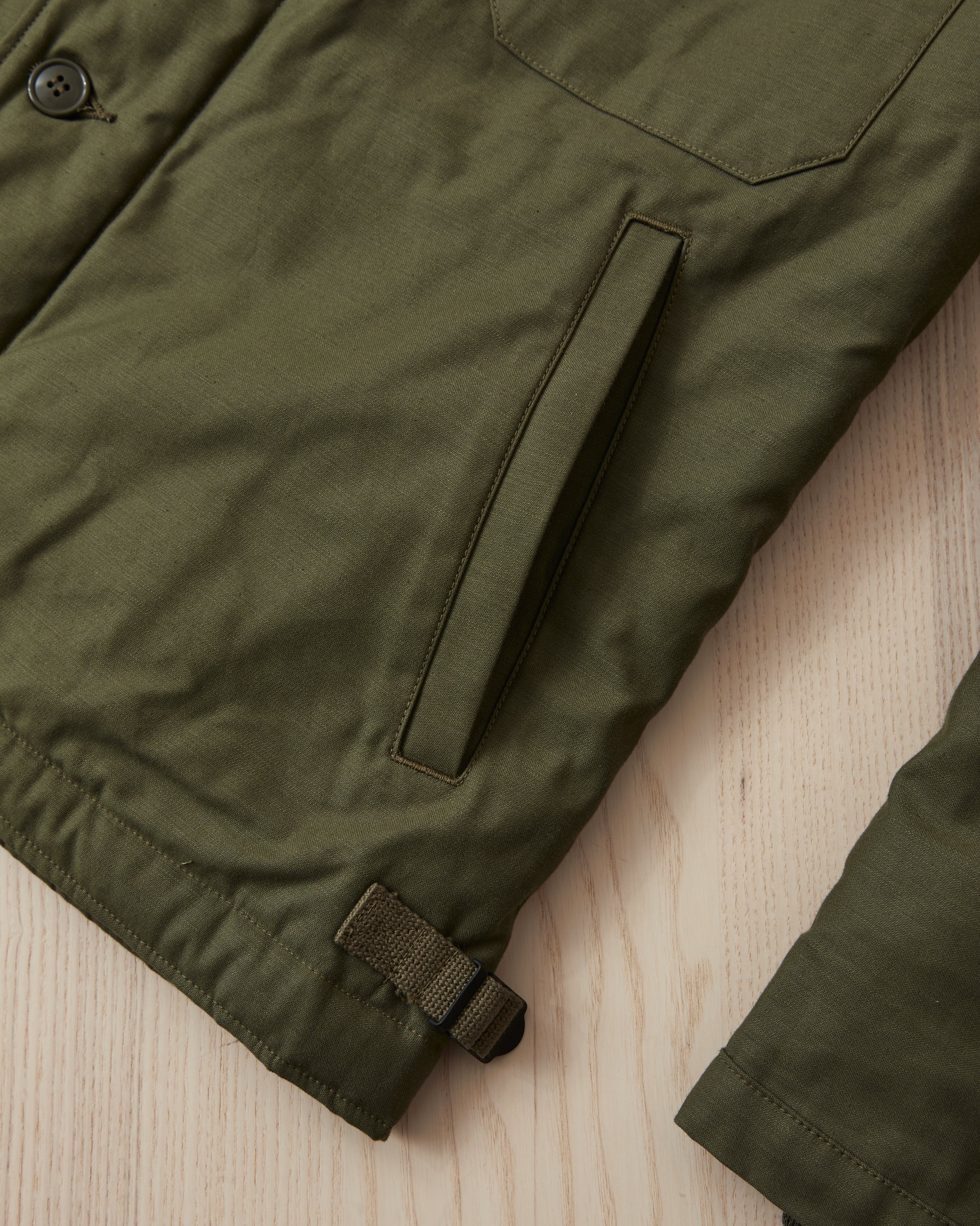 The A-2 deck jacket fetuers details such as buttons and zipper closure, rib-knitting "storm cuffs" inside the cuffs, breast pocket, two hand warmer pockets and hem adjusters. With it's simple look and well thought out details, the A-2 deck jacket is an icon today that has stand the test of time.