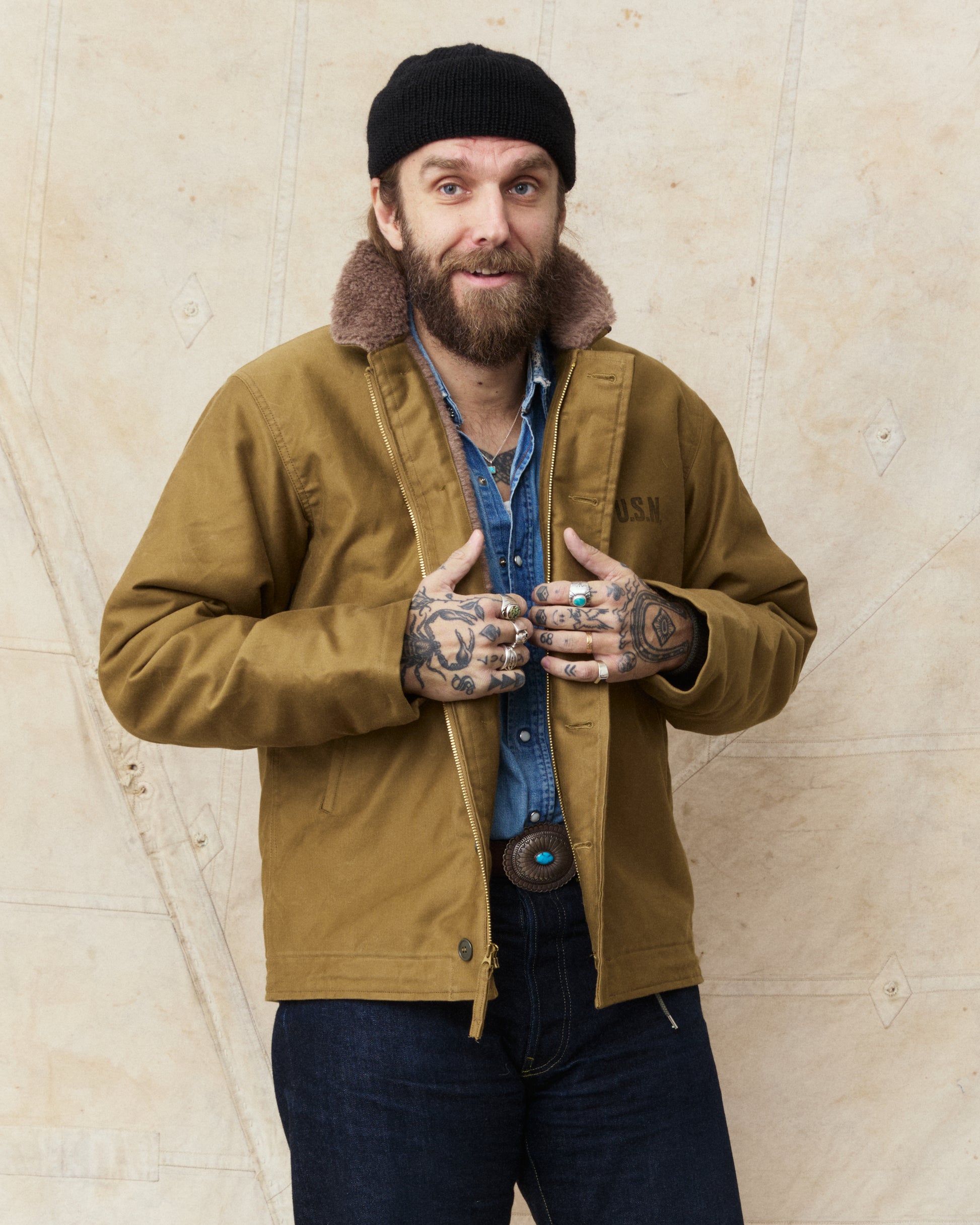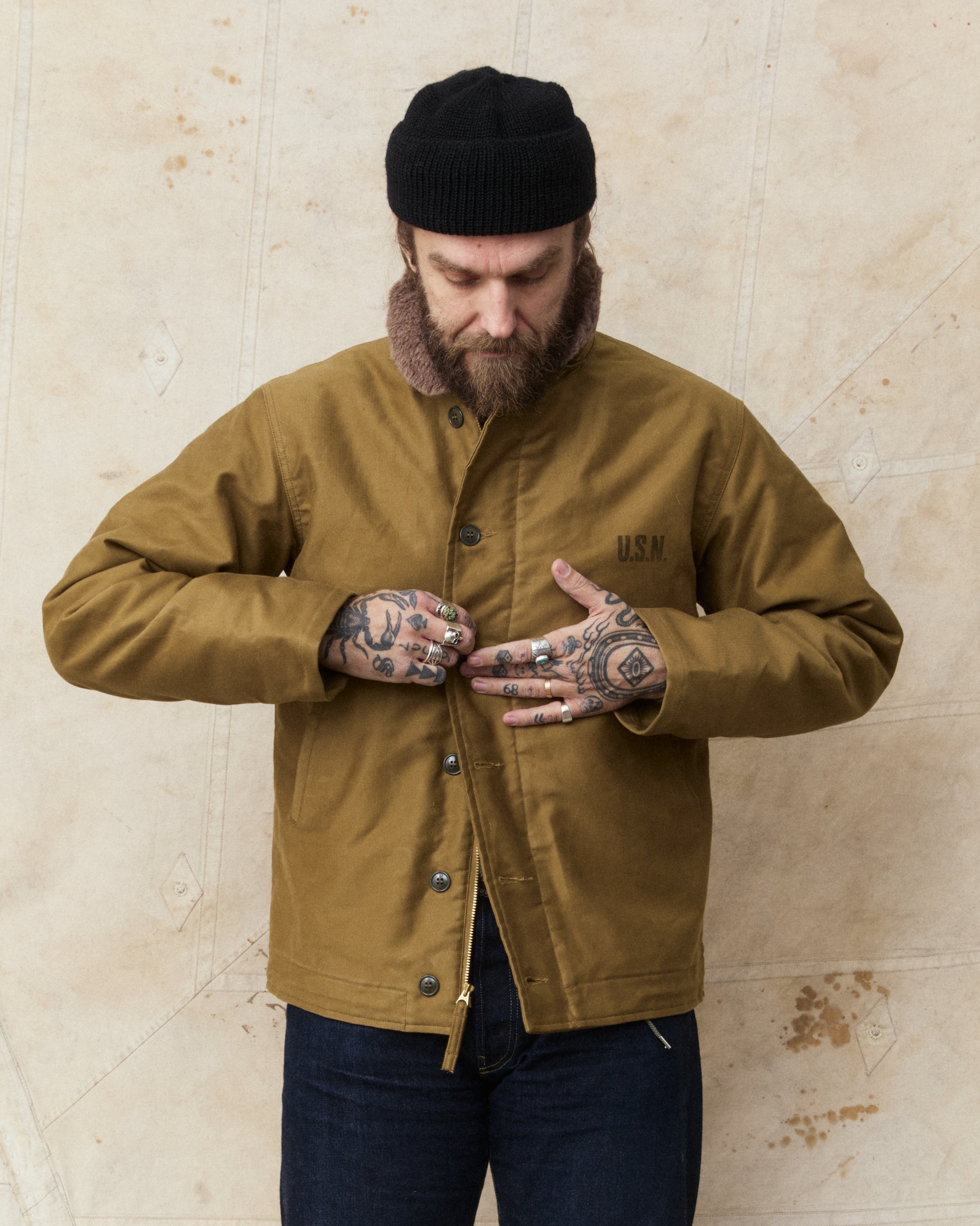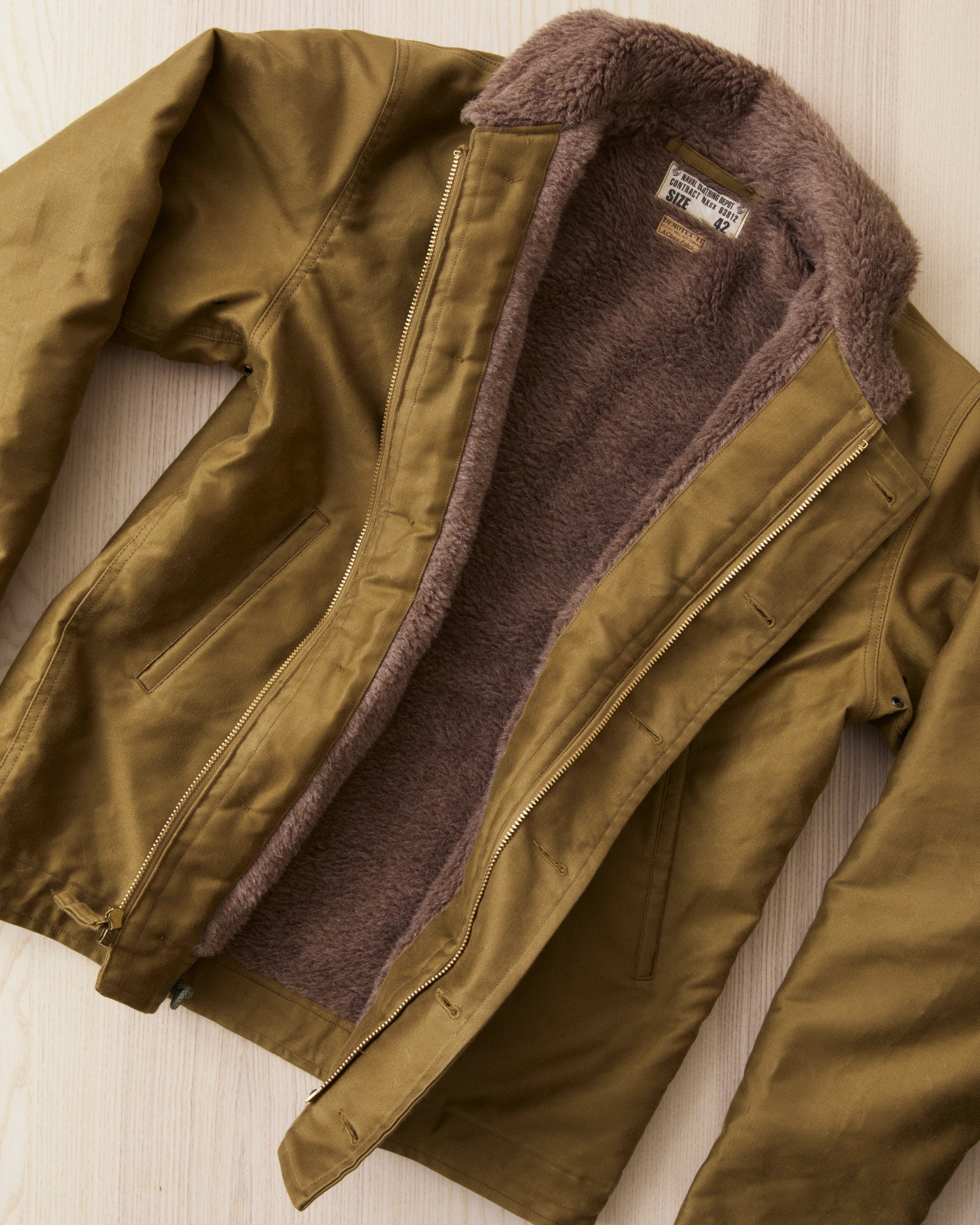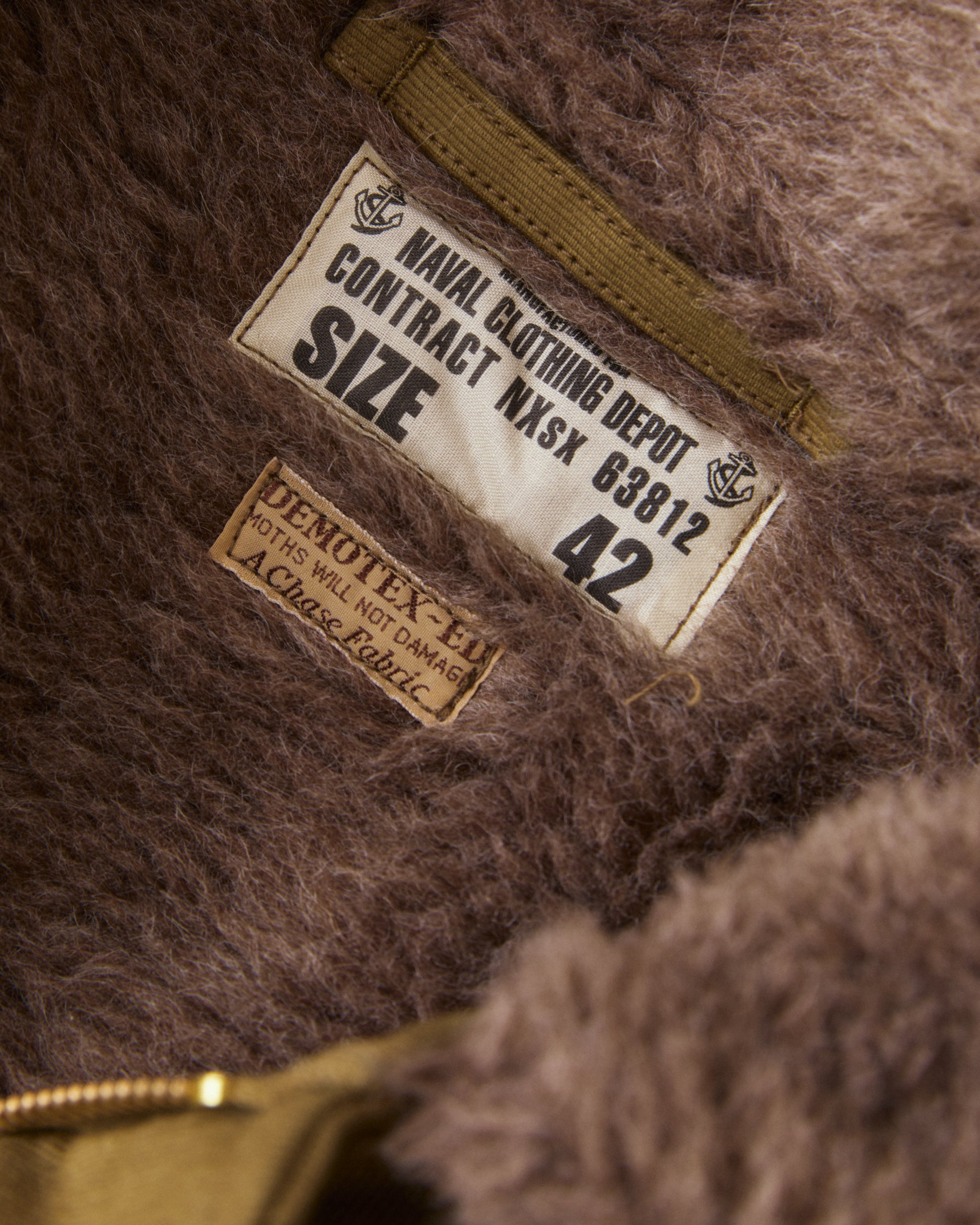 Furthermore, the jacket is also lined with alpaca fleece. Compared with the more commonly used wool fibers from sheep the alpaca fibre is warmer and more lightweight, and these two characteristics is the reason for the USN to use Alpaca as lining back in the 1940's.