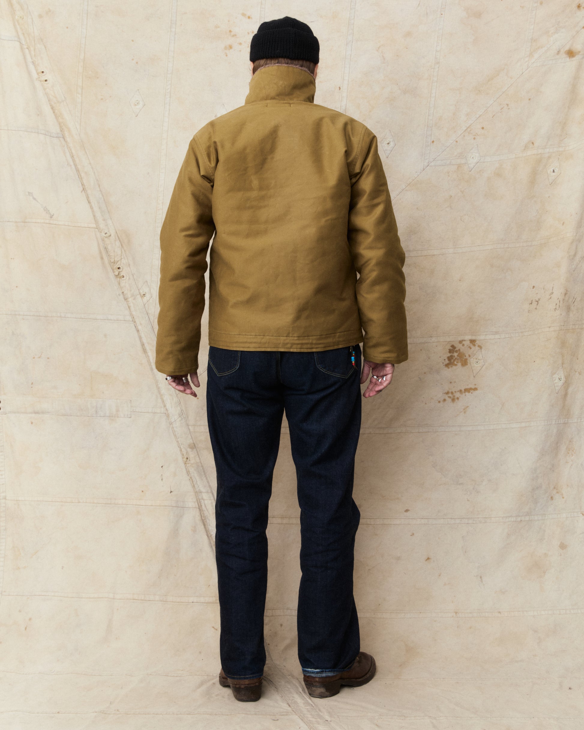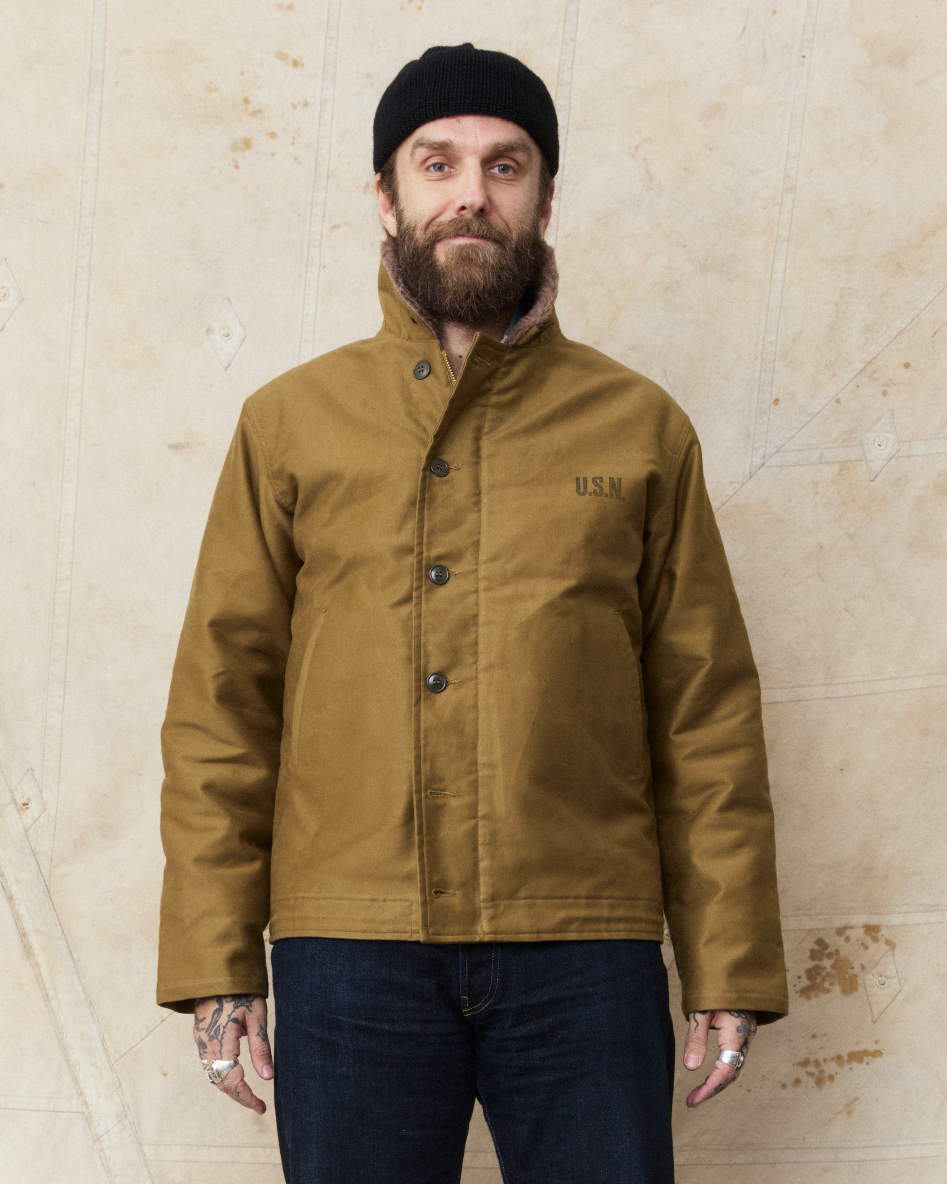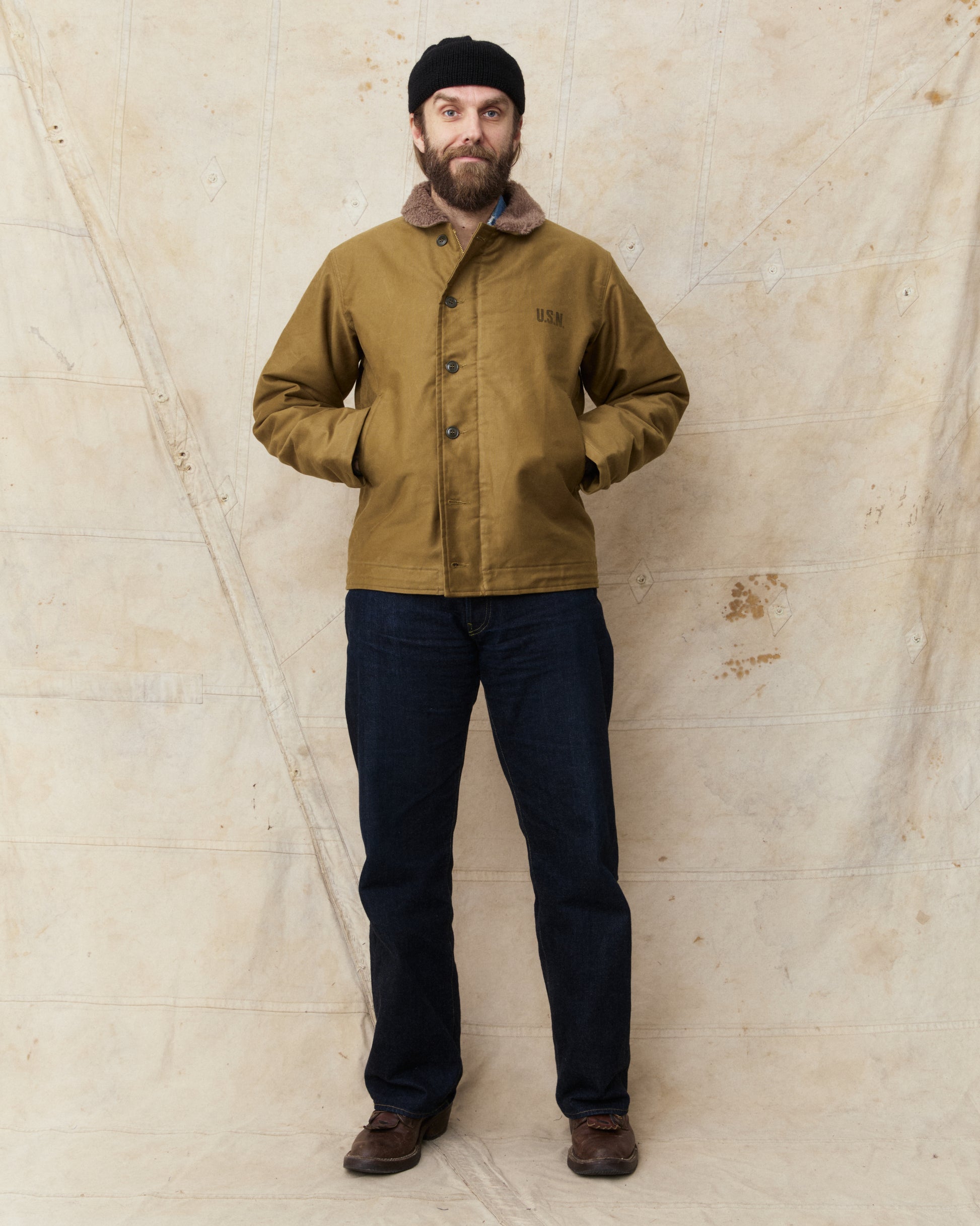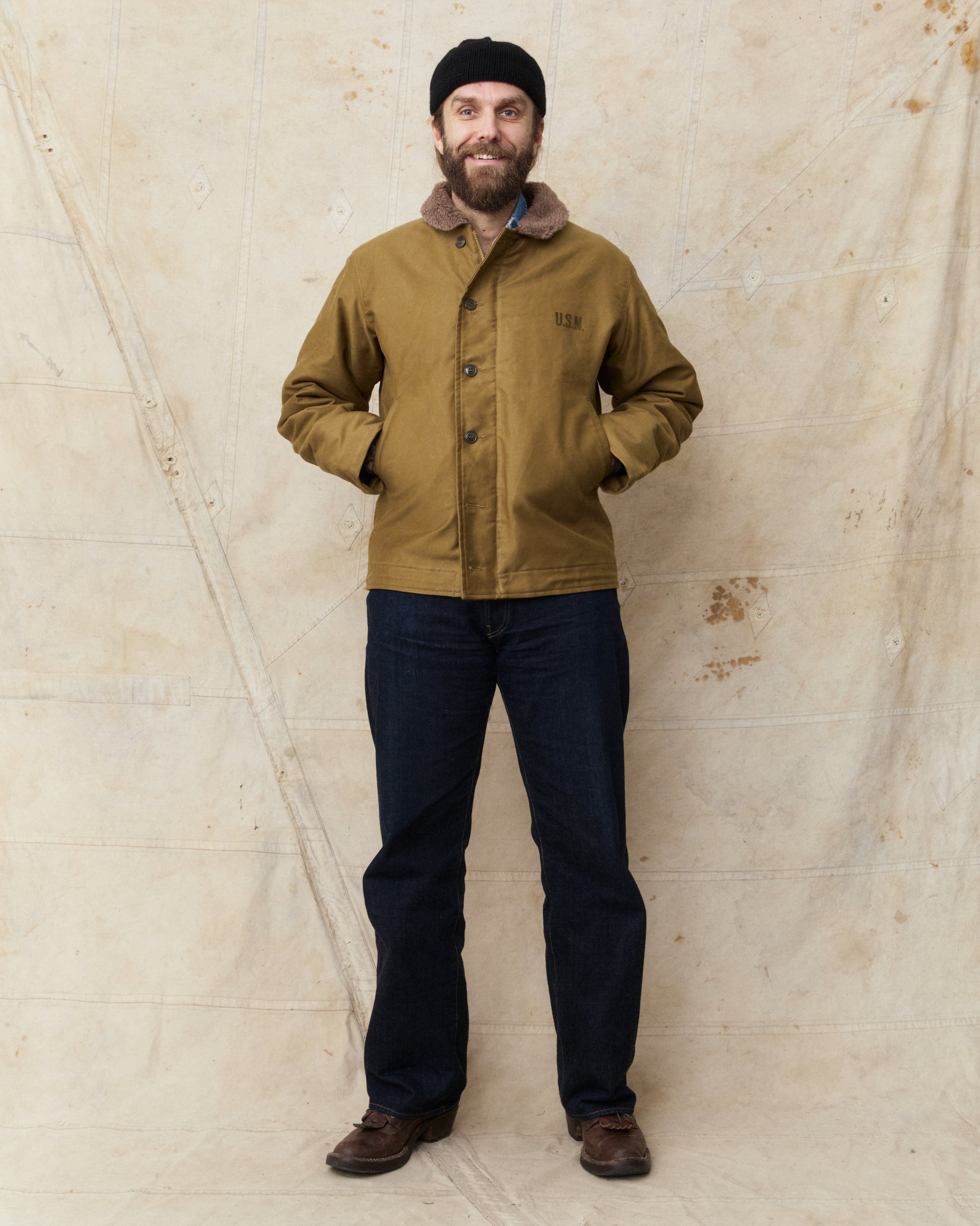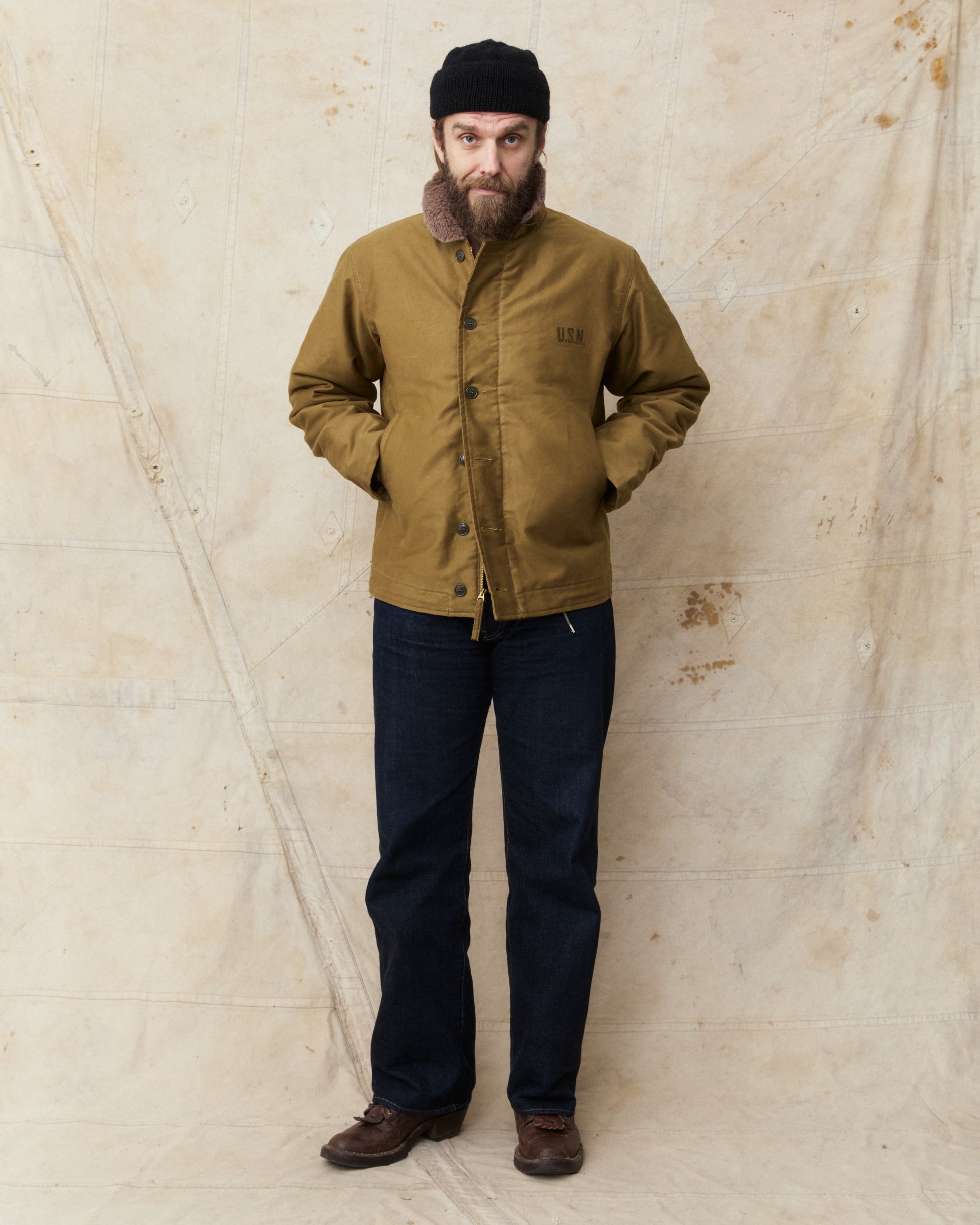 The classic N-1 deck jacket was first issued in 1943 as the new protective jacket to be worn by the US Navy, designed to withstand the cold and harsh weather at sea. The jacket is made of a thick cotton grosgrain weave, also known as "Jungle cloth", and this fabric is known for it's durability and for keeping the wearer warm and dry in cold weather weather.