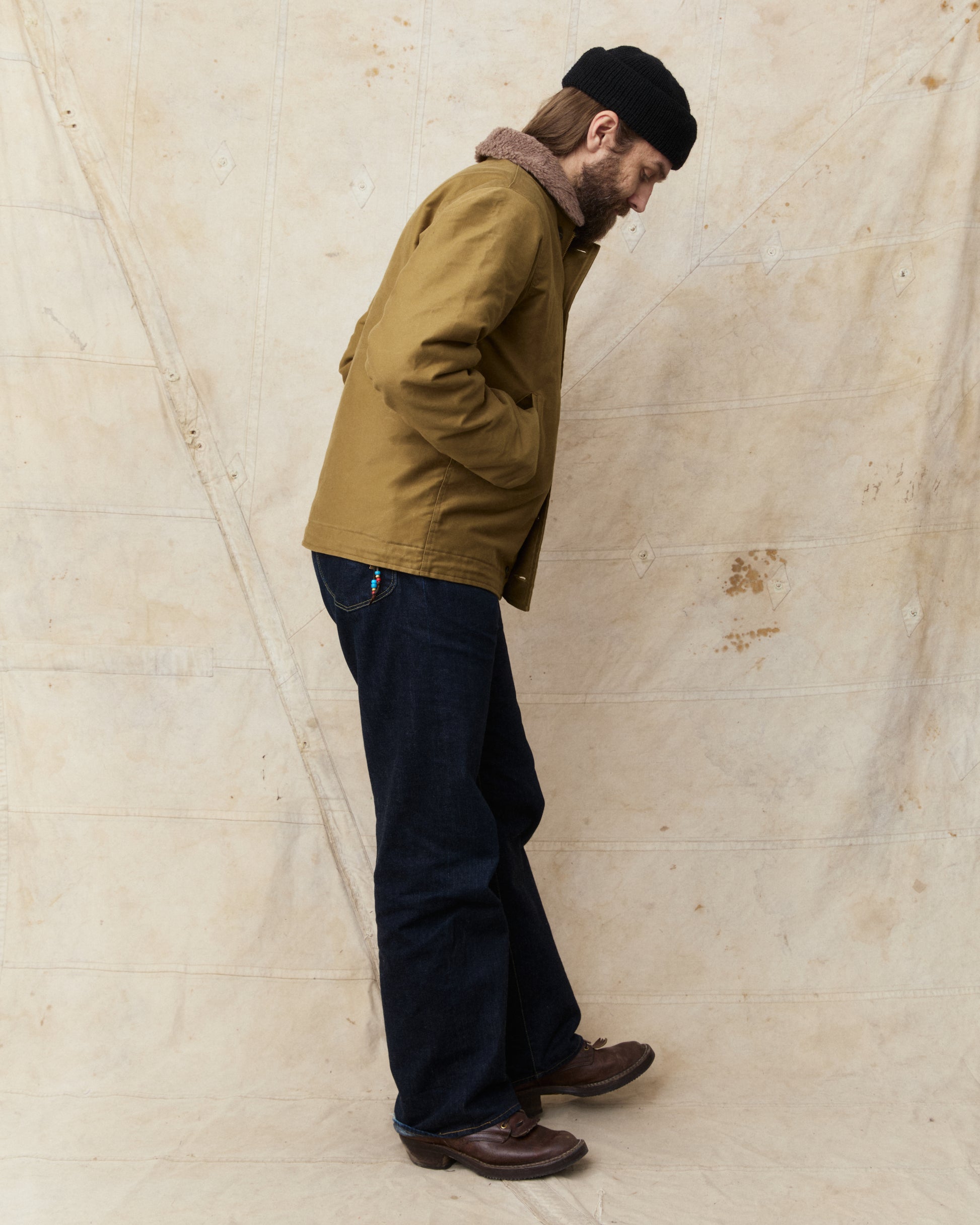Dan is 183 cm tall, weigh kilos 85 and wears a size 42. Combining the jacket with a pair of Indigofera Duke Jeans, and a Heimat Mechanics Wool Hat.