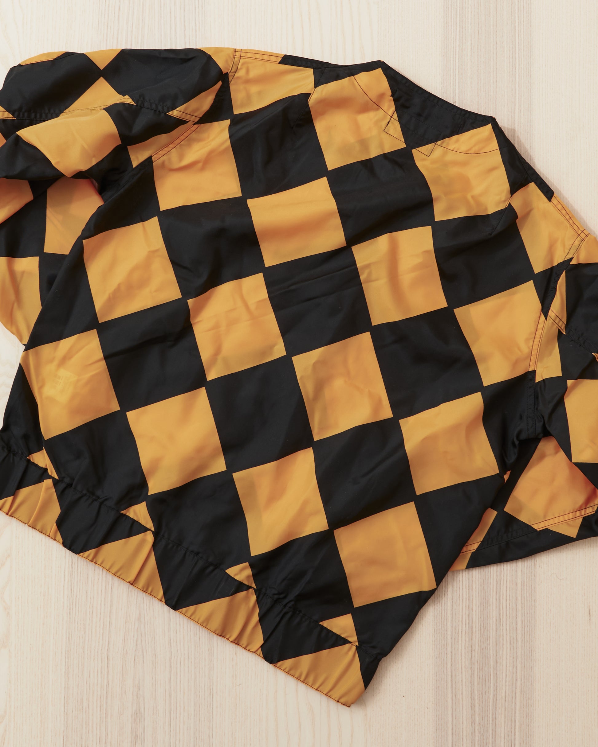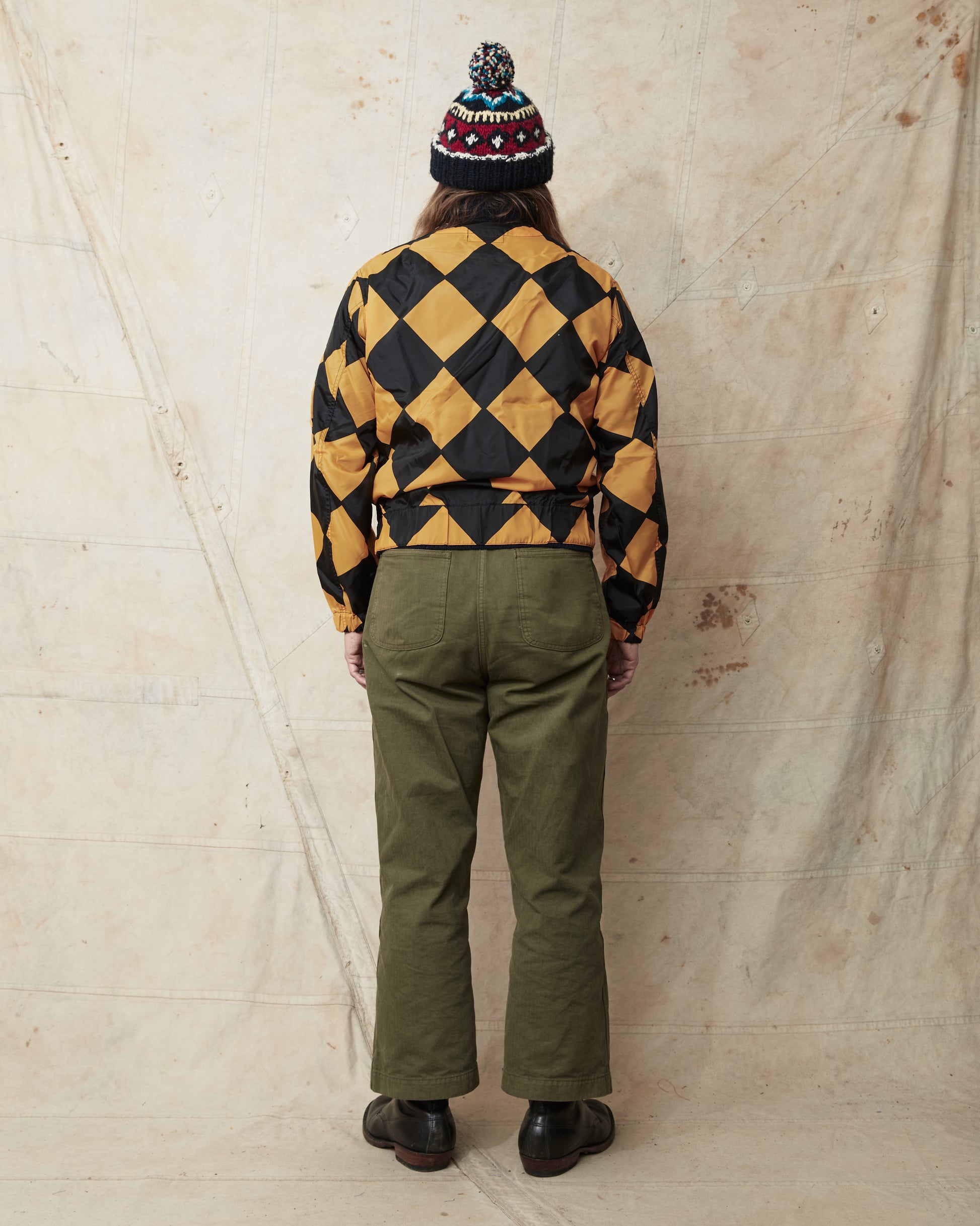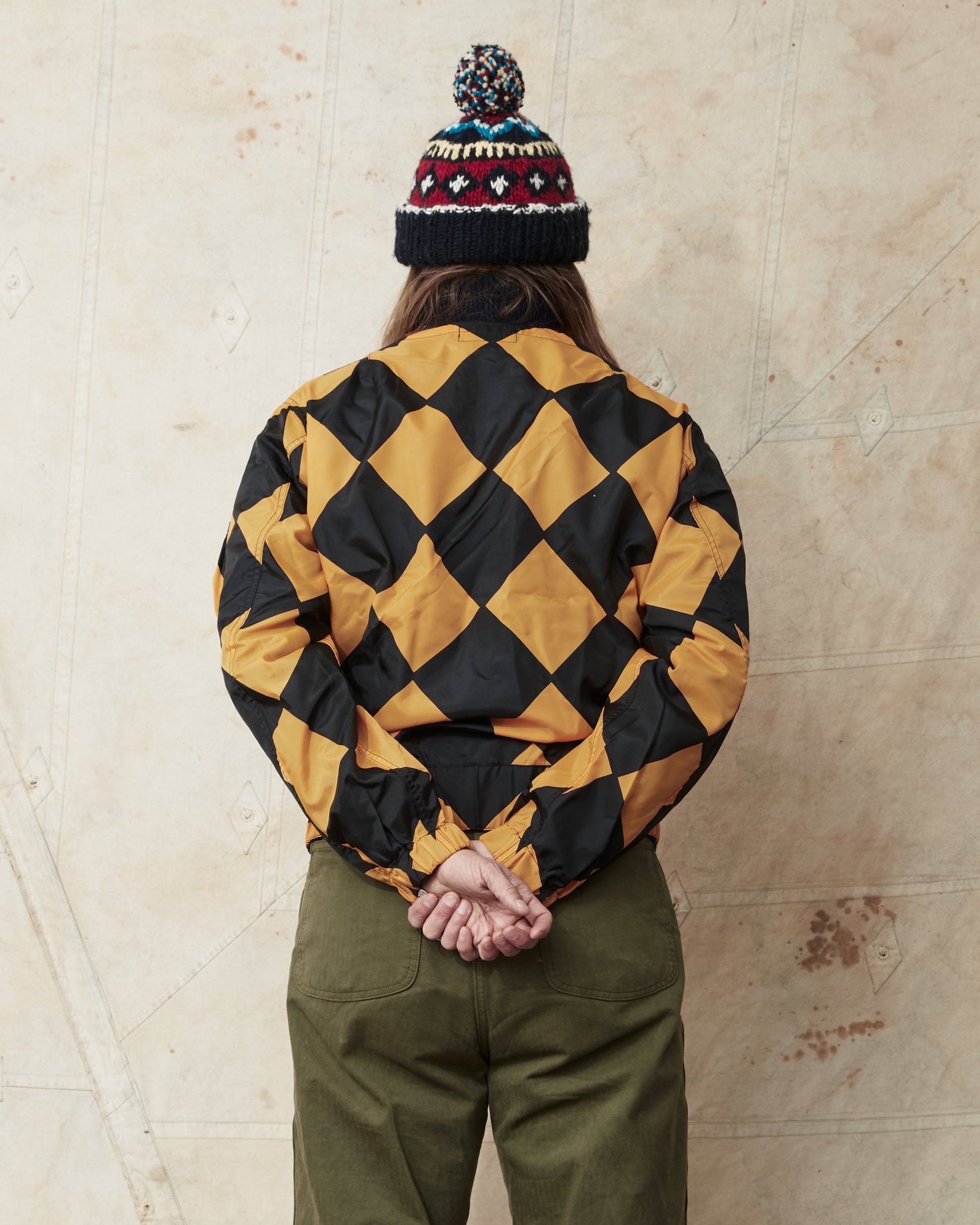This jacket, featuring a flashy print unparalleled in the history of military clothing, was adopted by the U.S. Air Force in the early 1950s for line crewmen. Line crewmen's job was to guide fighter planes to their desired stopping positions on the ground, day or night. To ensure their own safety on the dangerous base apron, they needed to be visible to the pilots flying their planes. When this jacket was first issued, it came with a warning tag that read, "Do not wear while servicing aircraft," in order to prevent them from misguiding fighter planes. This shows just how powerful this jacket was.