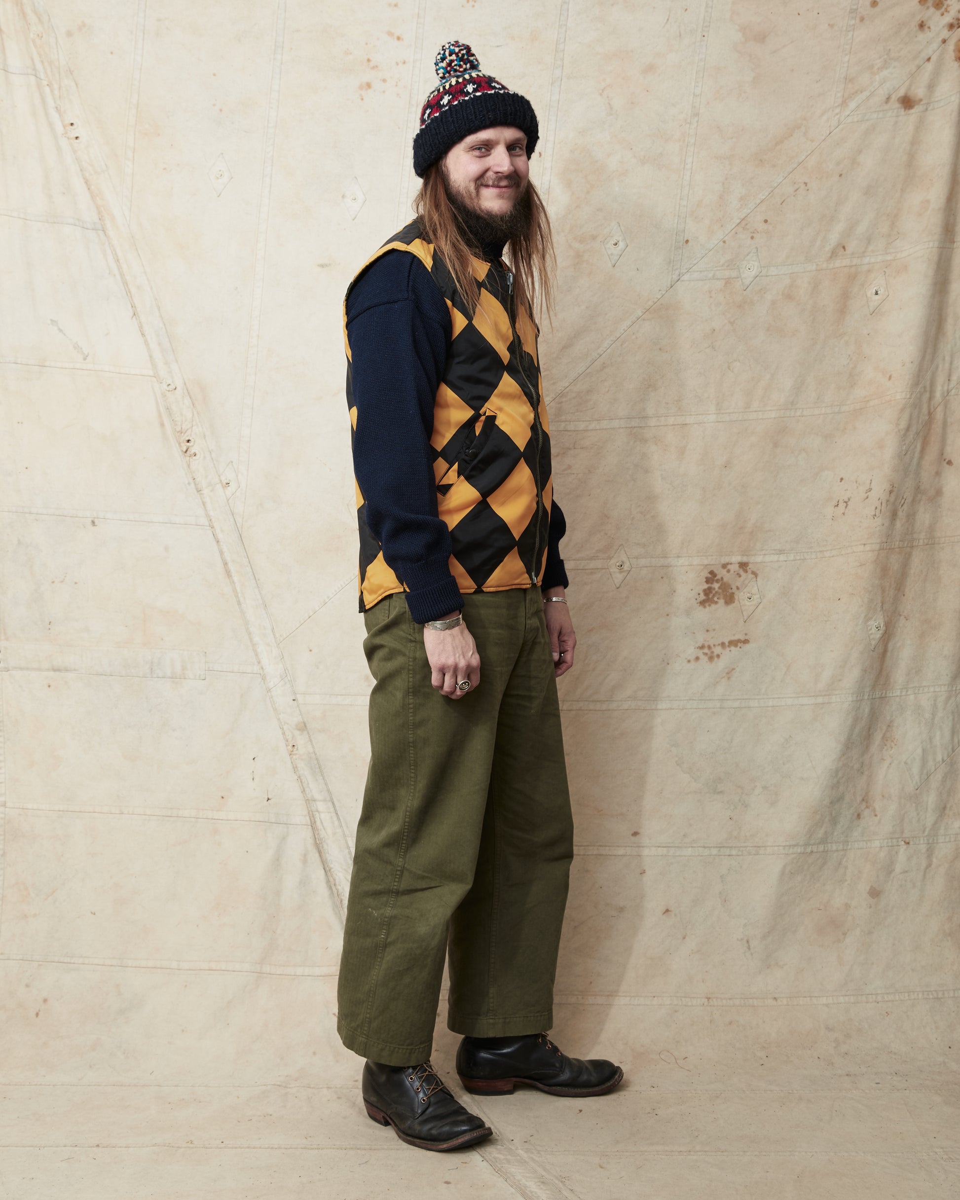 Douglas is 180 cm long with a weigh of 85 kilos and wears a size L. Combining the vest with a pair of Orslow Herringbone Trousers, White's Semi Dress boots and a North Sea Clothing Submariner Sweater.