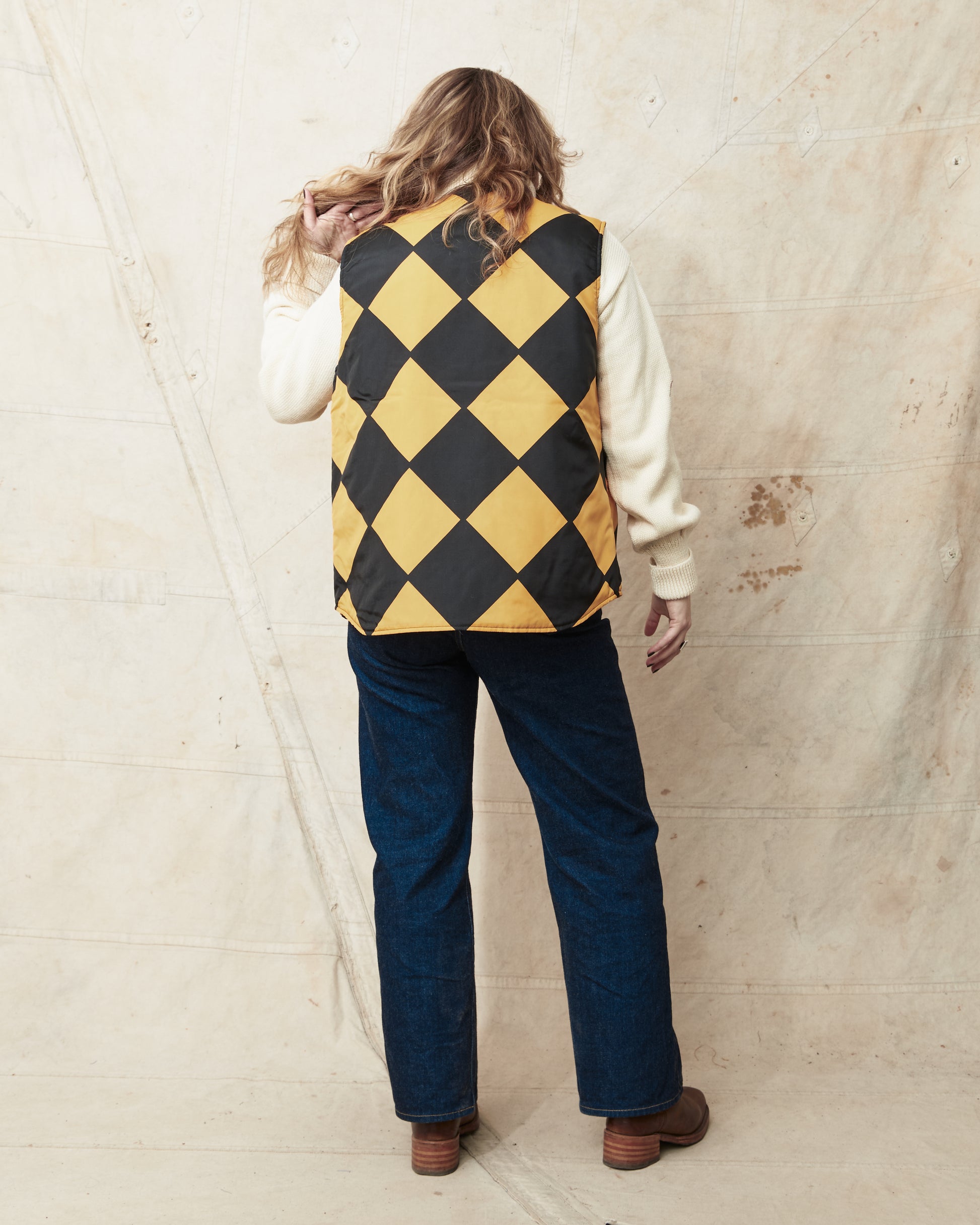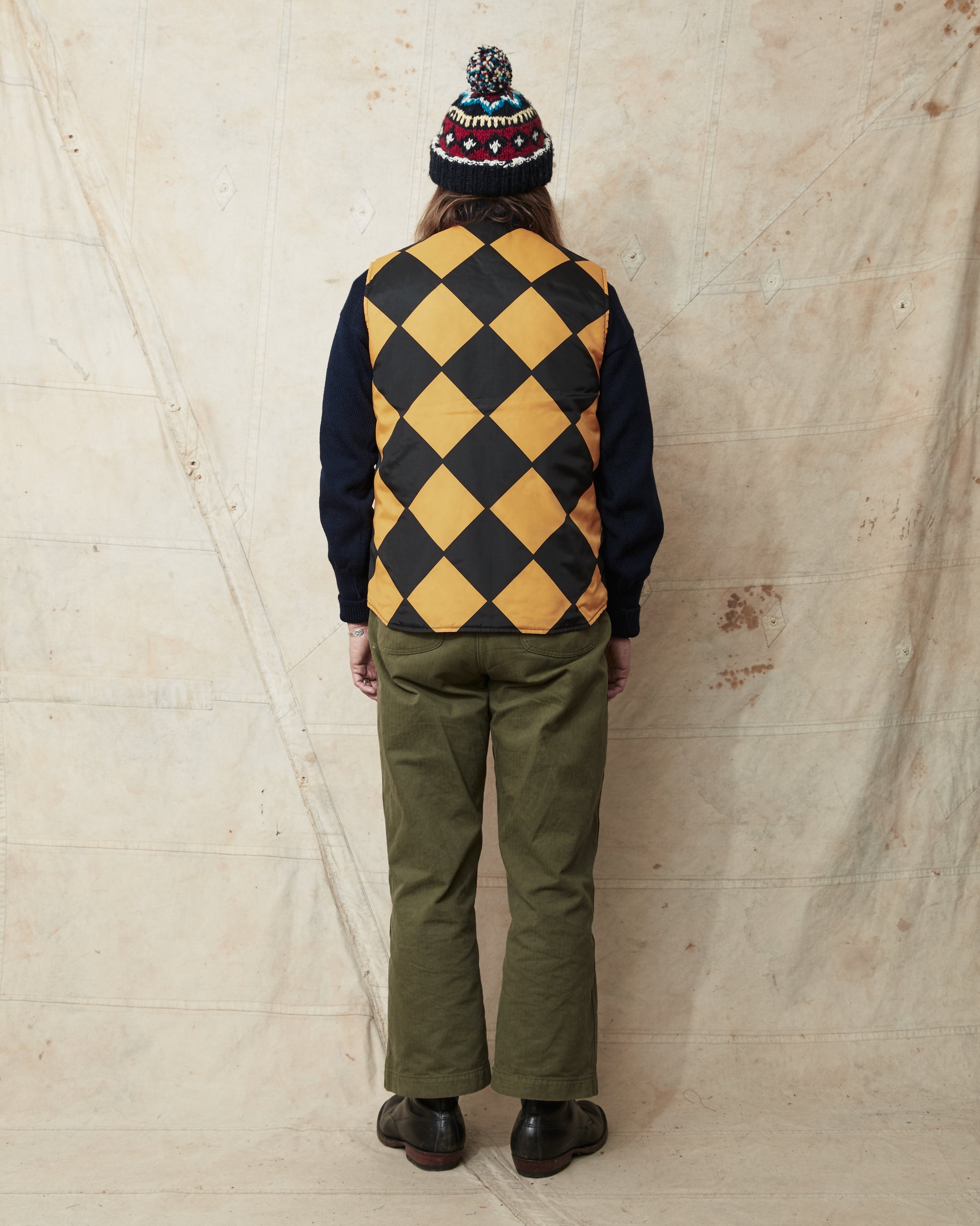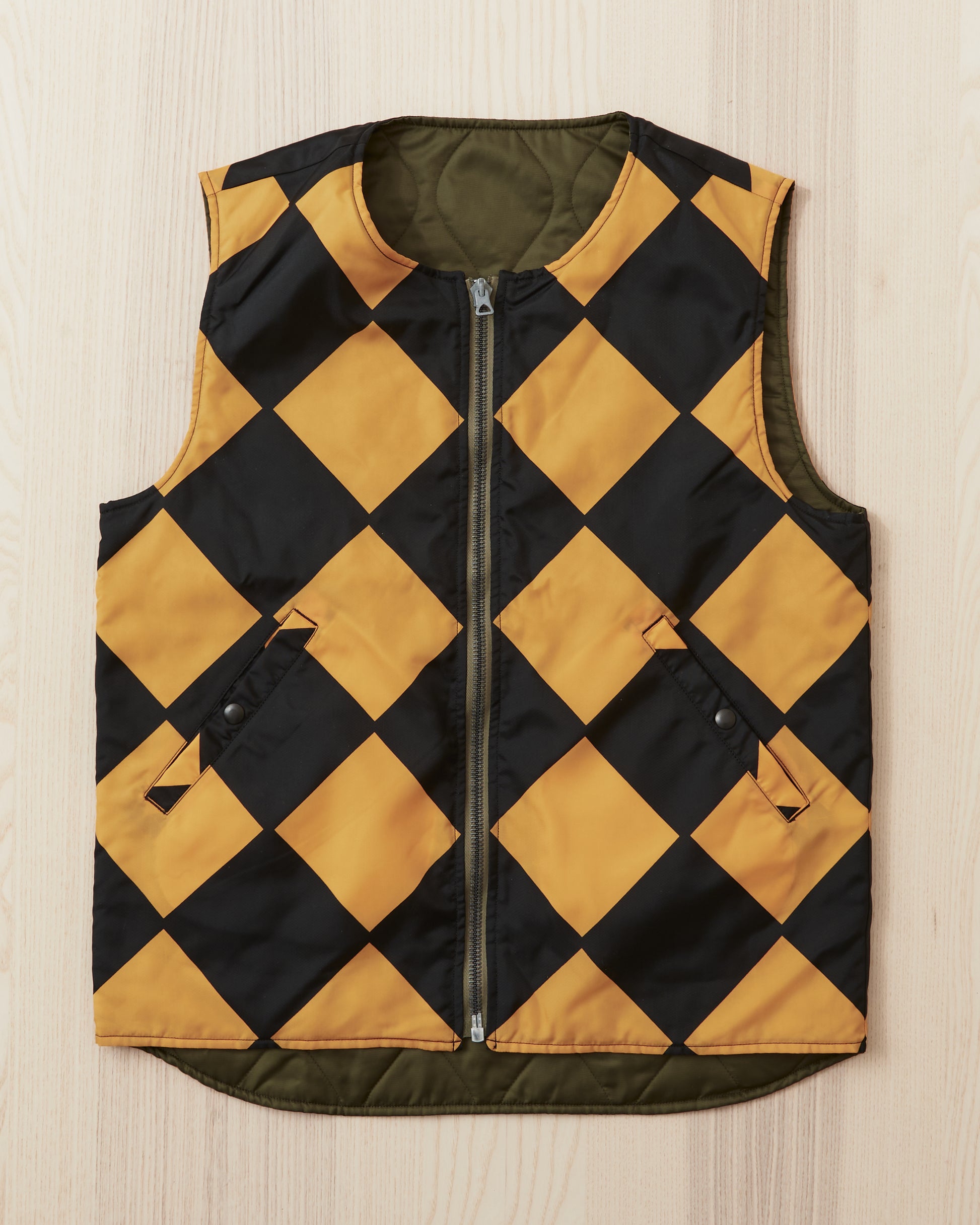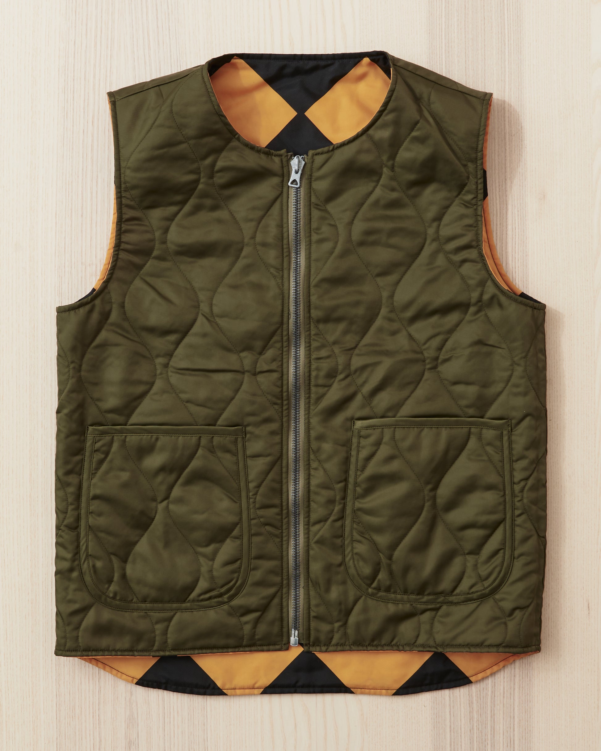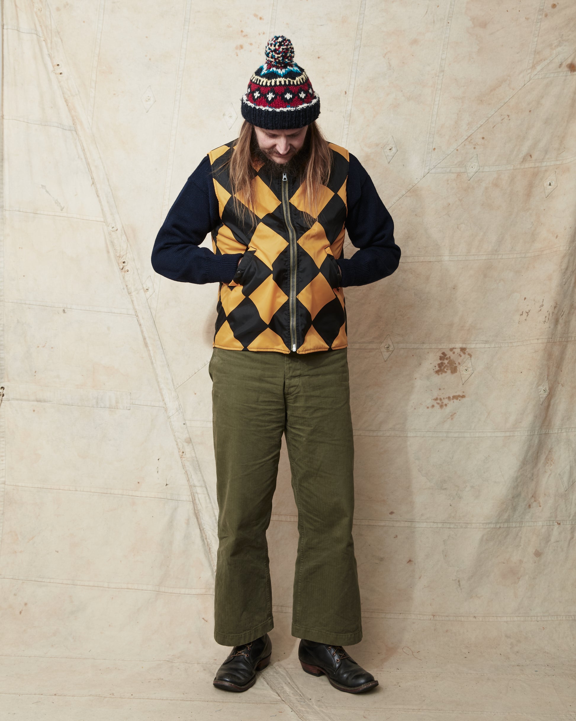 This vest is an original Buzz Rickson’s design using line crewman fabric, made reversible for dual use. The diamond-patterned side includes hand-warmer pockets, while the olive side has patch pockets, ensuring functionality. The zipper is a size 10 reversible zipper by Coats & Clarks, sized for easy gripping even with gloves. The vest can be layered over jackets or under field jackets to add a stylish and functional layer during cold weather.