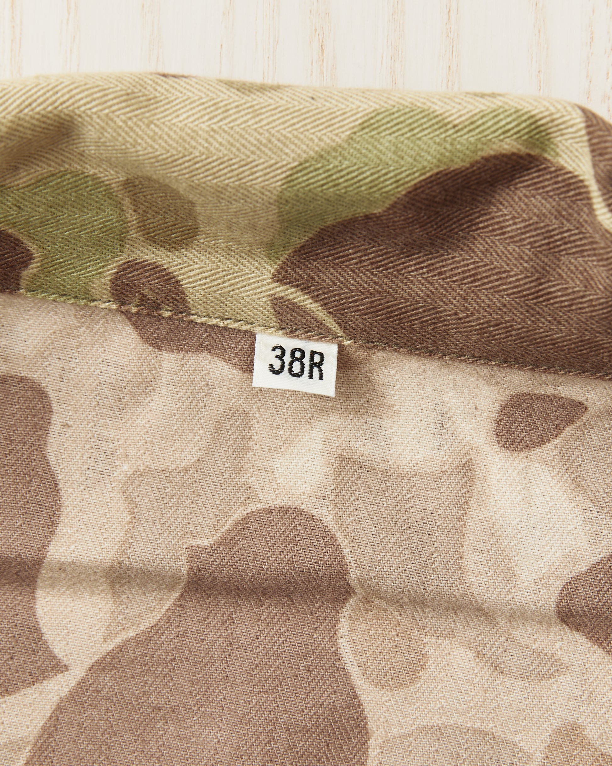 The P-42, also known as the "Frogskin" jacket was issued to the US Marine Corp during WWII, with the unique camo pattern developed for a jungle type environment. The camouflage was designed to be multi functional and could be worn reversed with the so called "Beach" side out, which is in the same pattern but in sandy brown color.