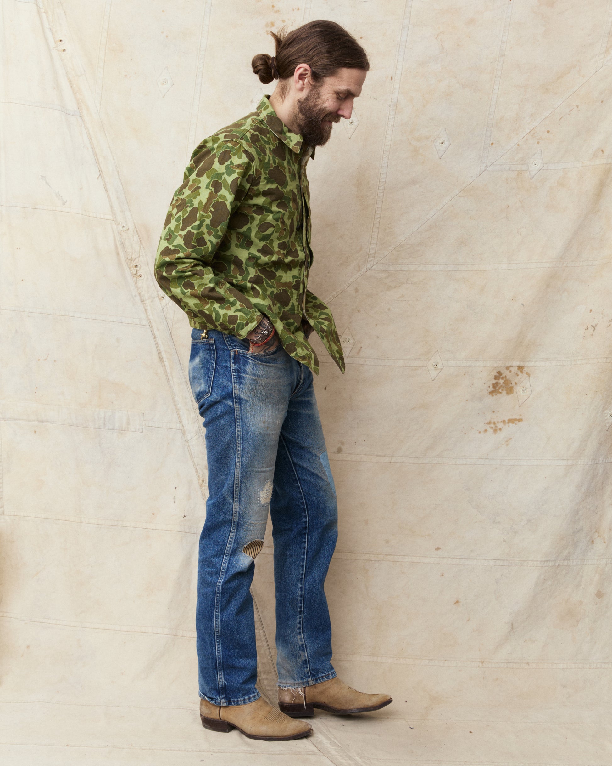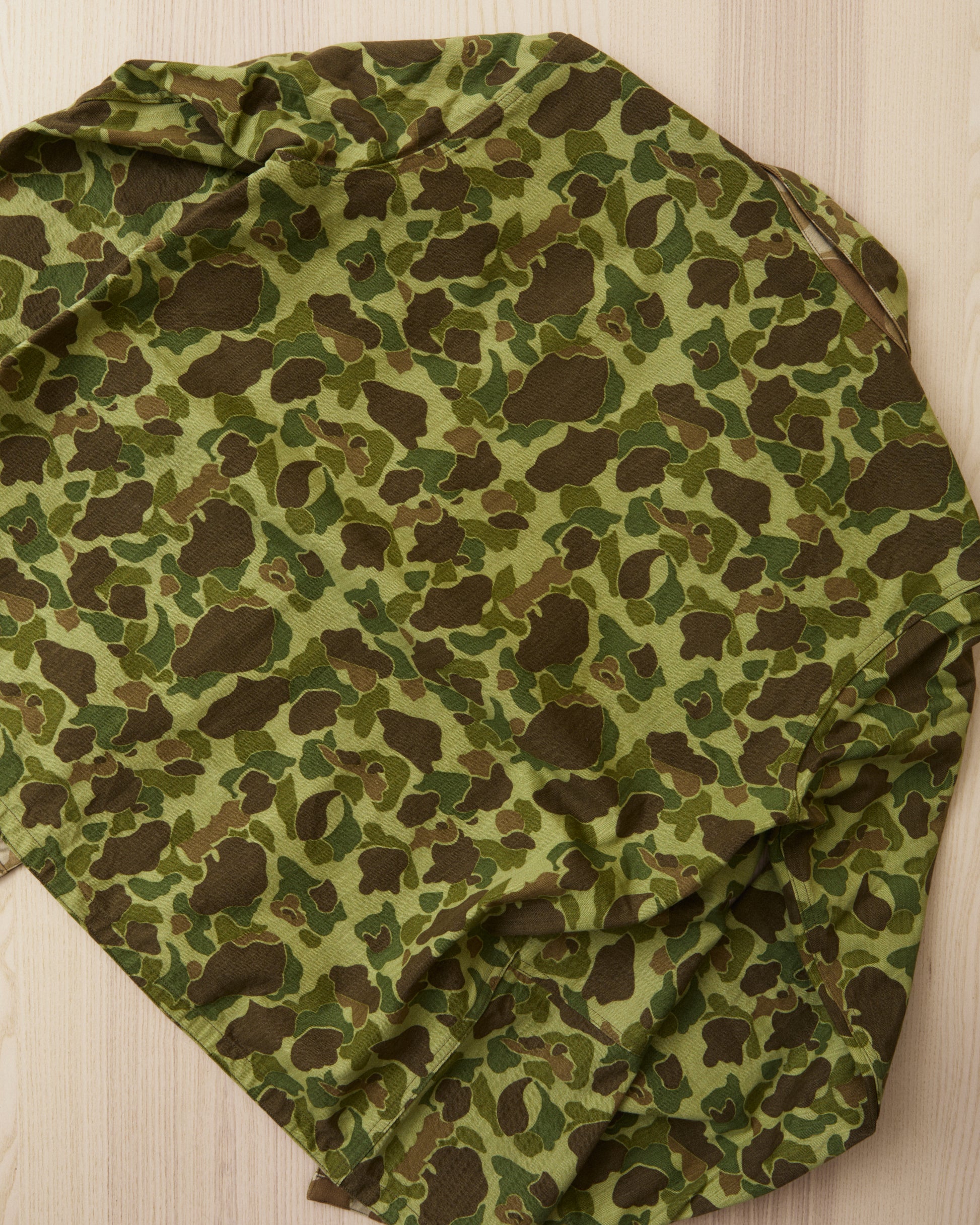 A utility coat with a camouflage pattern adopted by the U.S. Marine Corps in 1944. Commonly known as P44 and M44, "P" comes from the year the pattern was established and "M" comes from the year the model was adopted. The green woodland surface and the beige desert surface and print are printed on both sides of the eye-filled herringbone twill, and it can be worn reversibly with trousers. On both chests of the green side, there are large-capacity pockets from the shoulders to the chest, and it is fastened with a snap button that makes it easy to store and take out. The sleeves are made in one piece, and the sleeves can be adjusted with two iron buttons.
