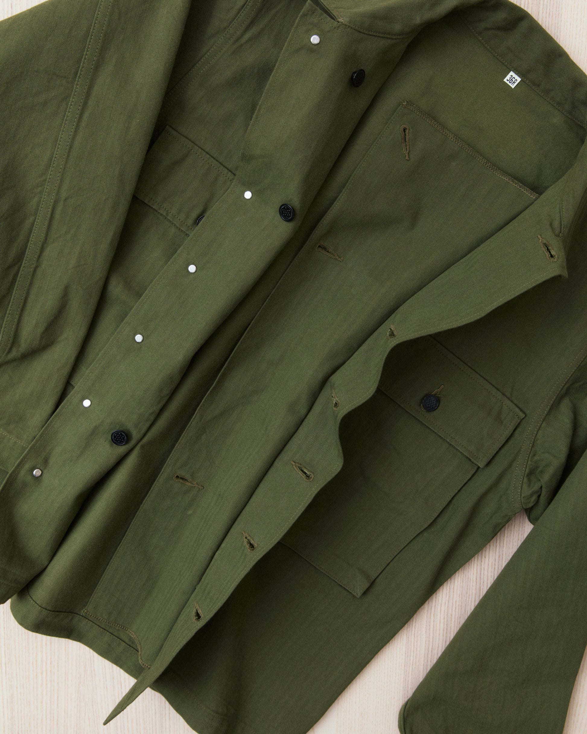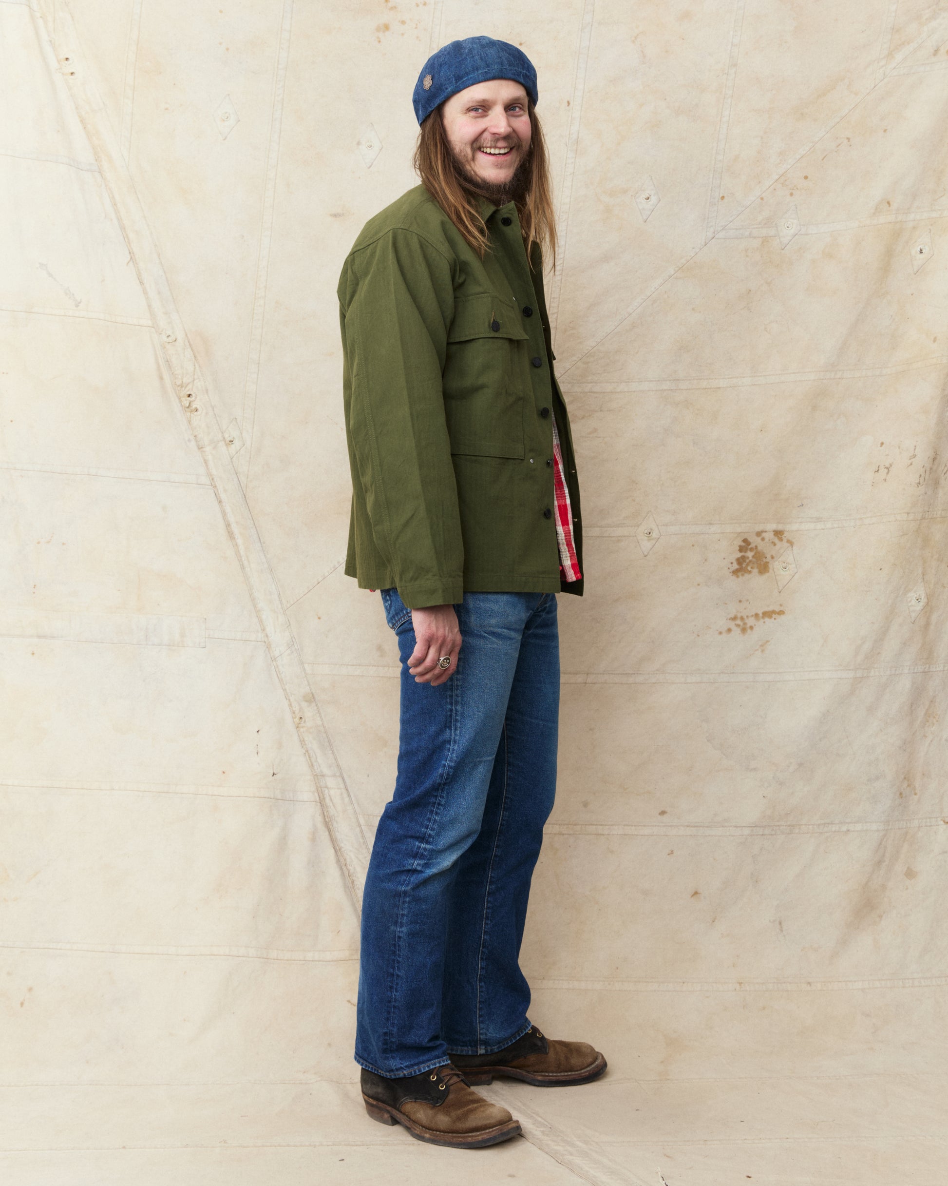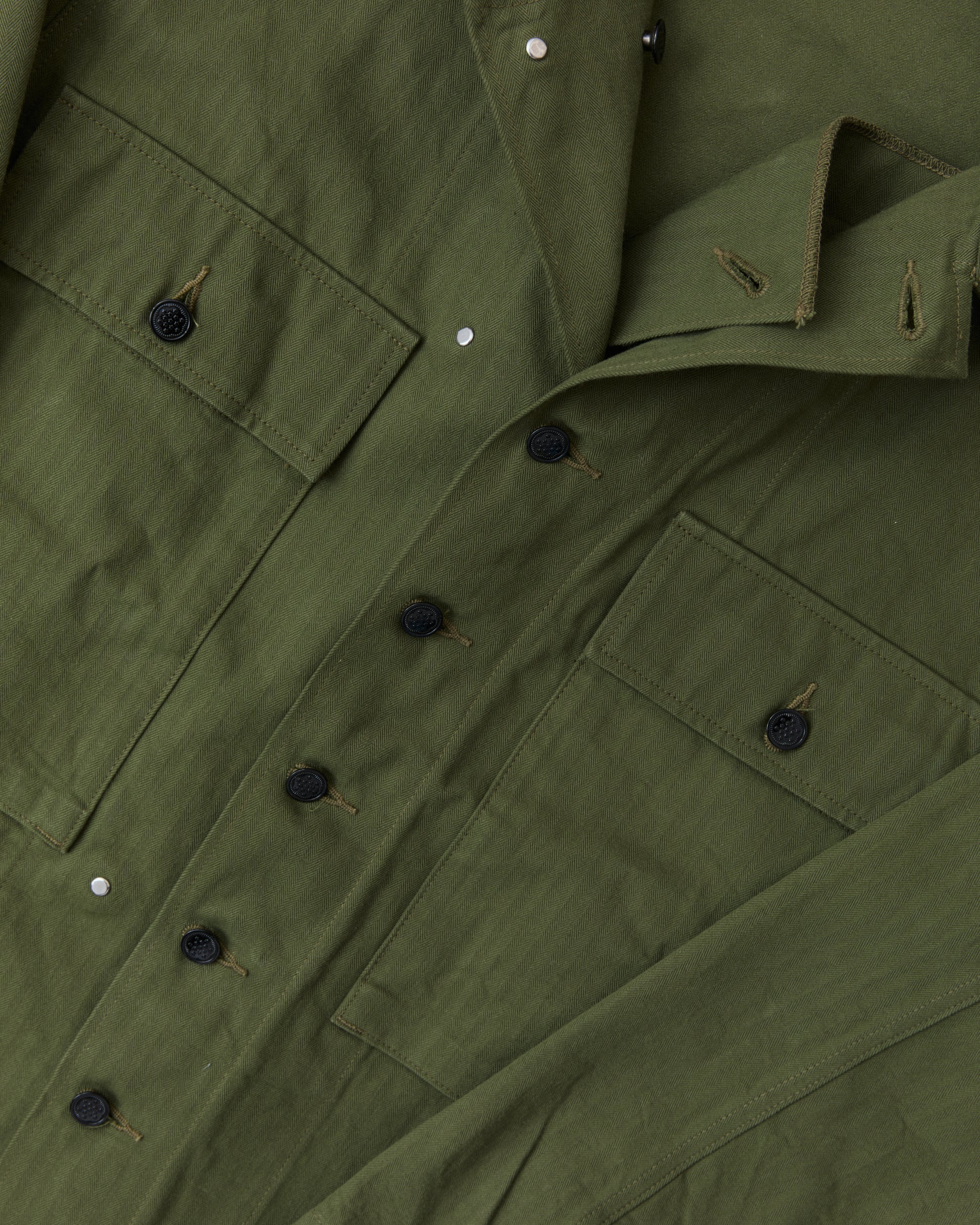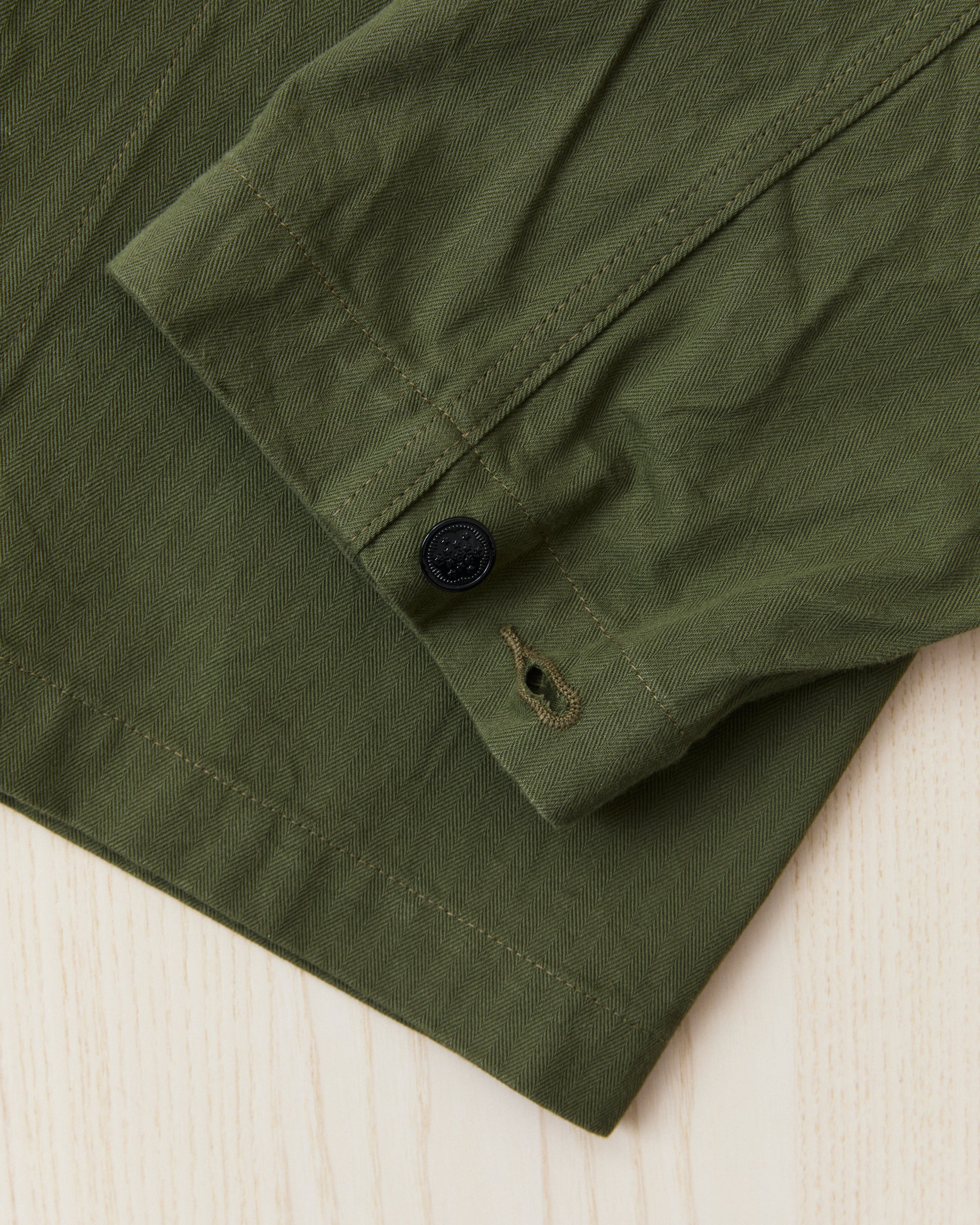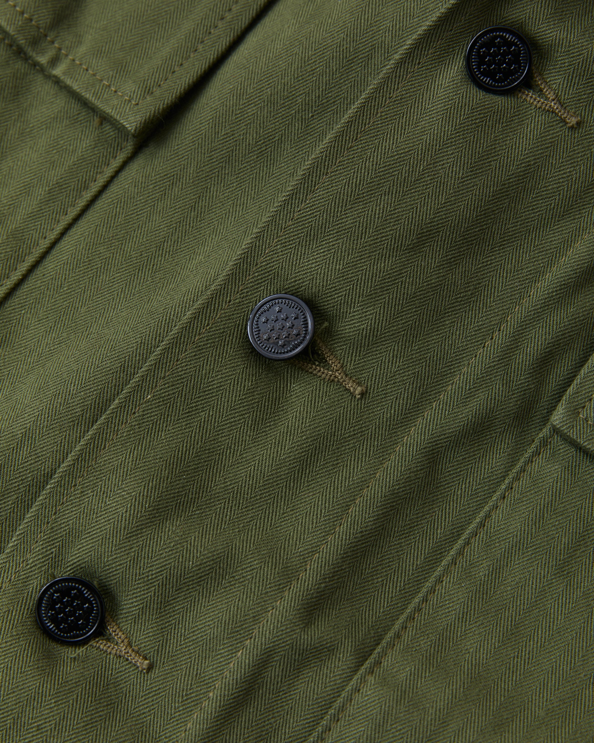The fabric is a nice and sturdy cotton herringbone twill developed by Buzz Rickson's to be as close as the original vintage fabric as possible. It got it's name because the texture resembles the skeleton of a herring. This weaving technique is most commonly used in wool textiles and for more dressed up suits, but during the 40 and 50s it was also used in the military and and in workwear garments and that's were this jacket find it's inspiration. The cotton herringbone fabric was referred to as the "HBT twill". After some use and a few washes the character of the garment truly begins to show and the olive color pairs well with wardrobe classics such as sweatshirts, chambrays and faded jeans!