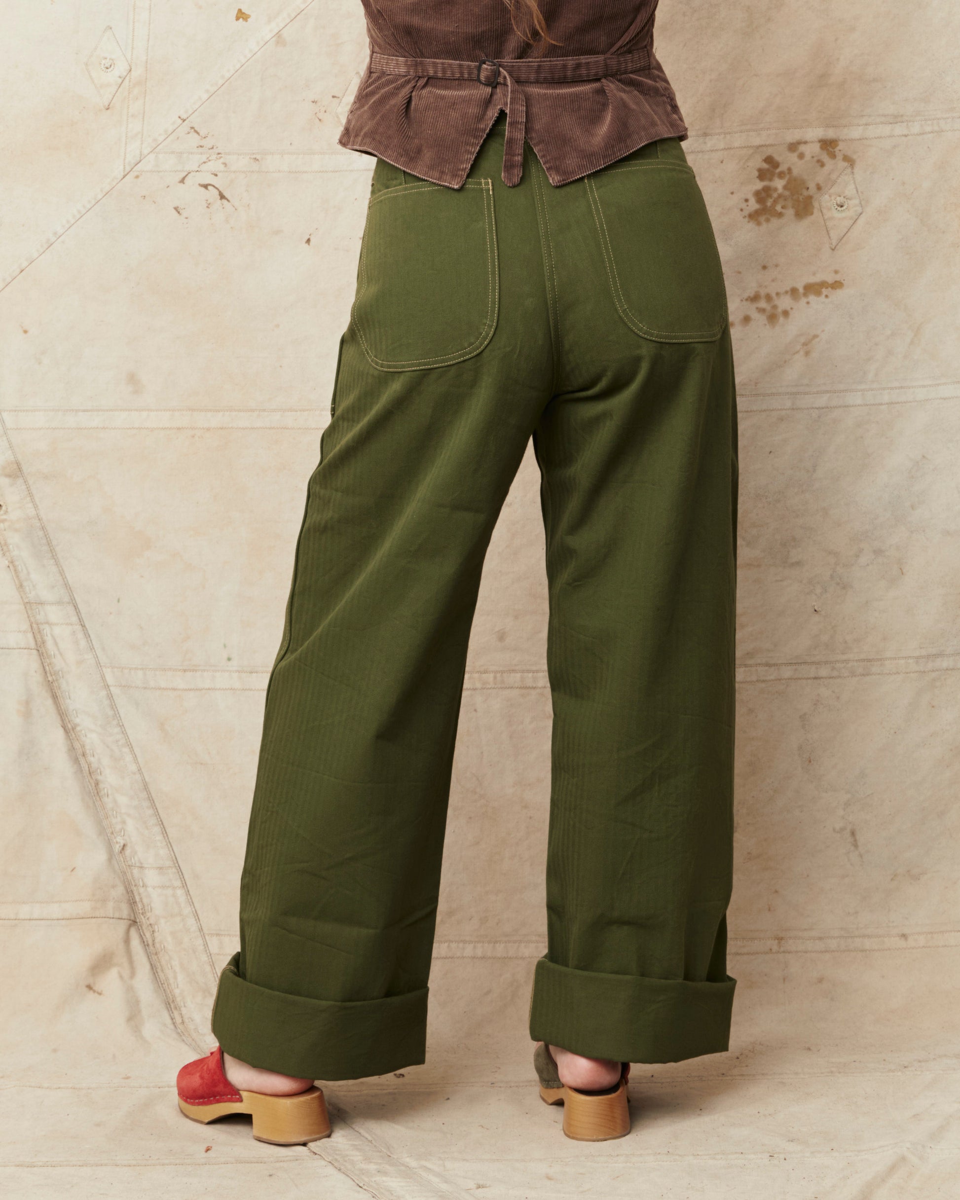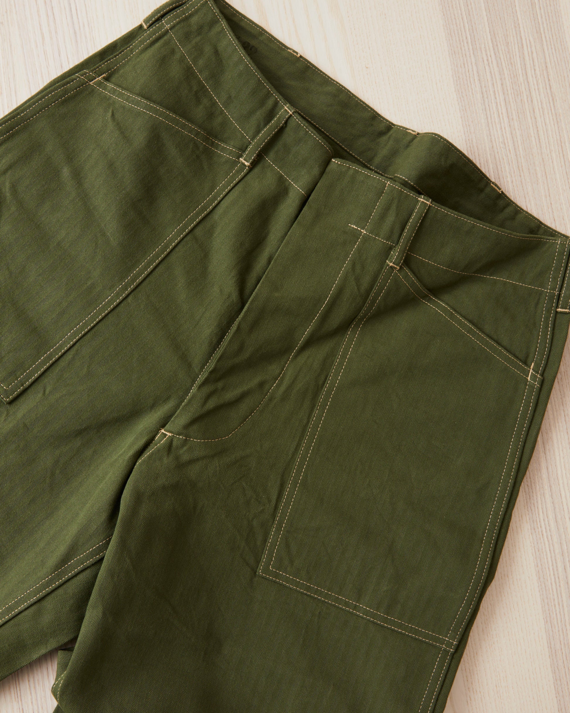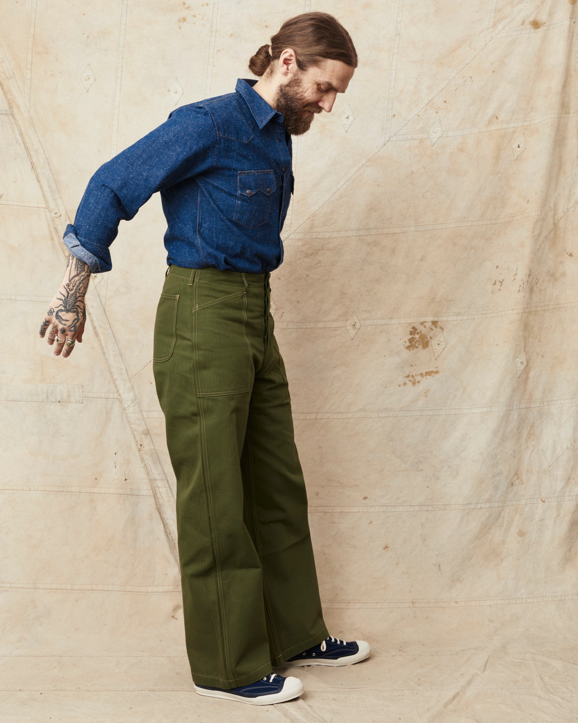 This is Buzz Rickson's version of the M-41 trousers worn by the US army during WWII. This is a reproduction of the very first very rare pattern. It's a wide legged trouser with a high waist, a true 1940's fit made to be worn on any occasion. These got a button fly, two back pockets and two patch front pockets. In comparison to the M-43, these lack side adjusters and adjusters down by the hem.