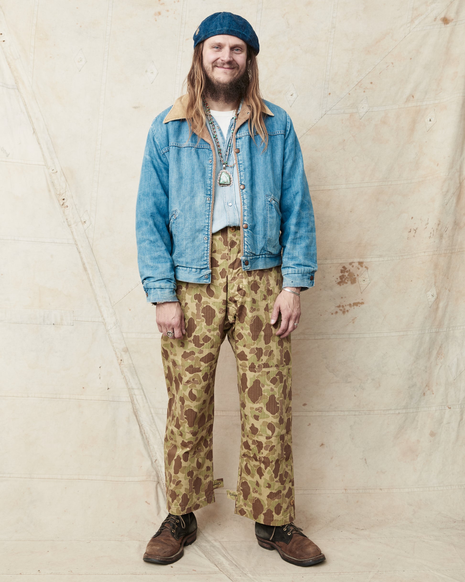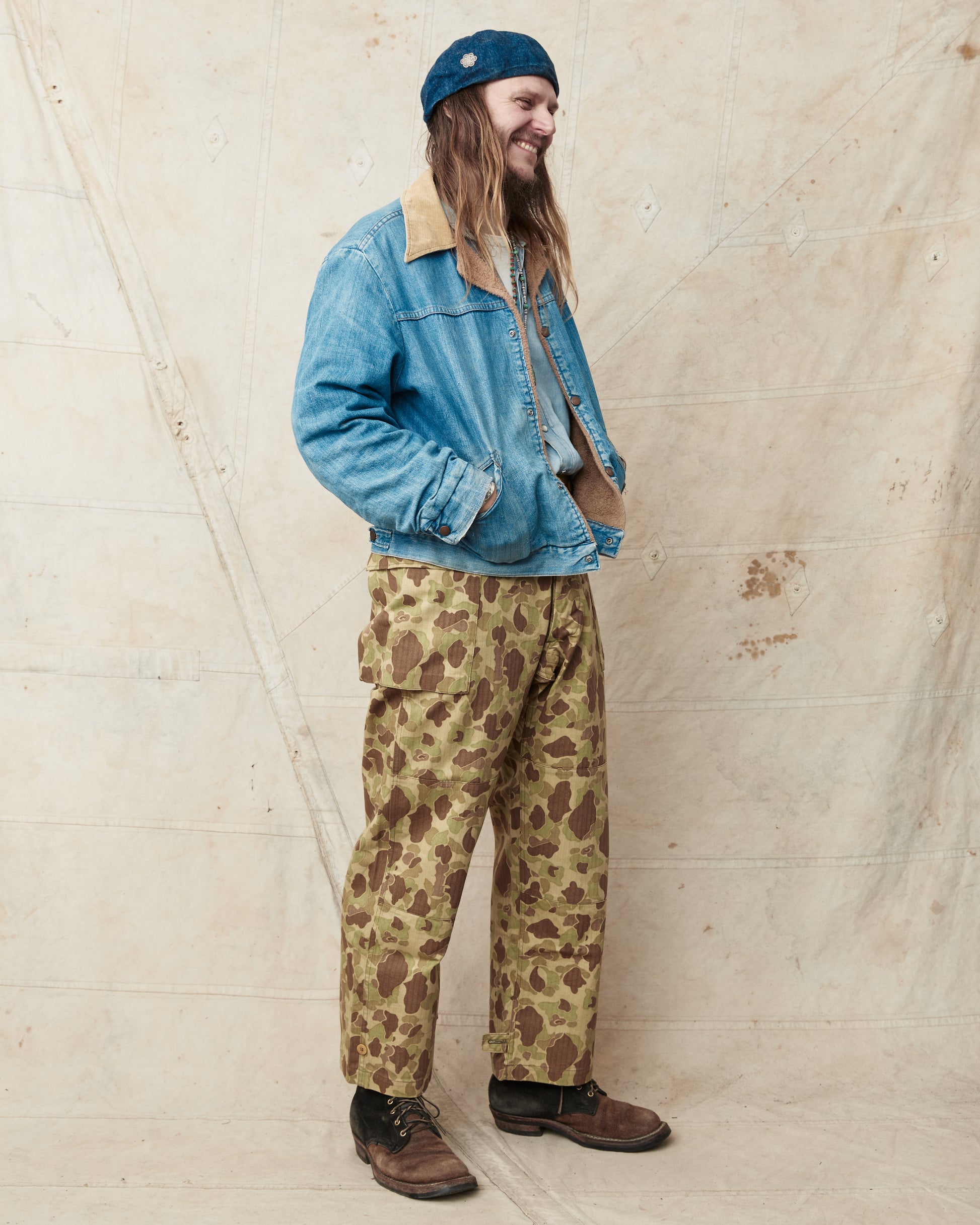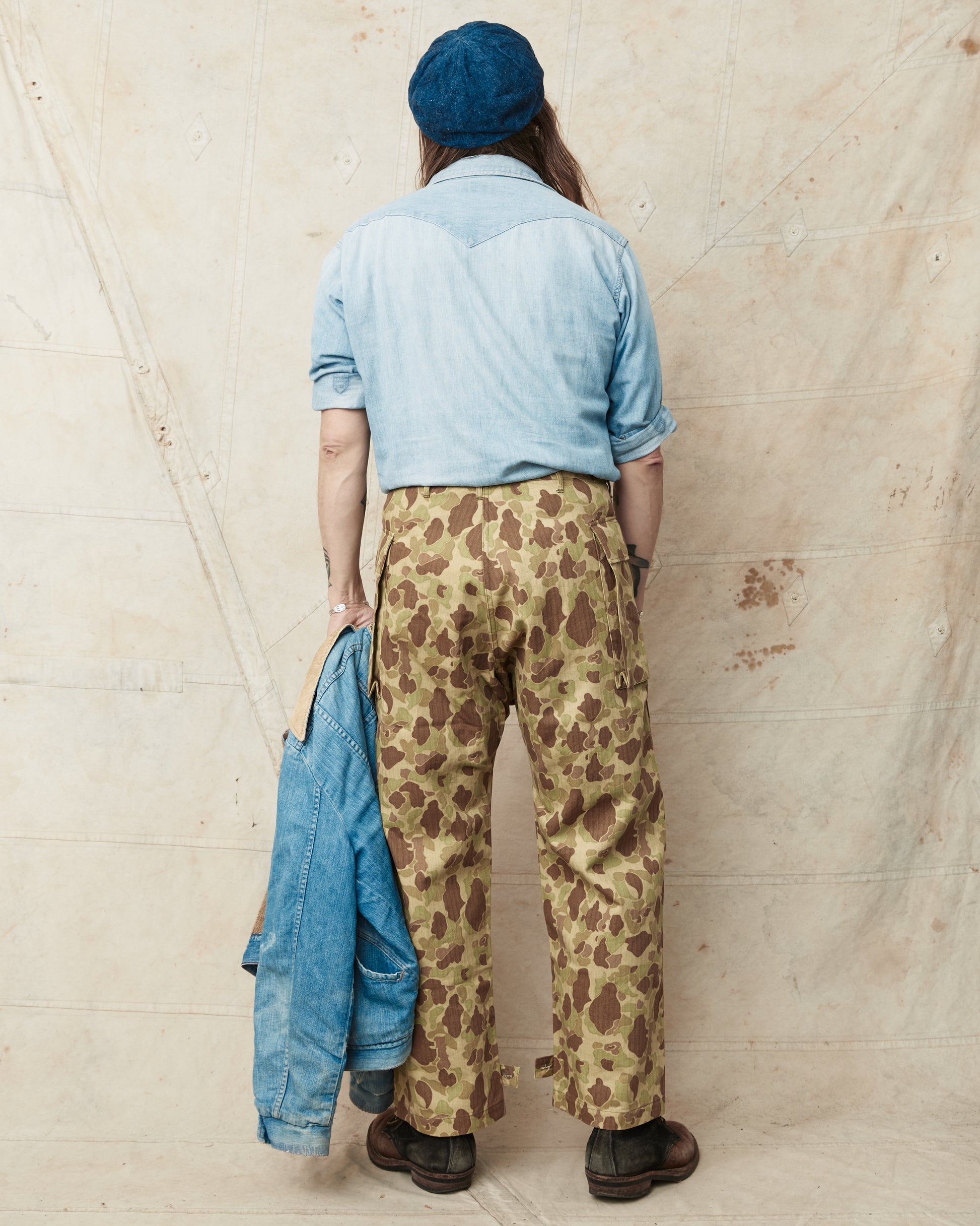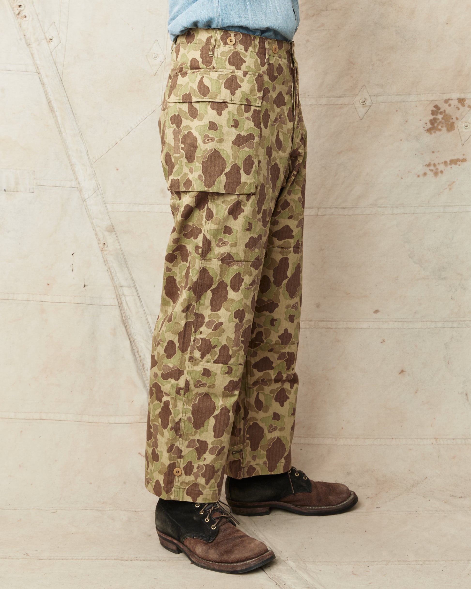 These pants from Buzz Rickson's are a reproduction of the "frog skin" pants that were issued to the US Marine Corp during WWII, with the unique camo pattern developed for a jungle type environment. Originally, they were designed to be multi functional and could be worn reversed with the so called "beach" side out, which is in the same pattern but in sandy brown colors.