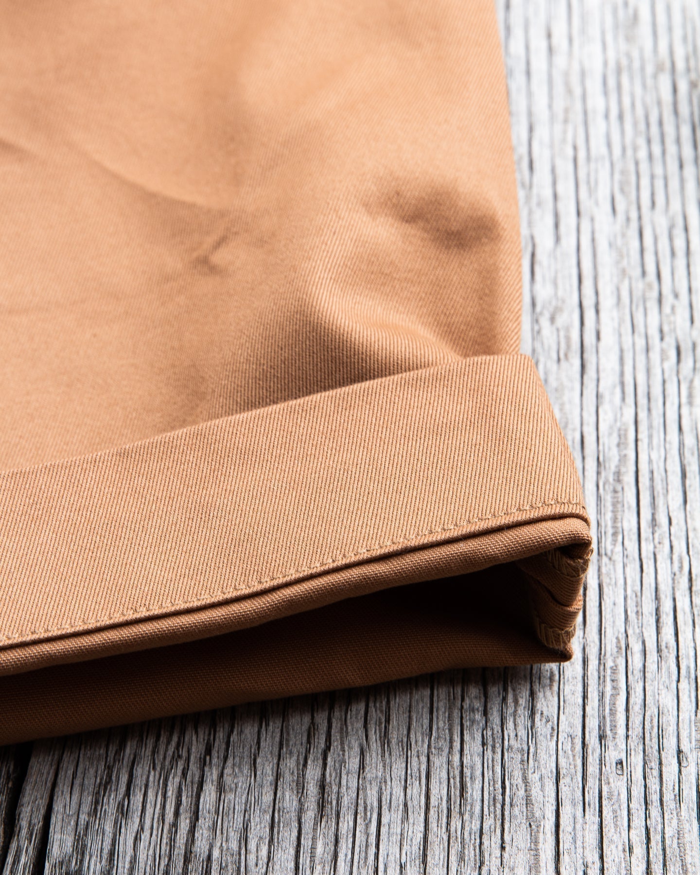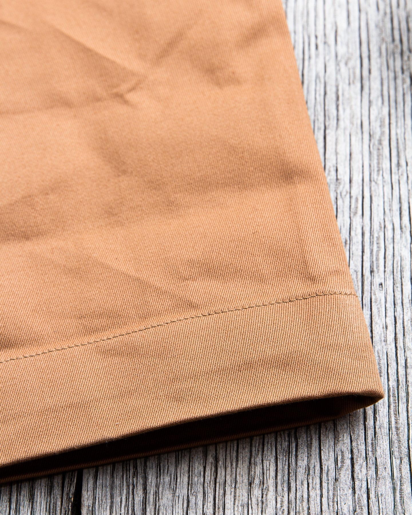 These chinos are unwashed but they won't shrink notably, however if you are in between two sizes we recommend you to go for the larger size. The fabric is dense, stiff and shiny at the beginning but will will soften when worn and washed a few times. The shine will also come off and the cotton will get soft and faded just like a pair of original vintage pair of pants!