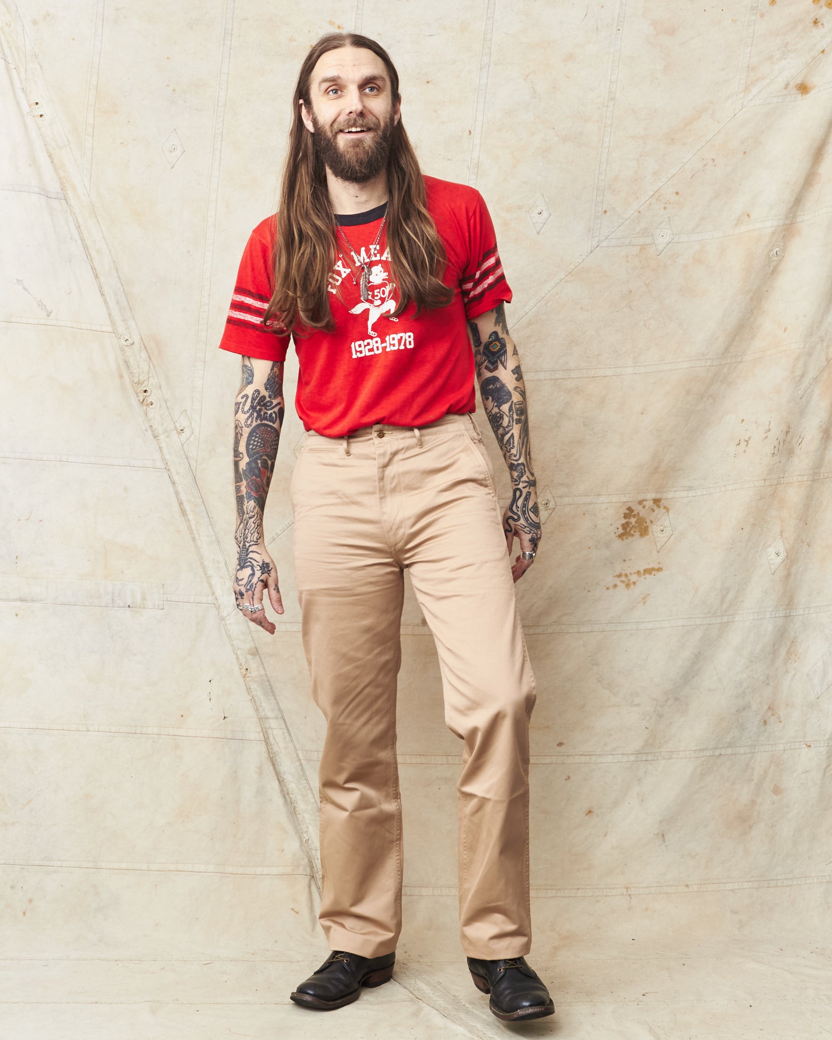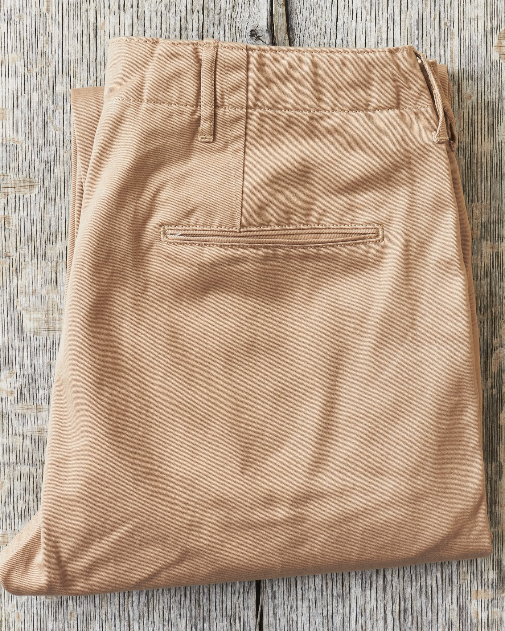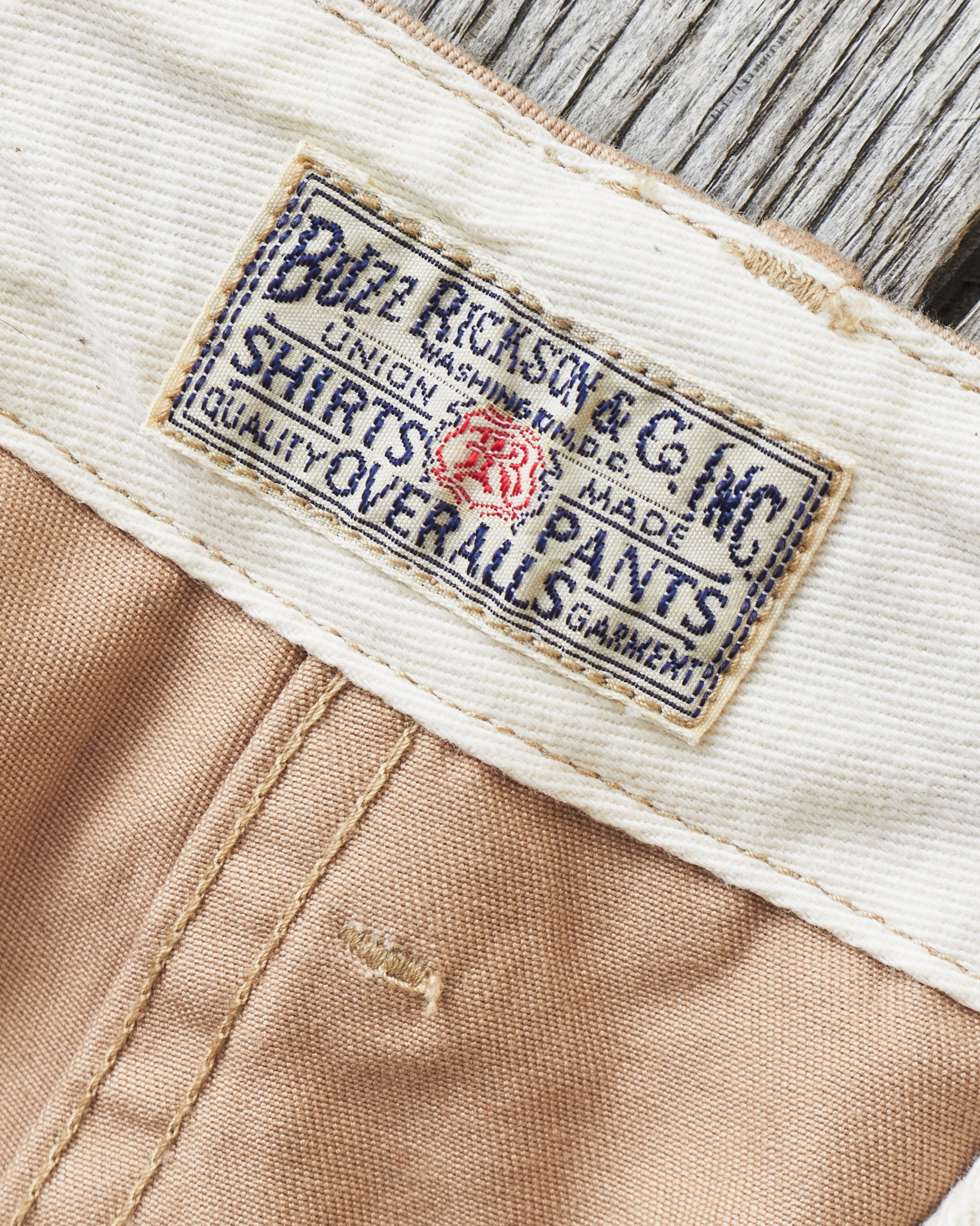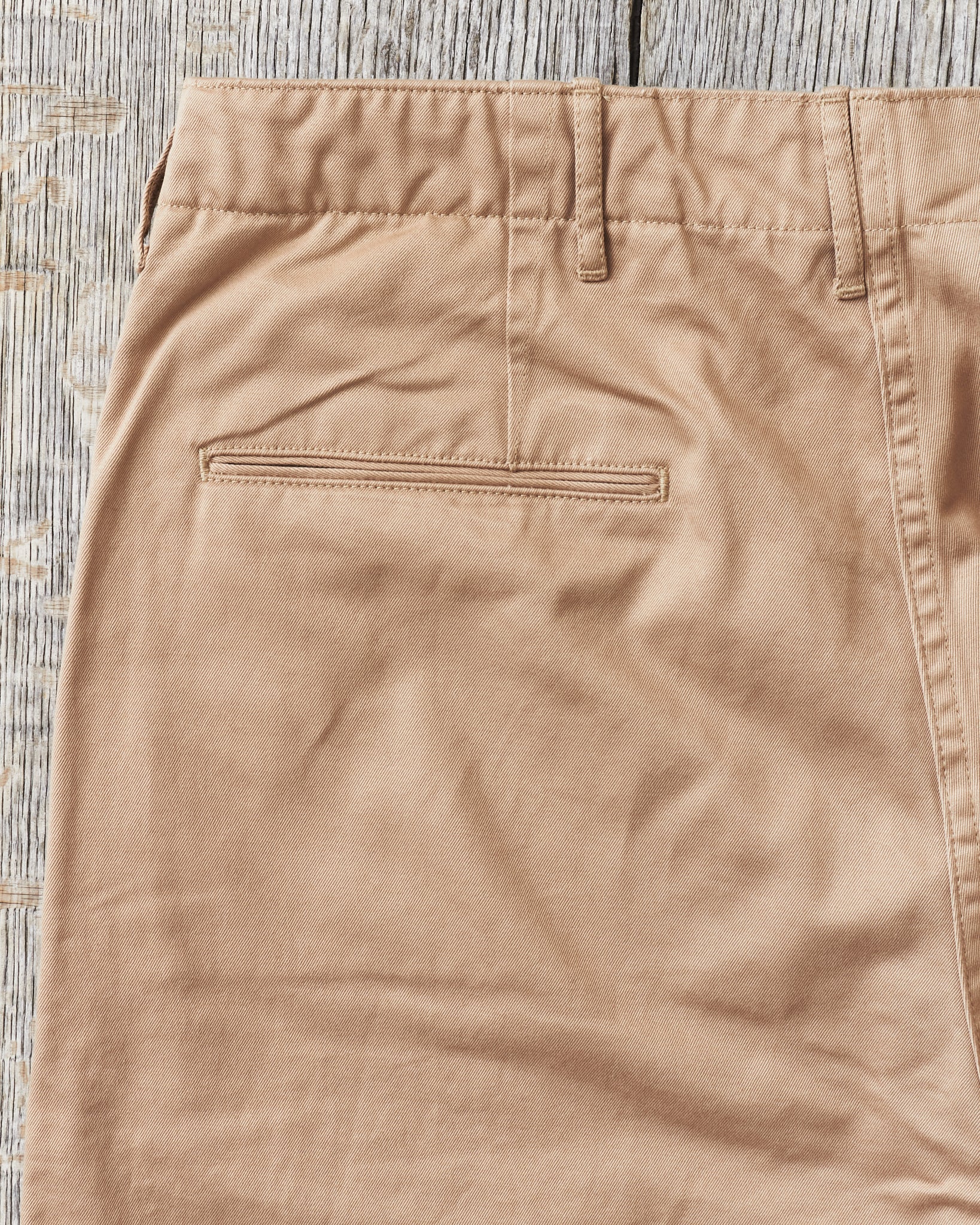 This is Buzz Rickson's reproduction of the classic US-Army Chino worn in the 40s. Produced today to full military spec from that time. The Original Spec chinos has a some what updated fit, with a slightly lower waist and a narrower leg than the chinos worn bu the US army in the middle of the last century.