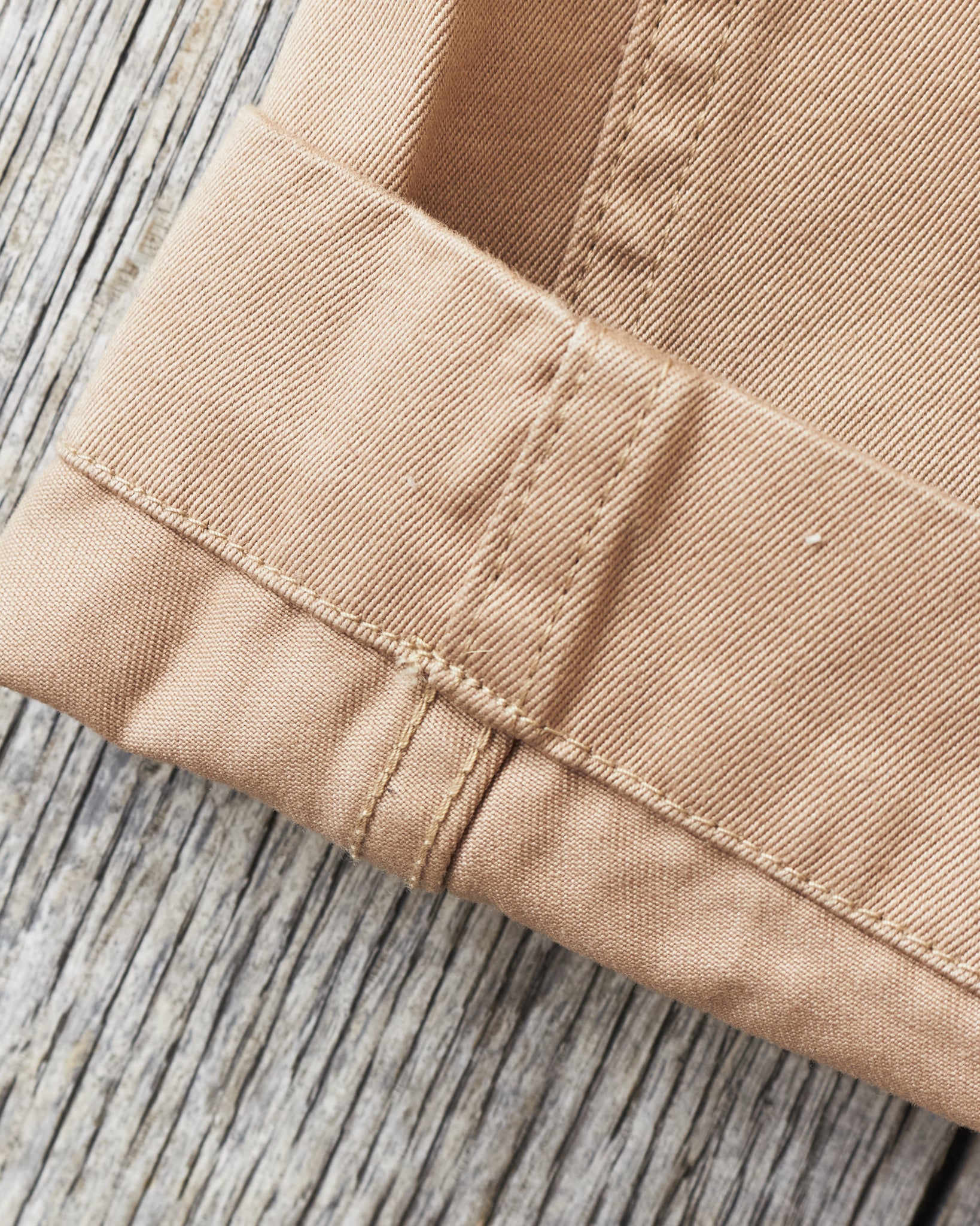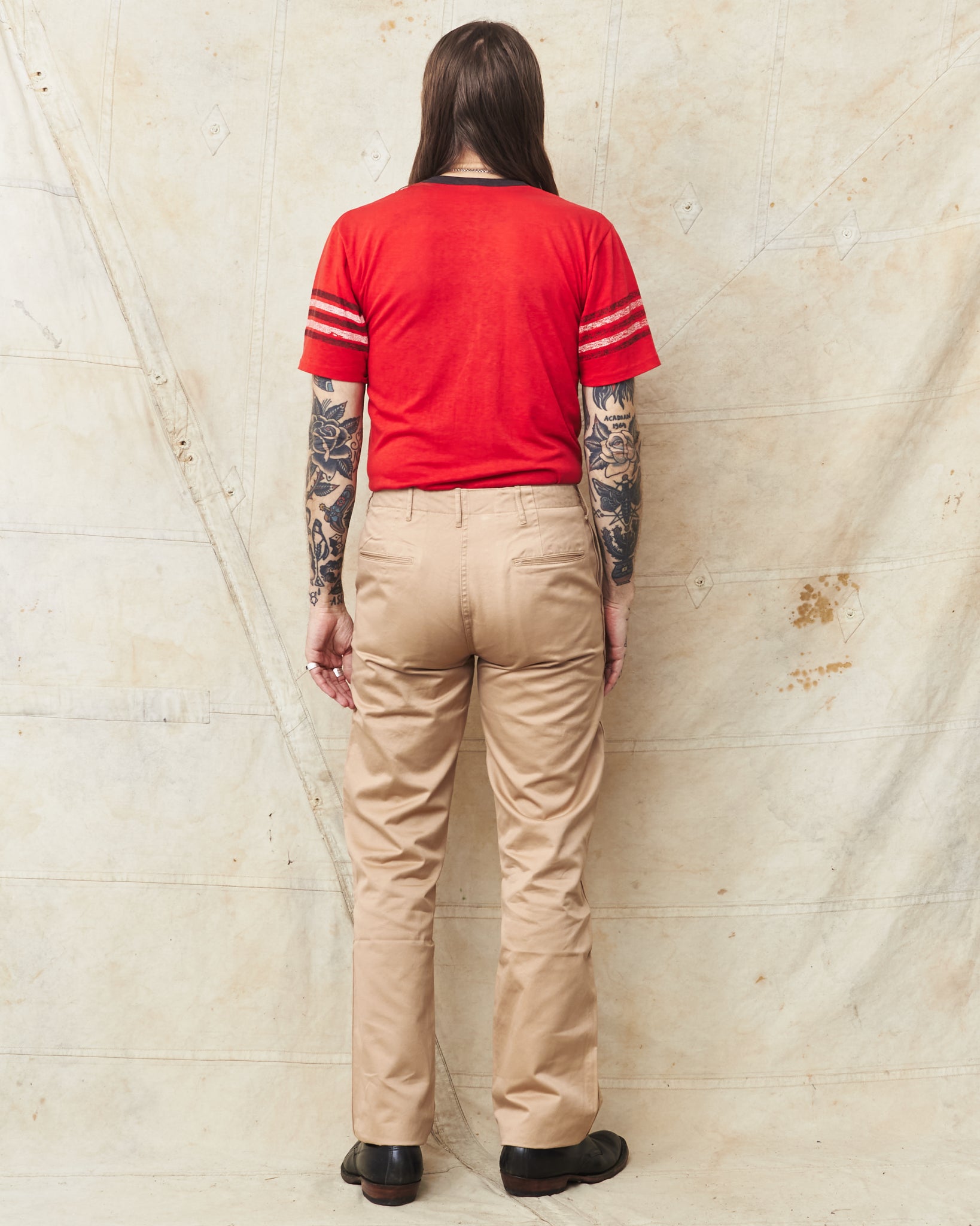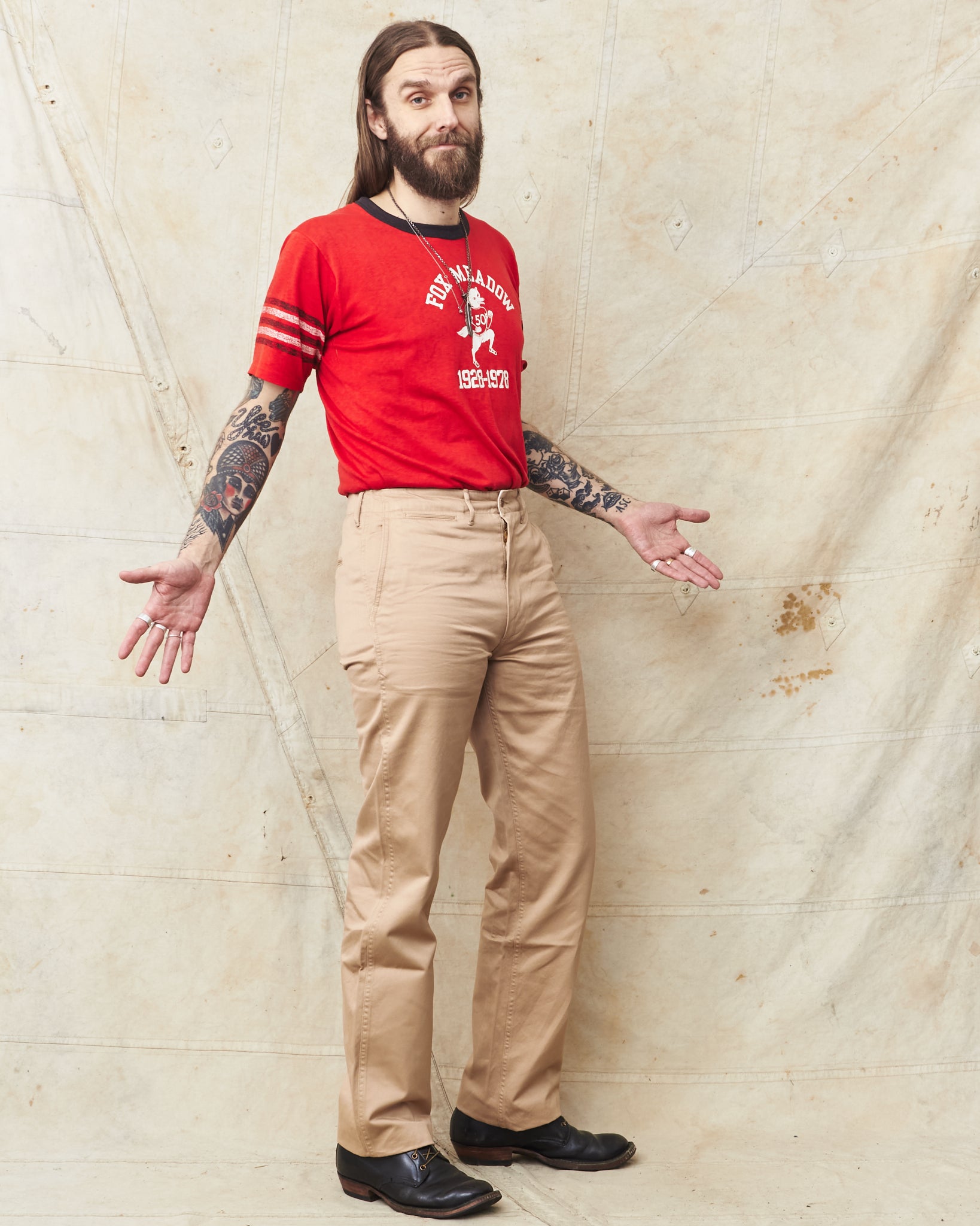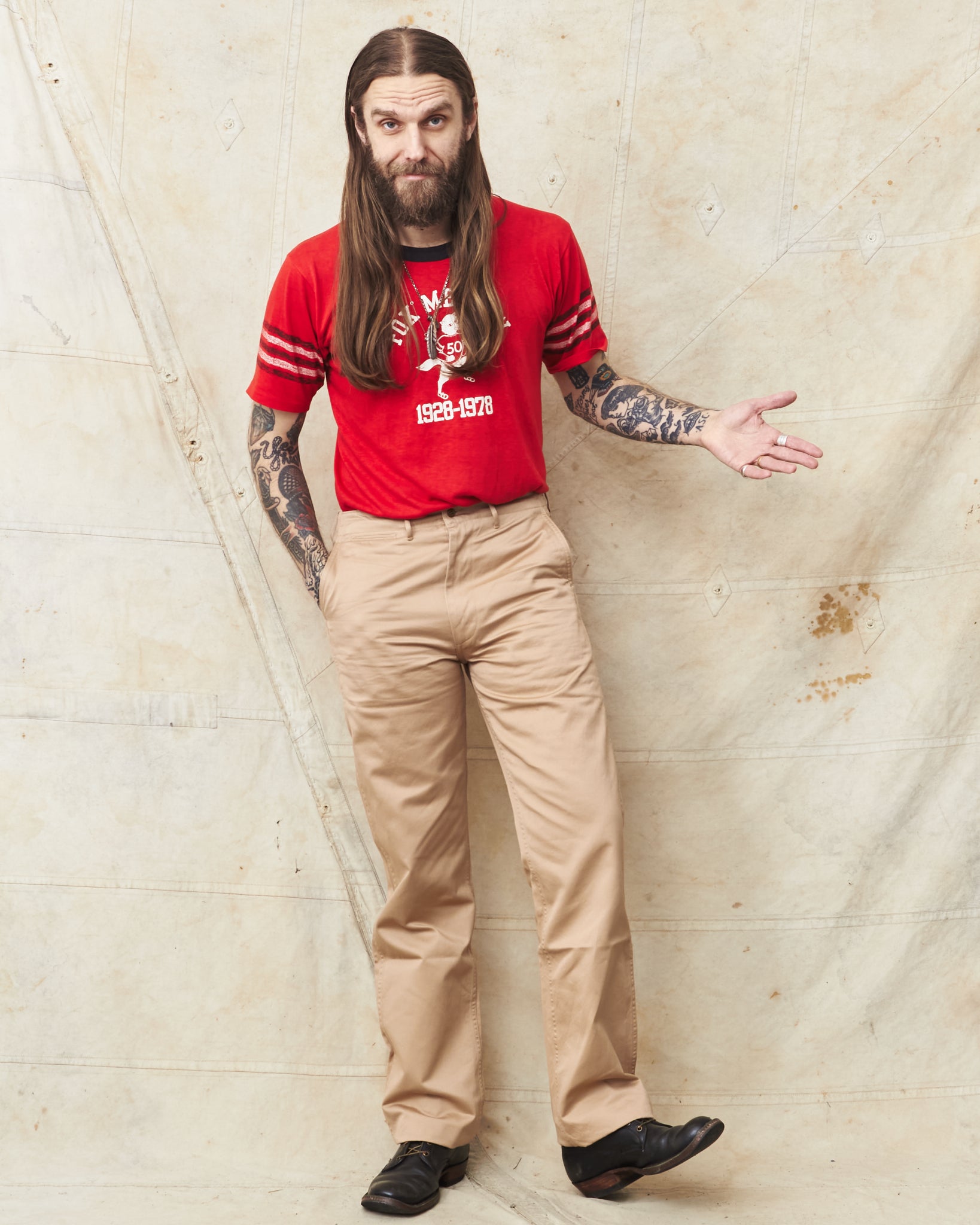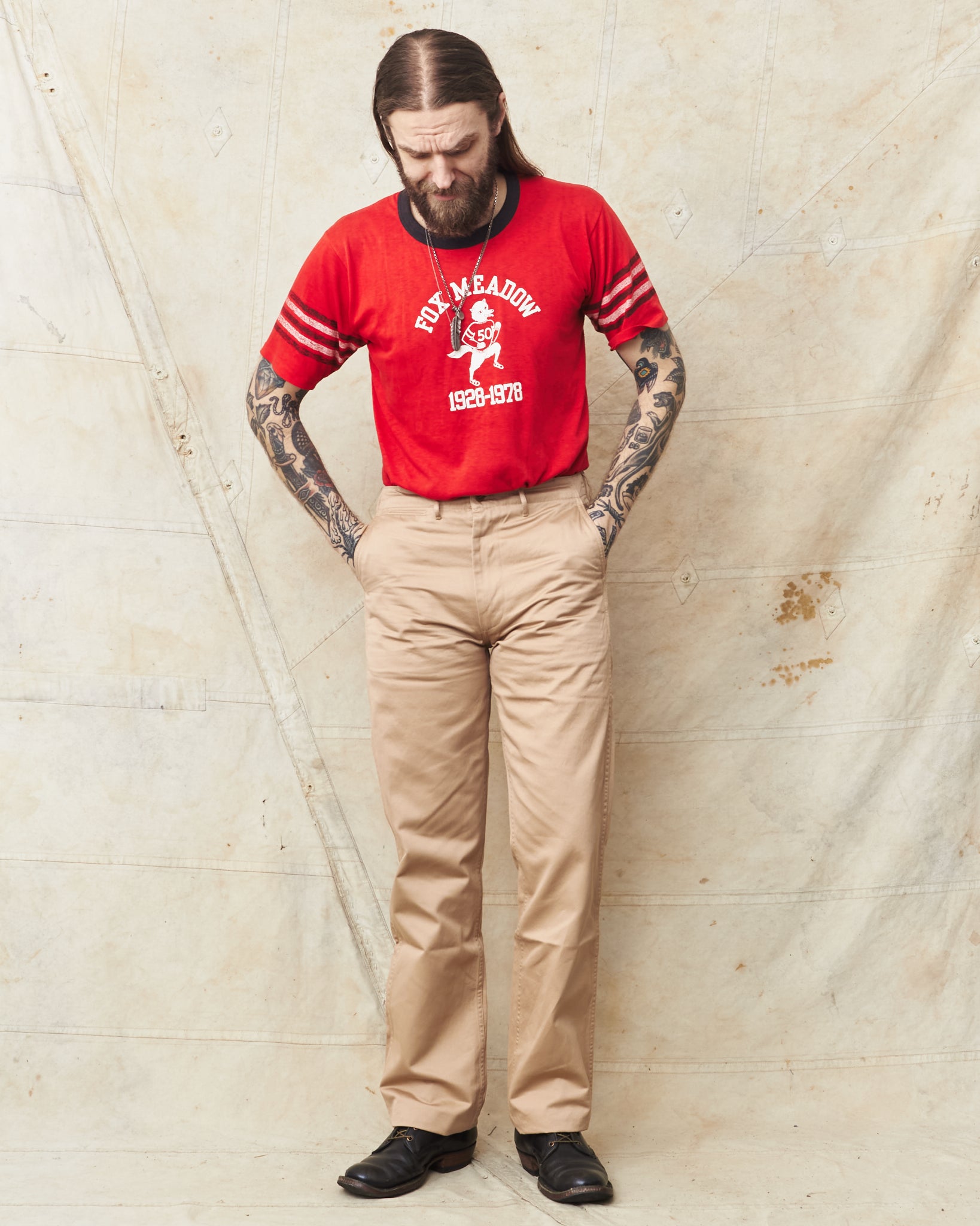 This is Buzz Rickson's reproduction of the classic US-Army Chino worn in the 40s. Produced today to full military spec from that time. The Original Spec chinos has a some what updated fit, with a slightly lower waist and a narrower leg than the chinos worn bu the US army in the middle of the last century.