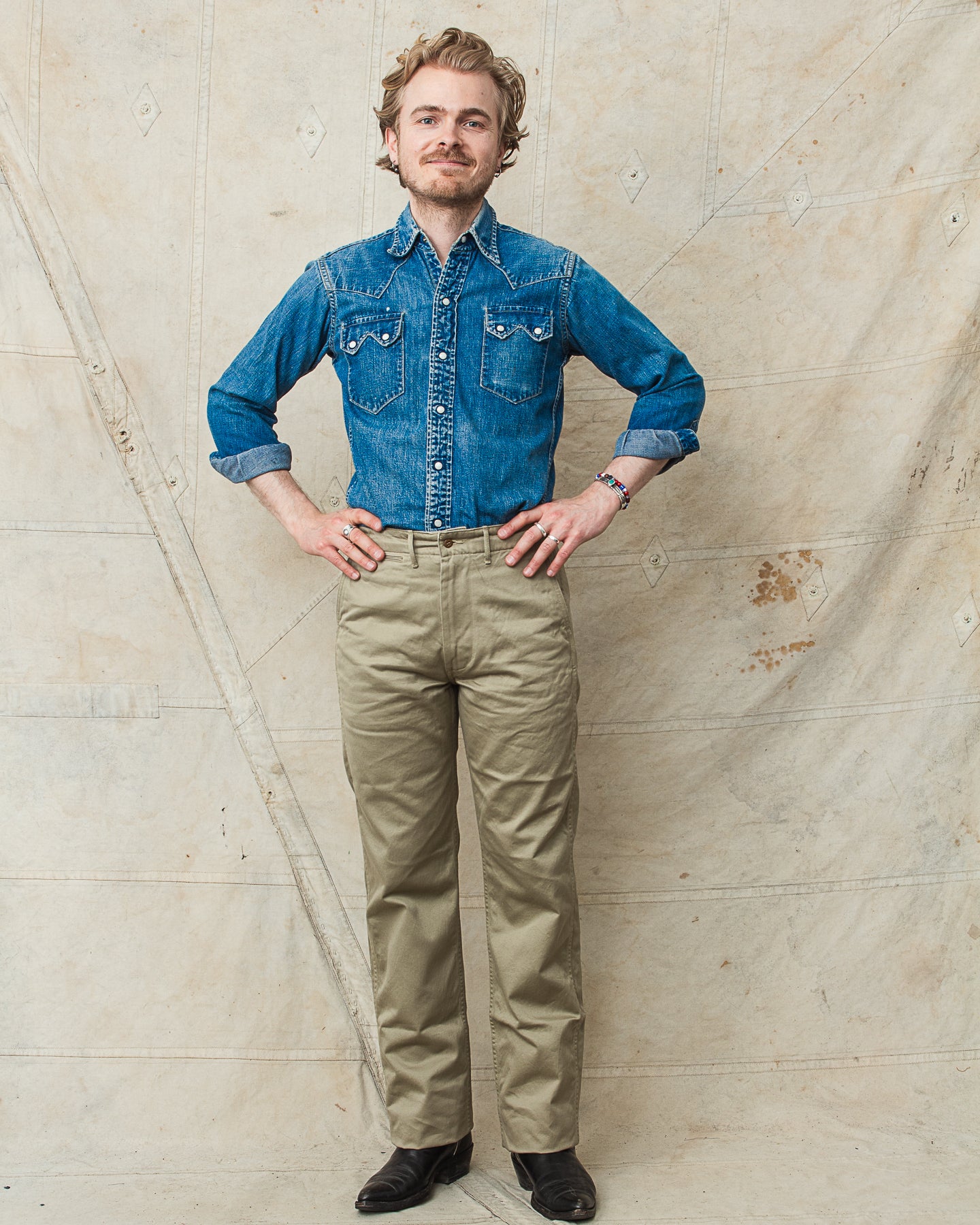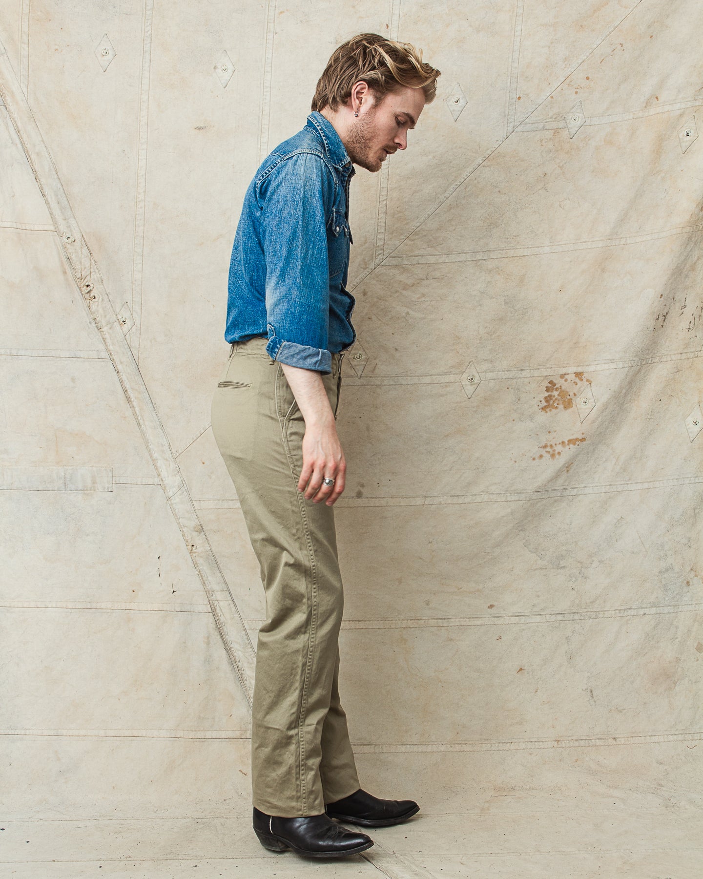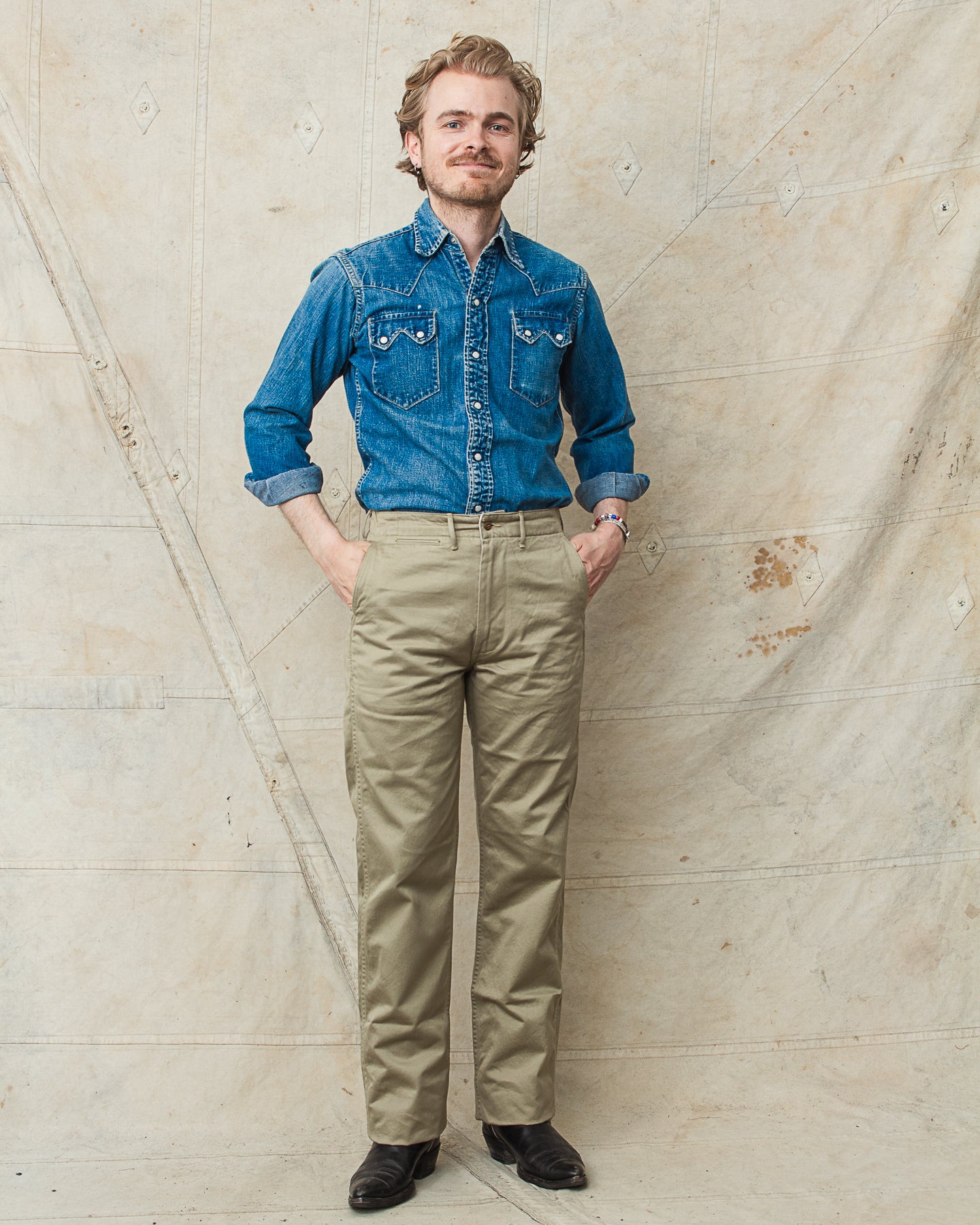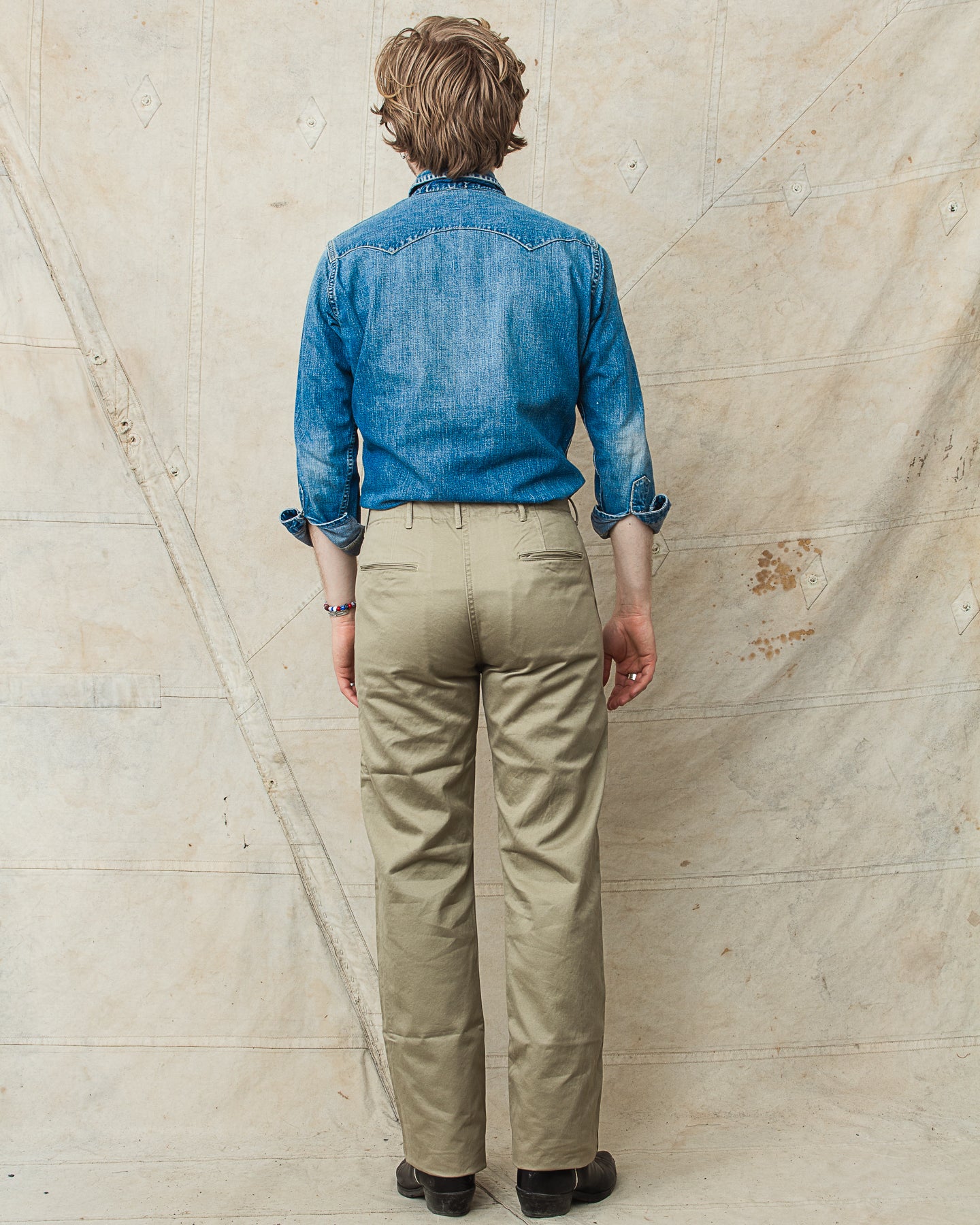 This is Buzz Rickson's reproduction of the classic US-Army Chino worn in the 40s. Produced today to full military spec from that time. The Original Spec chinos has a some what updated fit, with a slightly lower waist and a narrower leg than the chinos worn bu the US army in the middle of the last century.