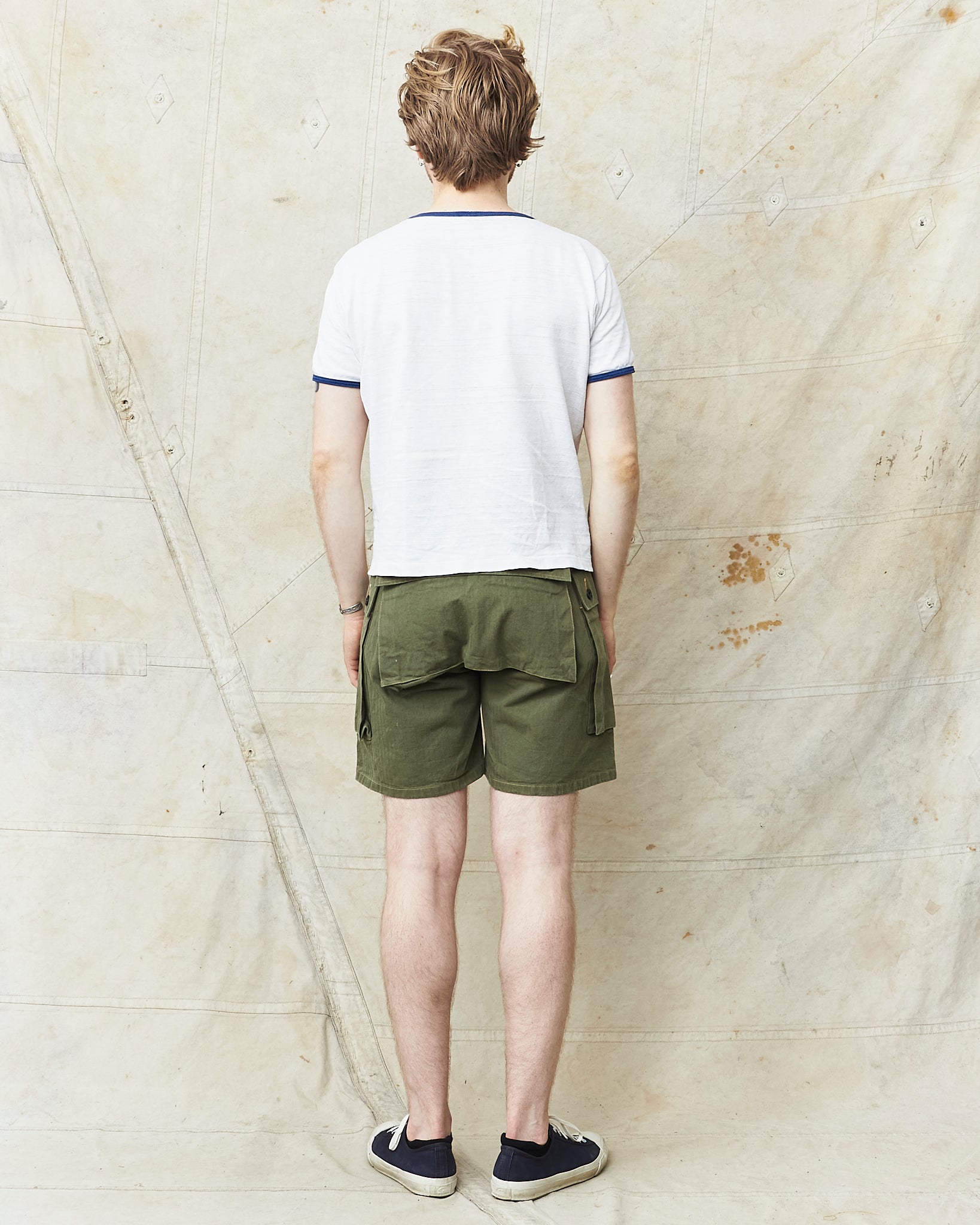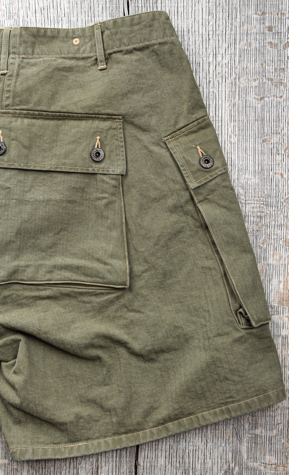 This is Buzz Rickson's version of the classic WWII USMC trousers in Herringbone twill cotton "HBT" also known as Monkey pants. Here they come in a shorter version! Perfect for summer days when you want to play it cool but still be able to carry everything. Made from high quality HBT cotton cloth carefully reproduced to meet the standard used bu the US army in the 40s and it sure feels and wears just like a wartime original! Detailing such as USMC metal buttons, large rare pocket original designed to carry a gas mask for what we been told and two large side pockets.