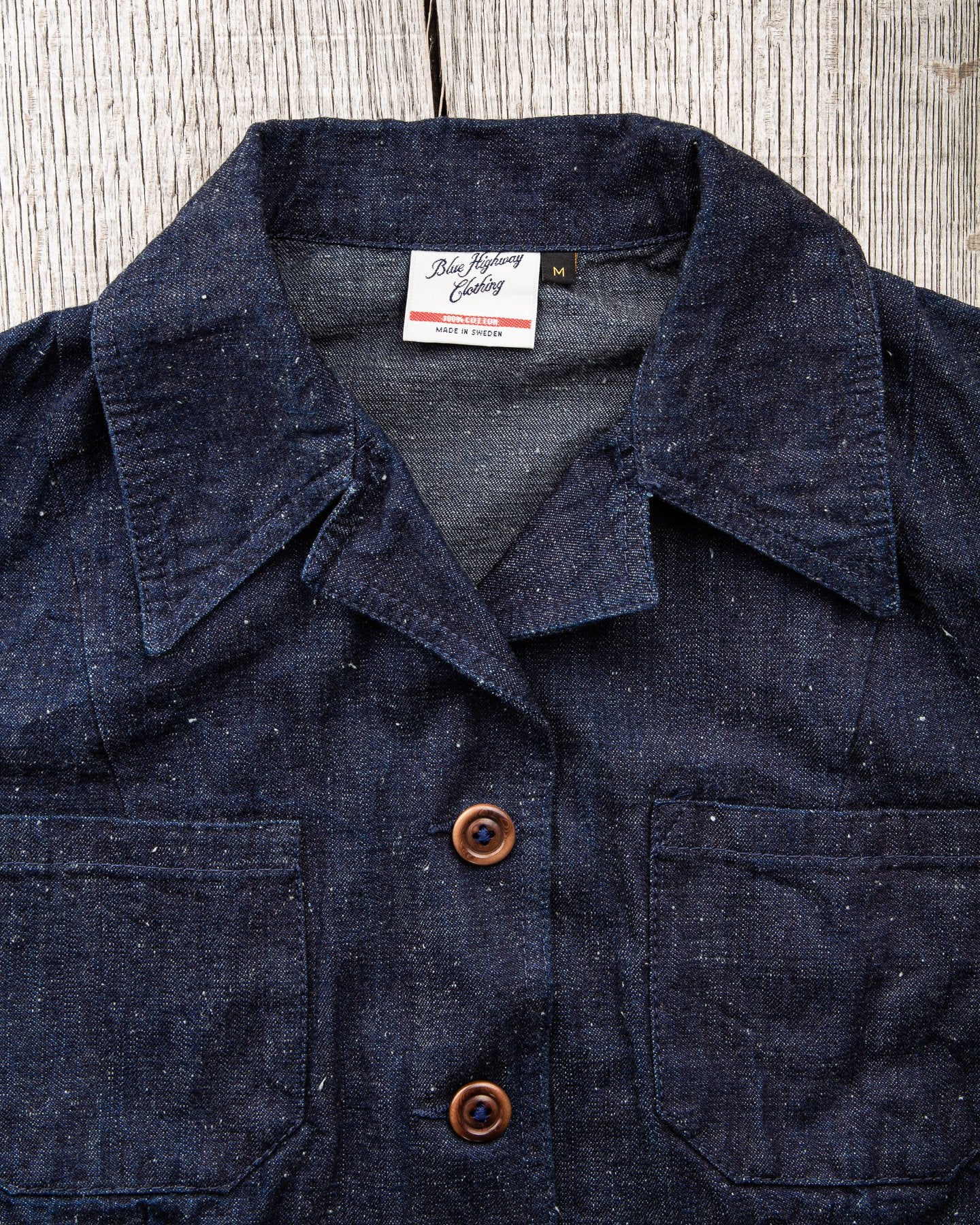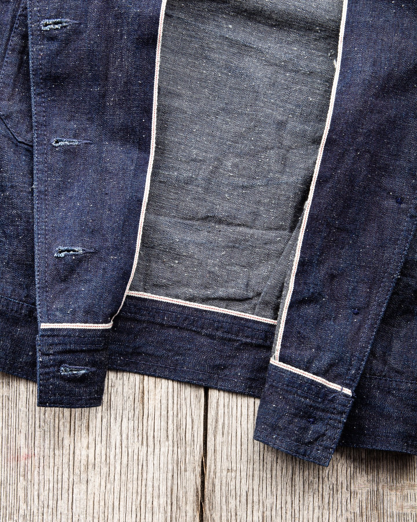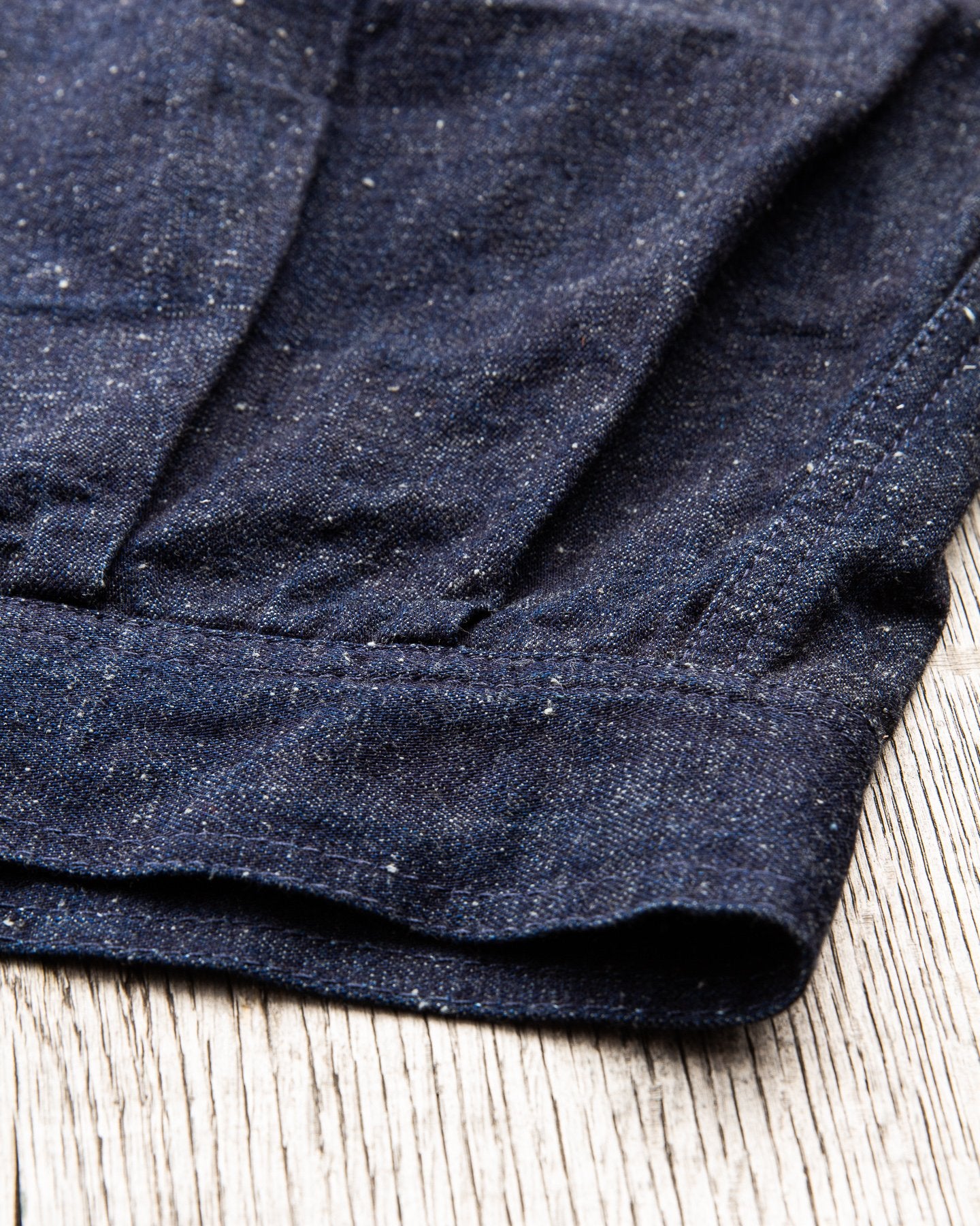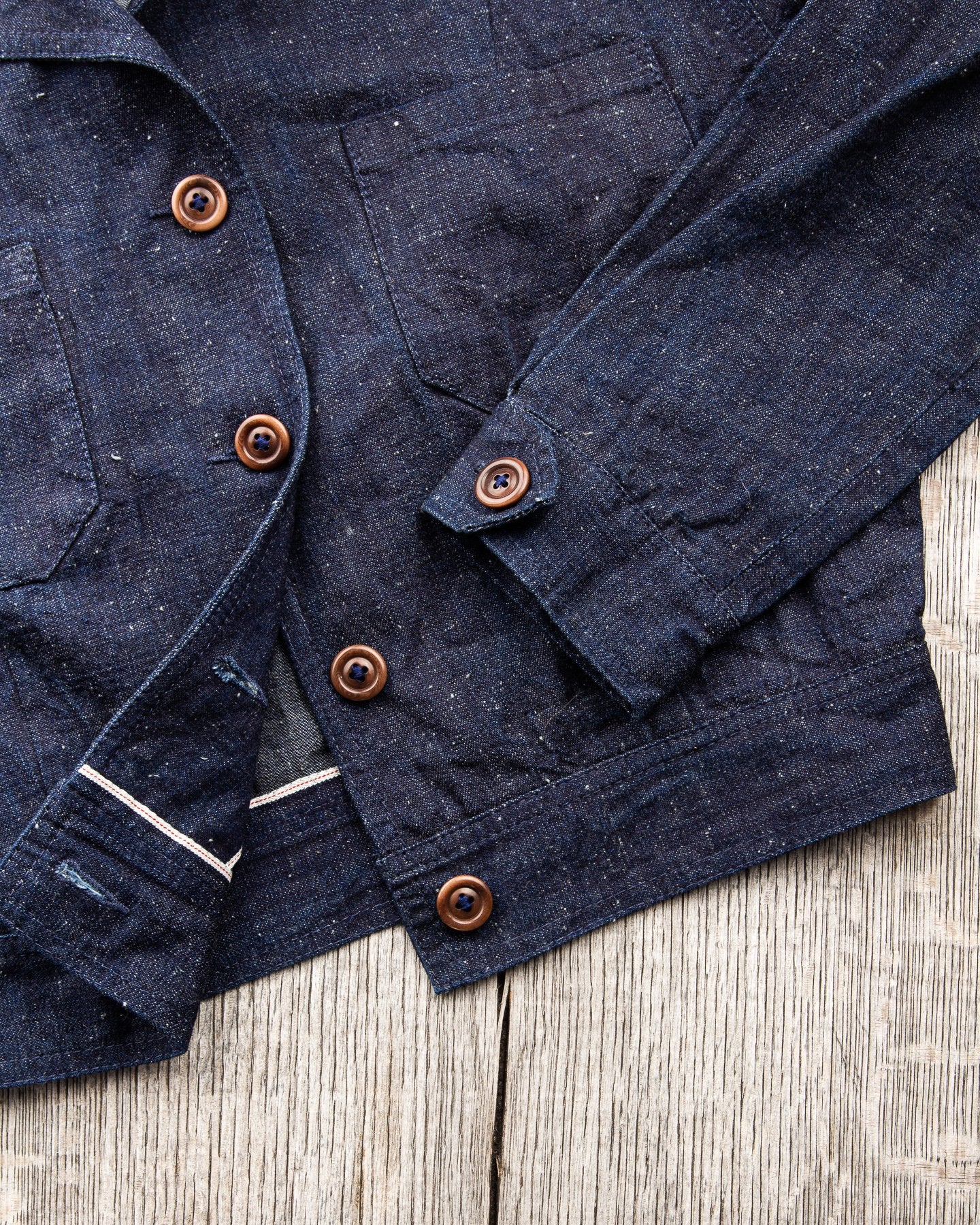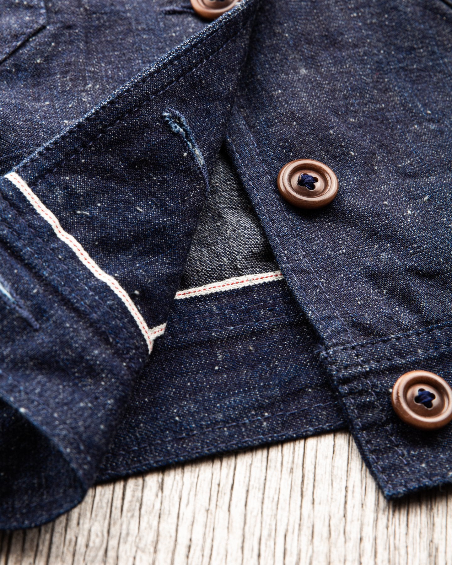 The fabric is a 10 oz Japanese grey weft nep selvage denim milled by Allblue in Japan. The denim is a reproduction of vintage JELT denim, a fabric that was popular in work wear from the middle of the last century. In the production the yarn is twisted tightly making a fine and strong thread that is woven into a sturdy twill fabric. The result is a strong fabric which is not too heavy, ideal for comfortable and long lasting work wear and denim jackets as well. The cotton used in this fabric is a blend of American & Australian cotton. Sourced for their quality, characteristics and fairness production. The warp is rope-dyed with a slightly lighter shade of indigo that's characteristic with vintage denim and the weft is dyed gray. The yarn is then slowly woven on a vintage shuttle loom.
