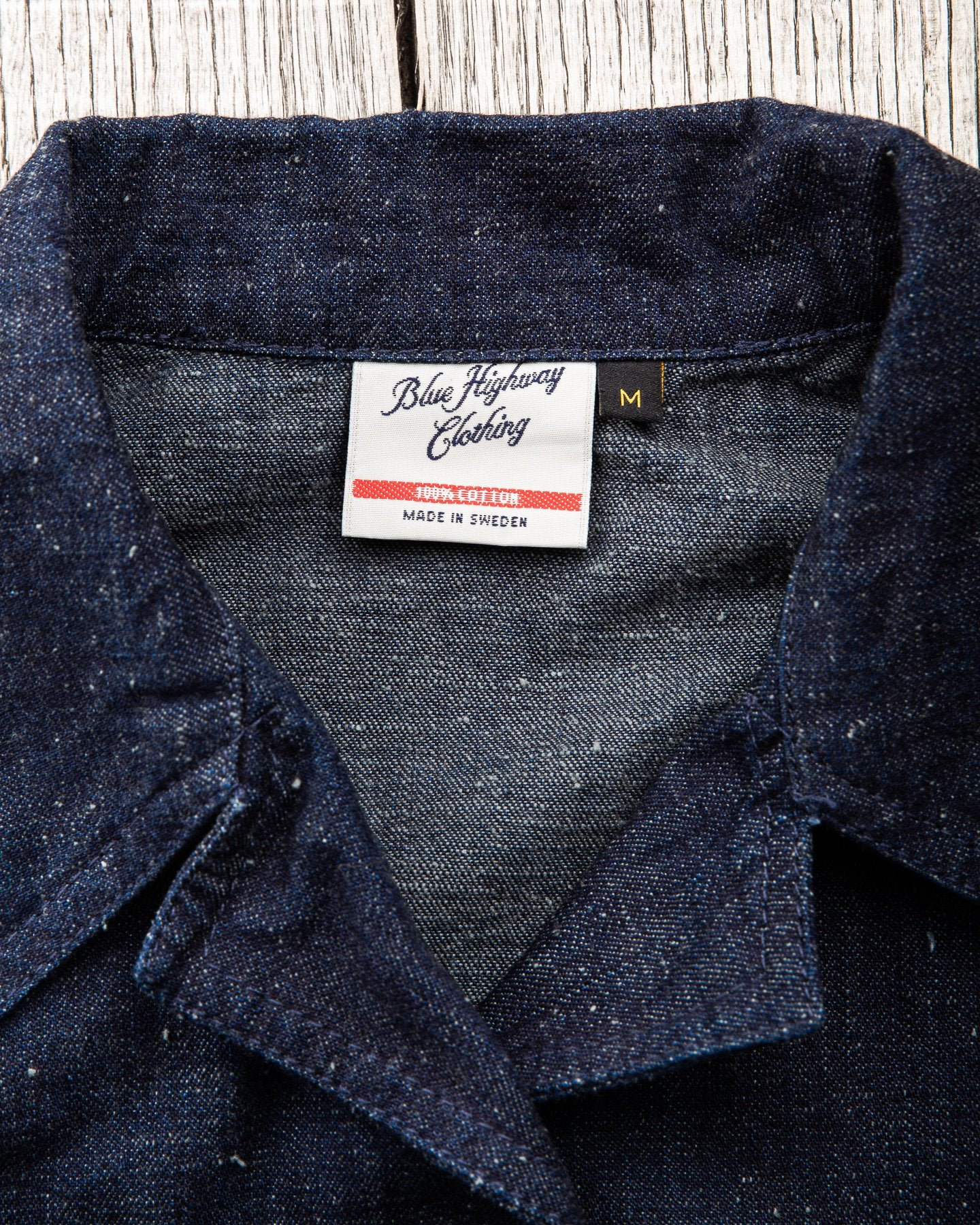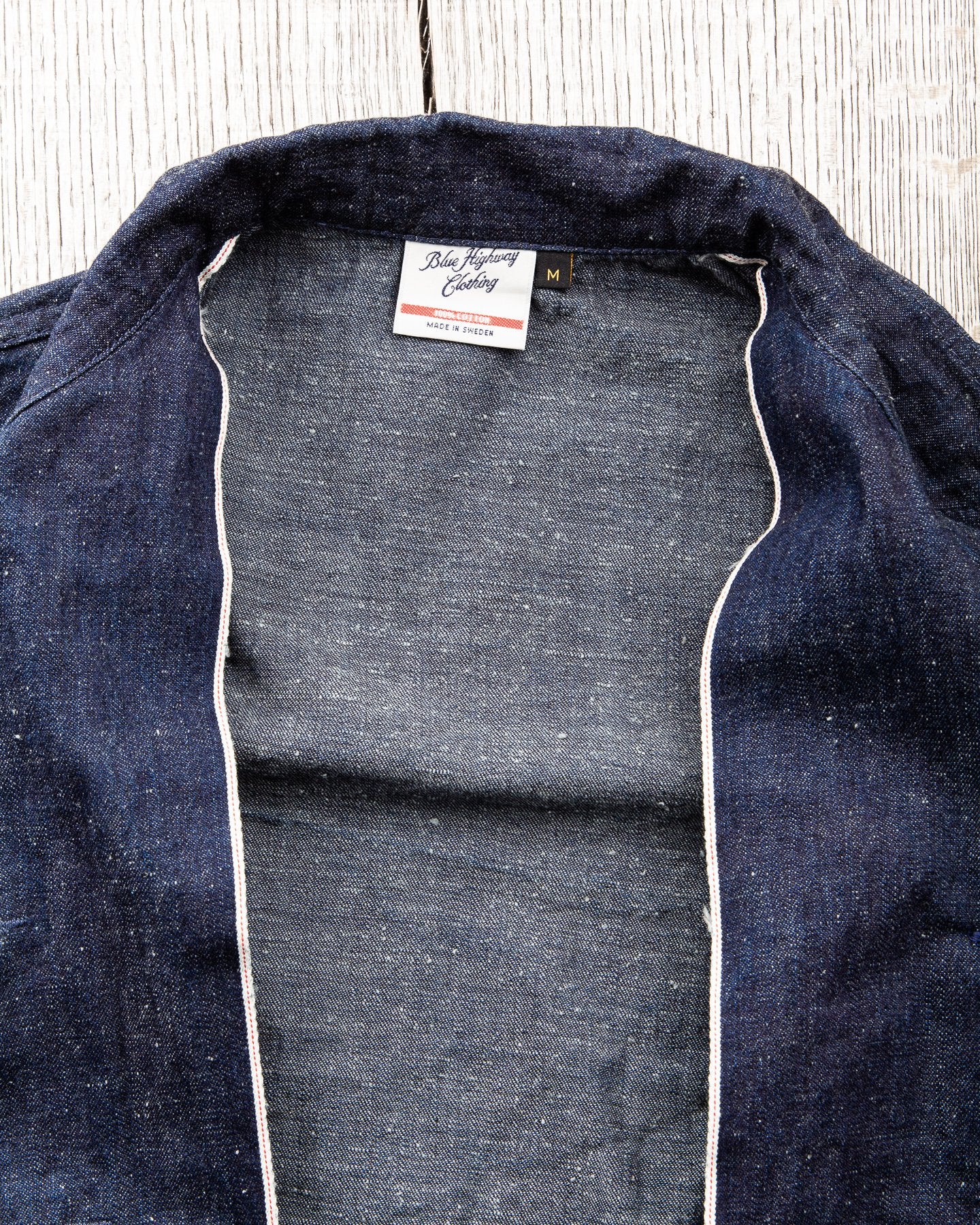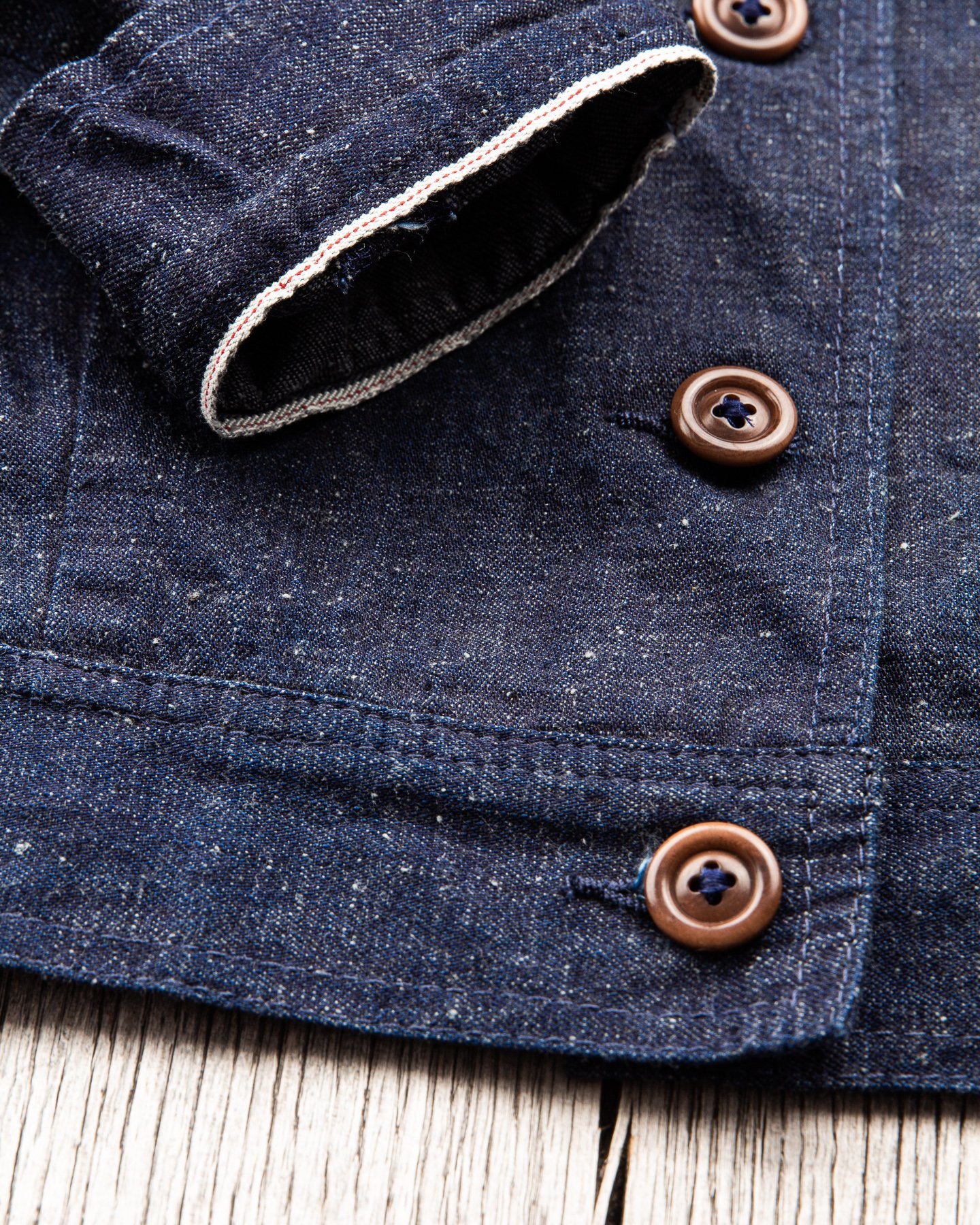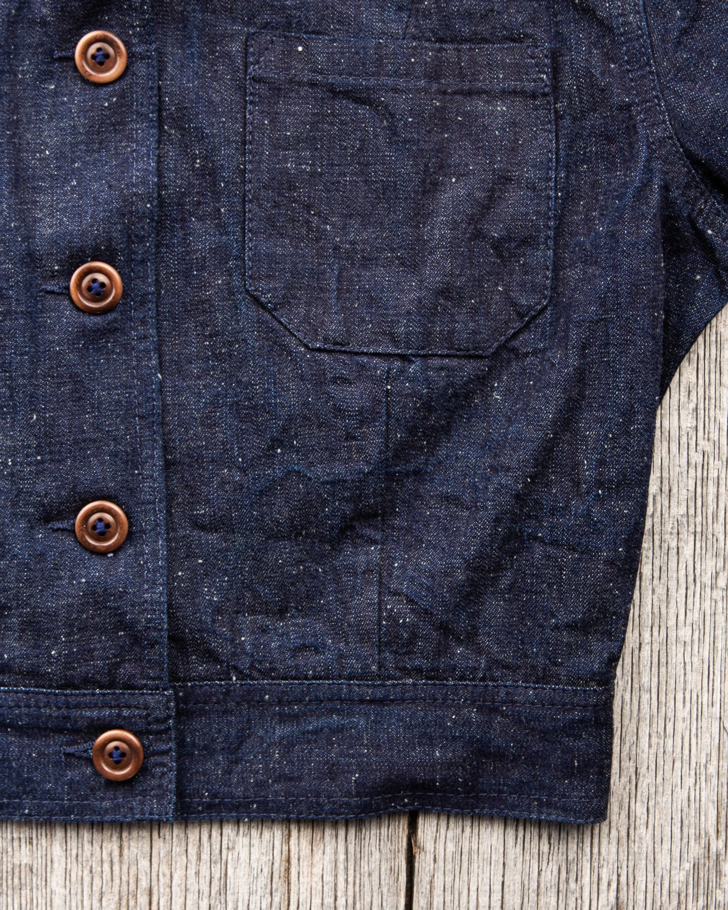 The fabric is a 10 oz Japanese grey weft nep selvage denim milled by Allblue in Japan. The denim is a reproduction of vintage JELT denim, a fabric that was popular in work wear from the middle of the last century. In the production the yarn is twisted tightly making a fine and strong thread that is woven into a sturdy twill fabric. The result is a strong fabric which is not too heavy, ideal for comfortable and long lasting work wear and denim jackets as well. The cotton used in this fabric is a blend of American & Australian cotton. Sourced for their quality, characteristics and fairness production. The warp is rope-dyed with a slightly lighter shade of indigo that's characteristic with vintage denim and the weft is dyed gray. The yarn is then slowly woven on a vintage shuttle loom.