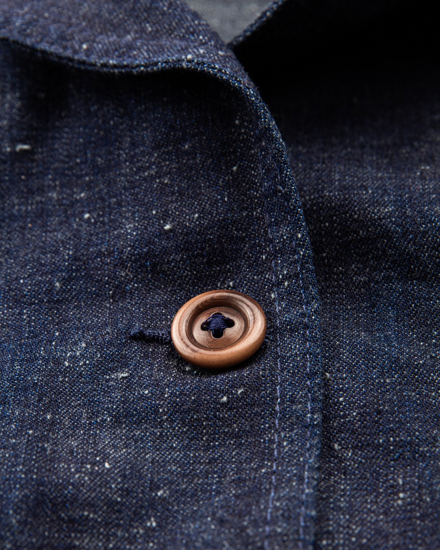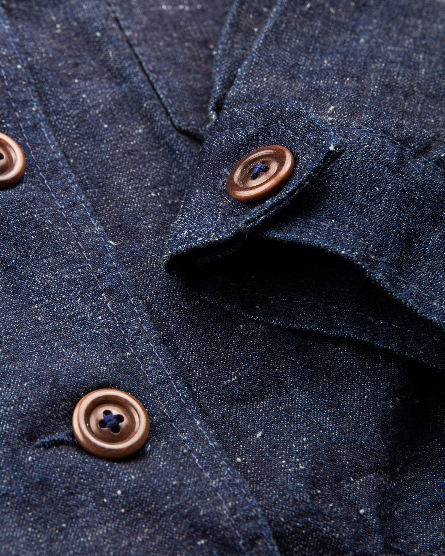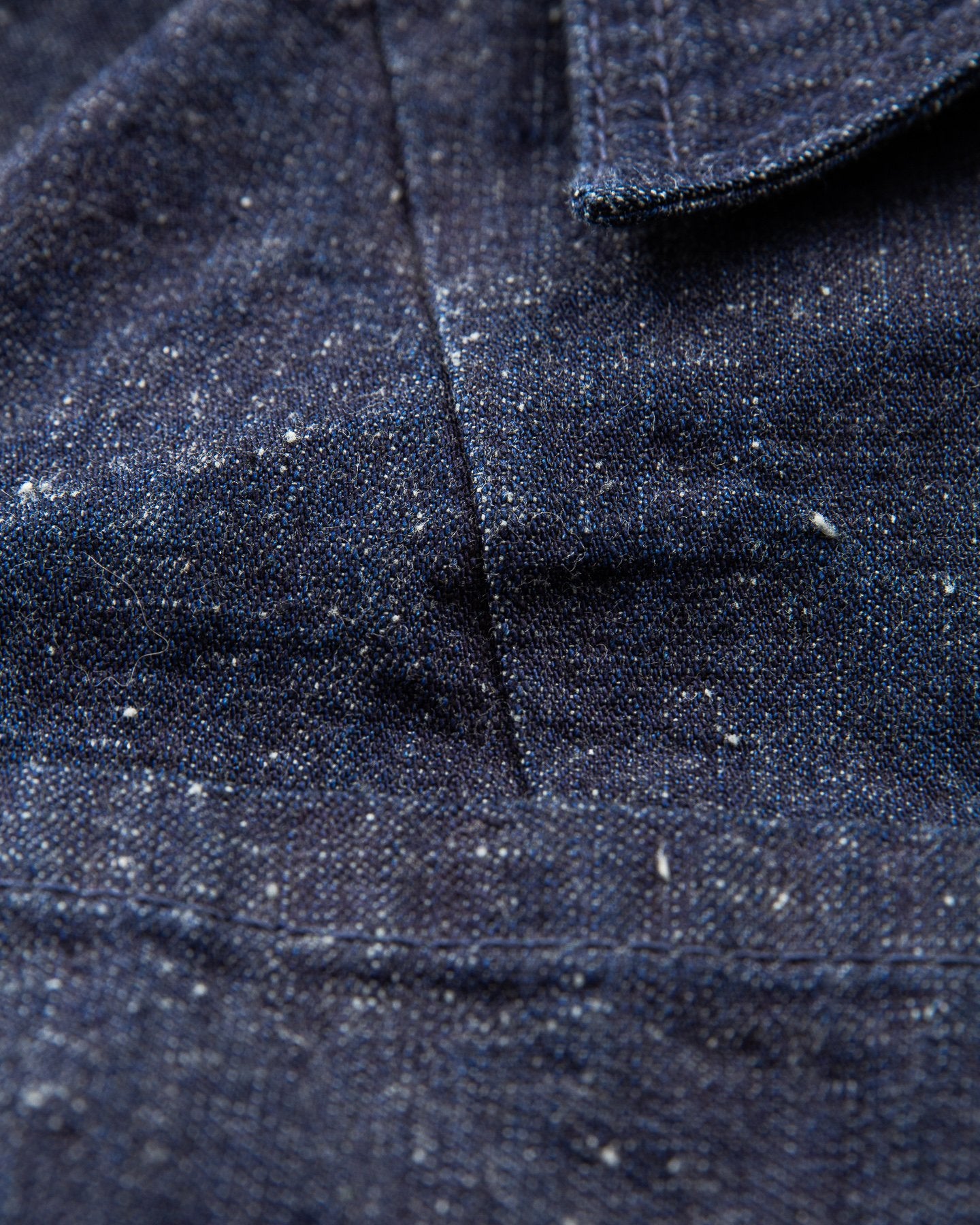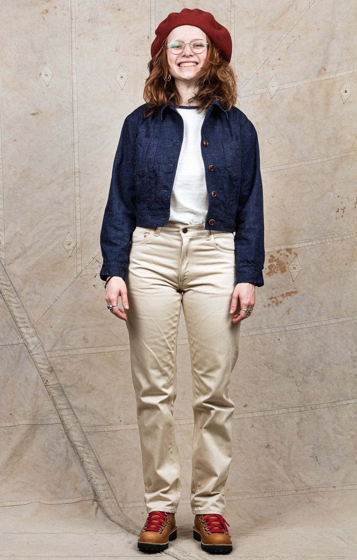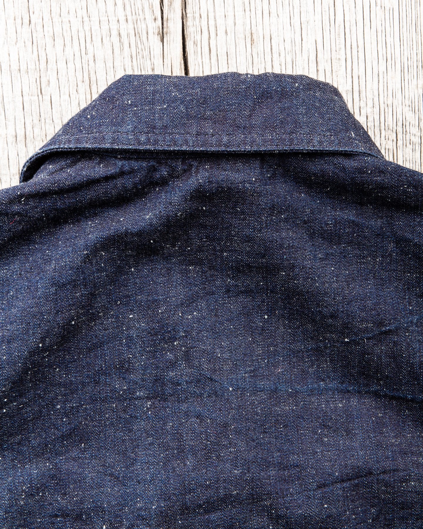 The fabric is a 10 oz Japanese grey weft nep selvage denim milled by Allblue in Japan. The denim is a reproduction of vintage JELT denim, a fabric that was popular in work wear from the middle of the last century. In the production the yarn is twisted tightly making a fine and strong thread that is woven into a sturdy twill fabric. The result is a strong fabric which is not too heavy, ideal for comfortable and long lasting work wear and denim jackets as well. The cotton used in this fabric is a blend of American & Australian cotton. Sourced for their quality, characteristics and fairness production. The warp is rope-dyed with a slightly lighter shade of indigo that's characteristic with vintage denim and the weft is dyed gray. The yarn is then slowly woven on a vintage shuttle loom.