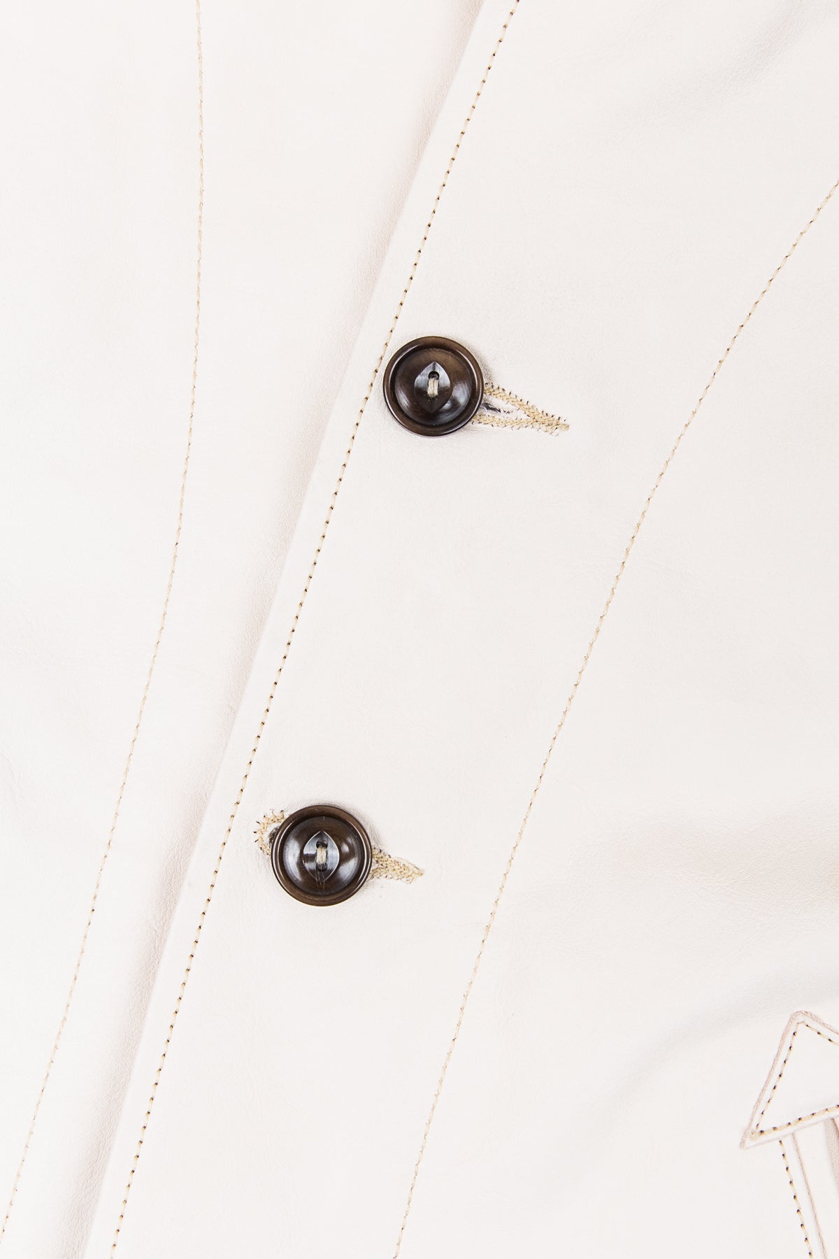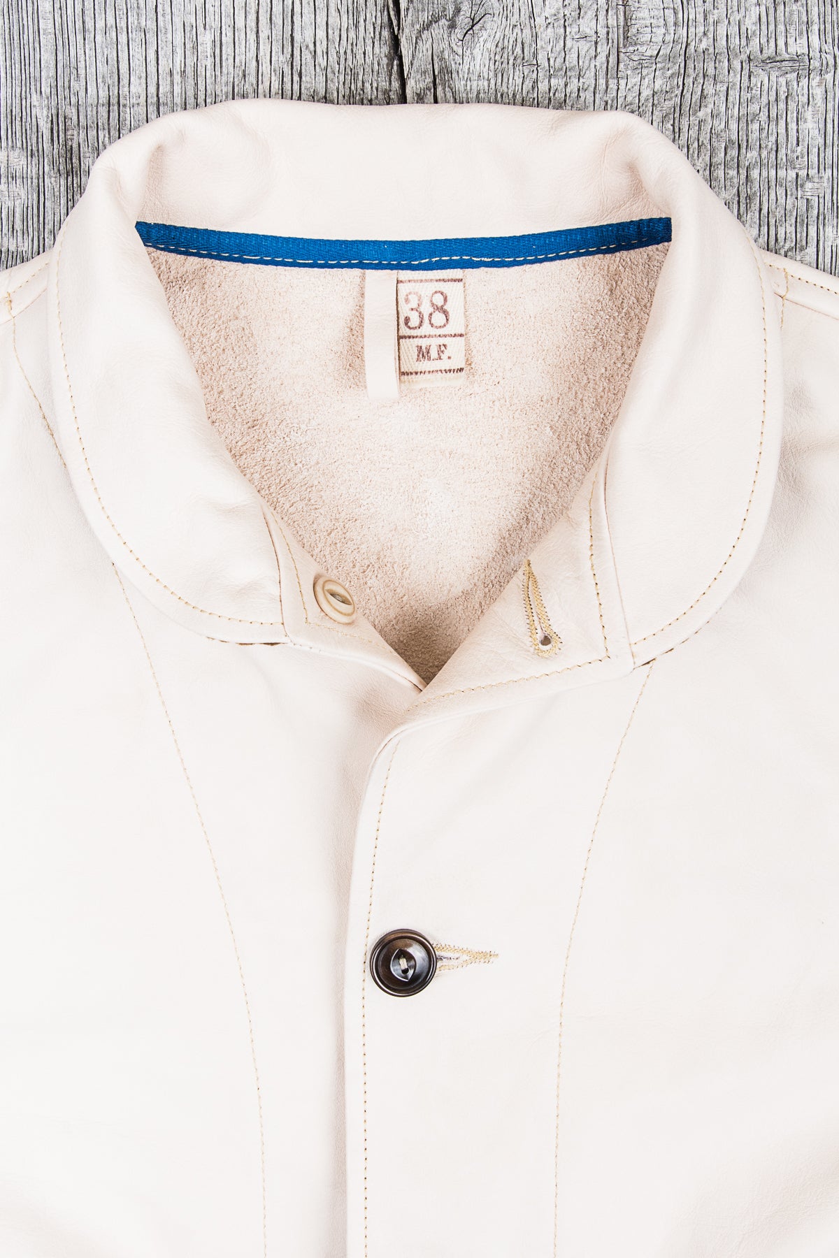 We are happy to have one of our all time favorite jackets in store once again! When we first stocked this amazing Mister Freedom leather jacket six years ago we didn't know what to expect of the aging of the leather. Soon it became clear to us that it will be hard to find a garment that will evolve in a more beautiful and personal way. From the start this vegetable tanned leather jacket is almost white and it is best described as a white canvas before an artist starts working with it. The jacket will age, get stained and darken the more you use it and we can assure you that it will be one of those garments that will get a certain spot in ones wardrobe and that you will most likely develop an attachment to it in a most unique way!