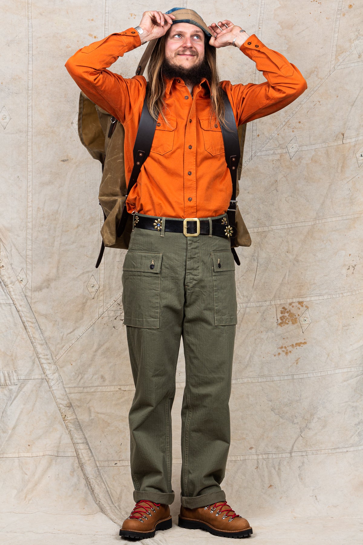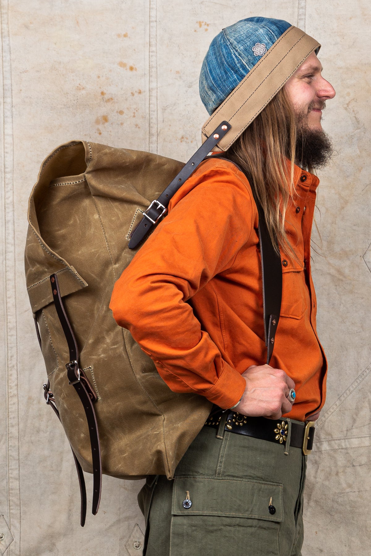 This variant is made in a waxed khaki cotton canvas fabric. The tough 15-ounce canvas construction is a very durable material that is up all kinds of challenges and outdoor activities. The leather shoulder straps are well riveted for reinforcement and the pack comes with a heavy duty 6ml poly liner and an unwaxed tumpline for your head carrying business.