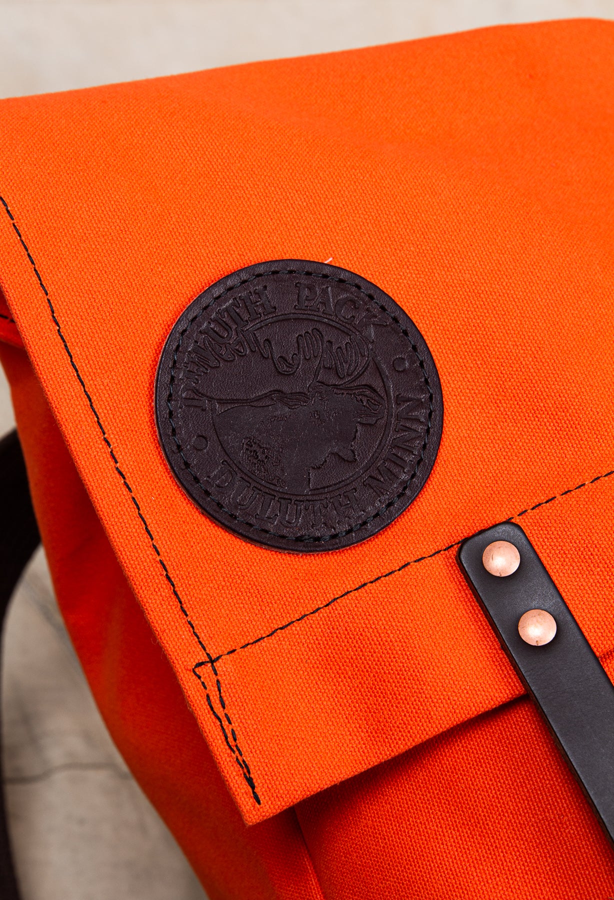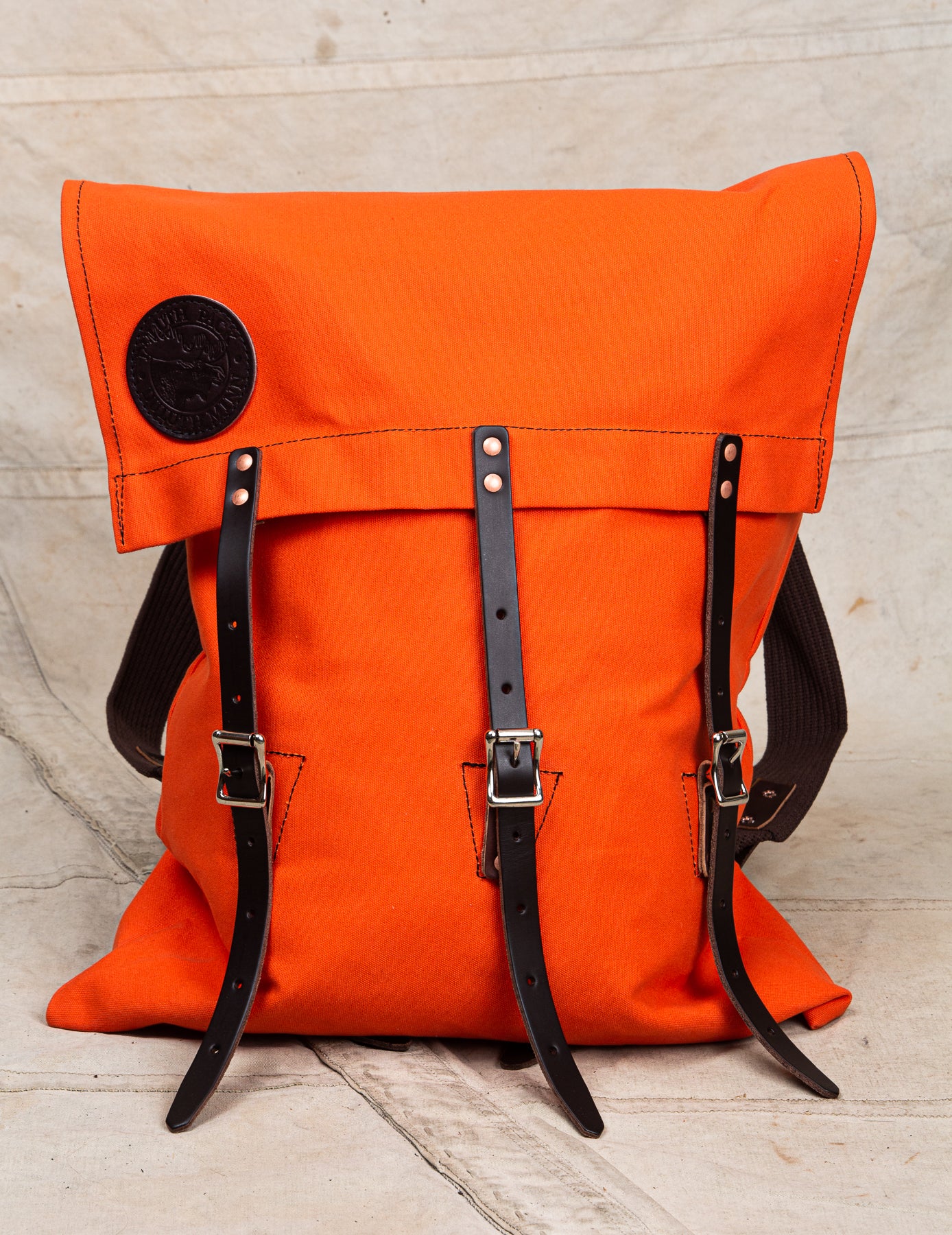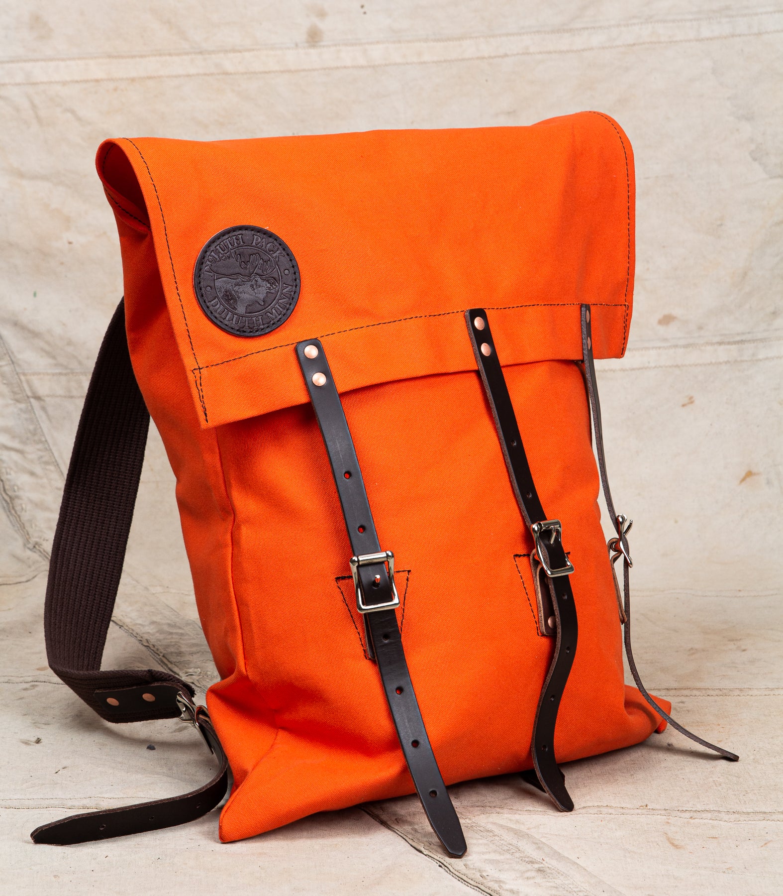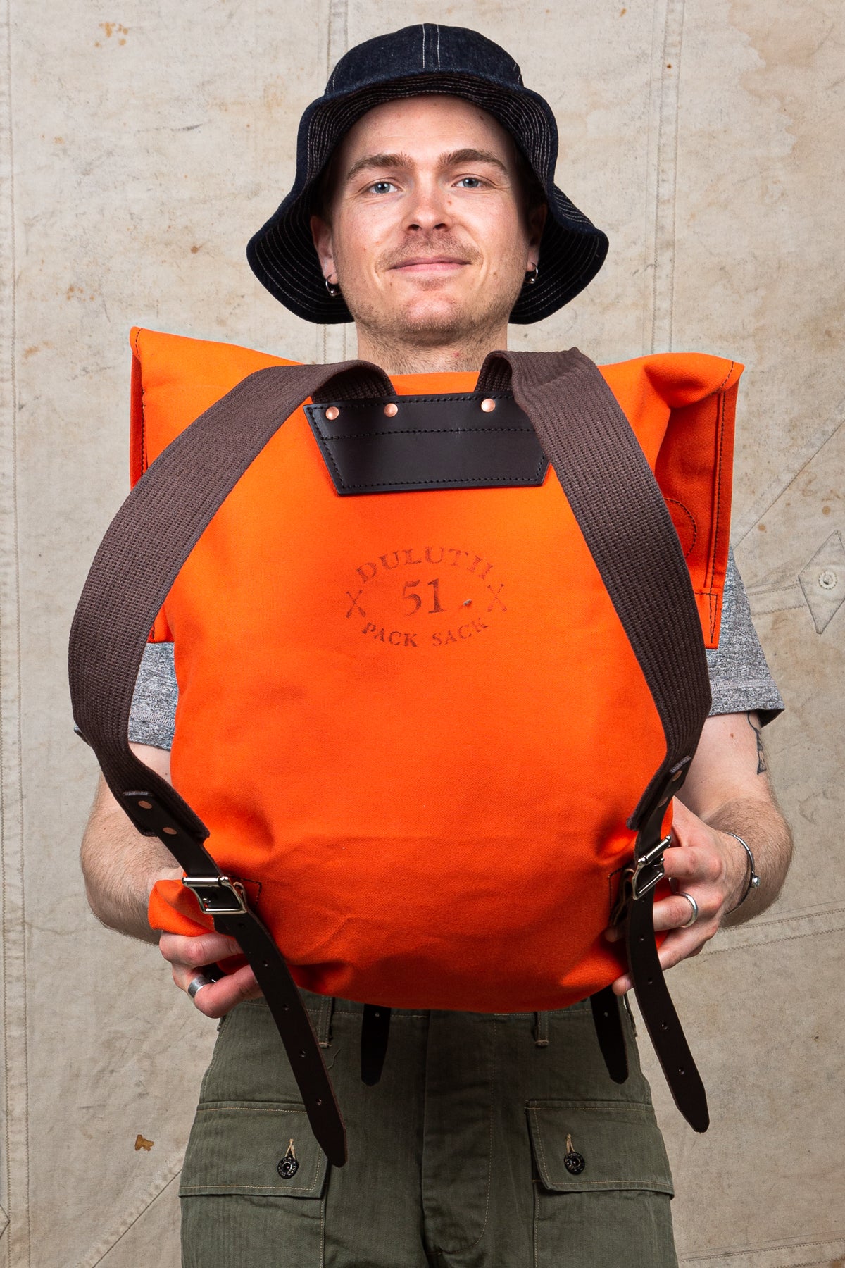 This variant is made in an unwaxed bright orange cotton canvas material. The tough 15-ounce canvas construction is a very durable material that is up all kinds of challenges and outdoor activities. Duluth Pack's made this version of the #51 model with three leather straps just for us at Second Sunrise! We think that adds just that little extra. The shoulder straps are easy to adjust while wearing the pack.