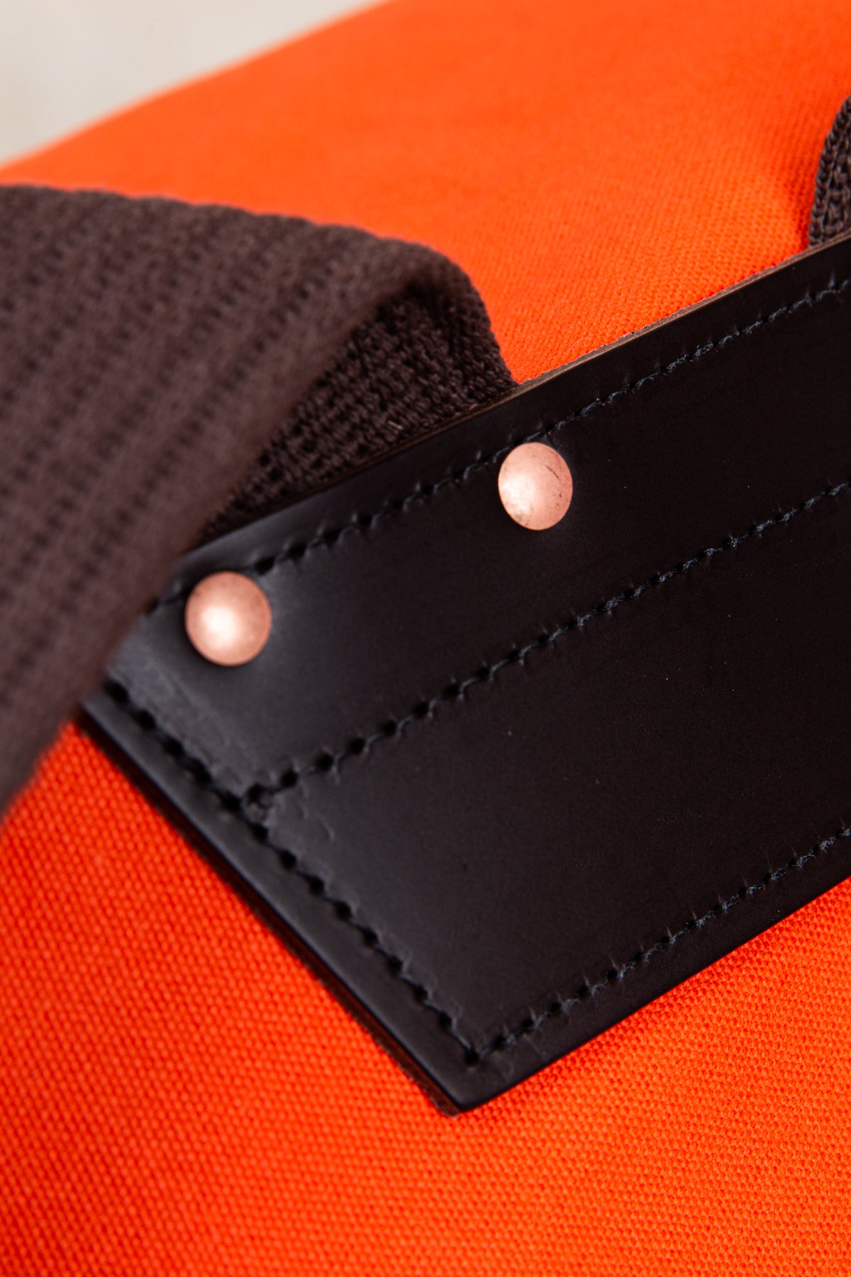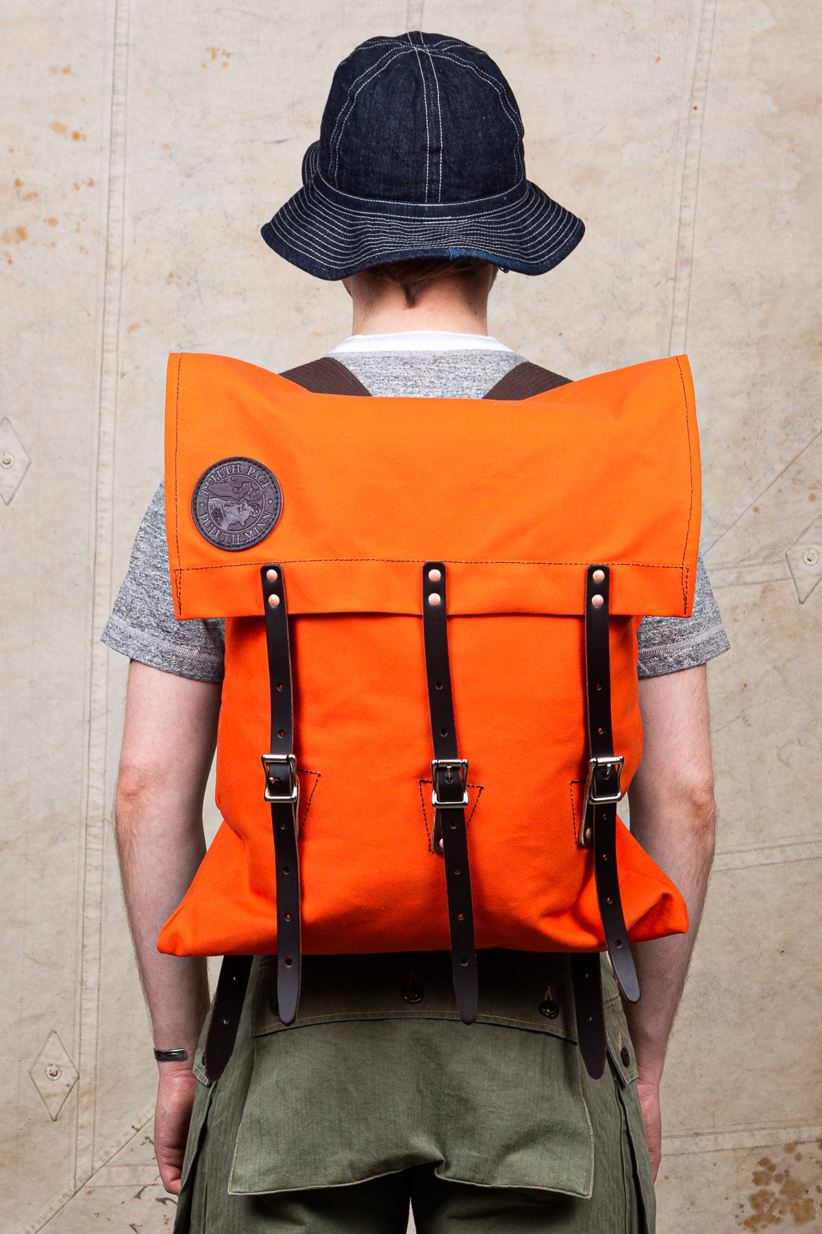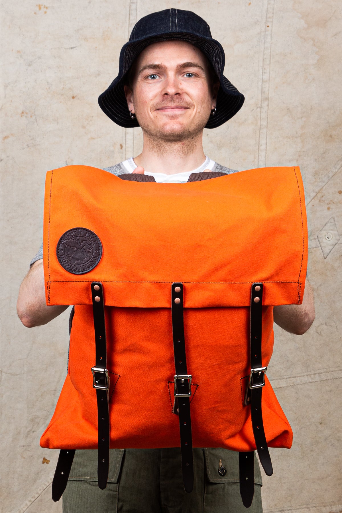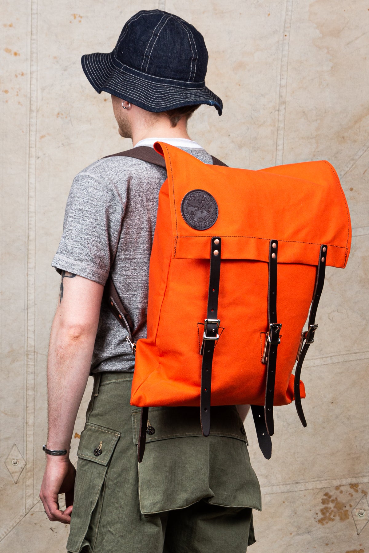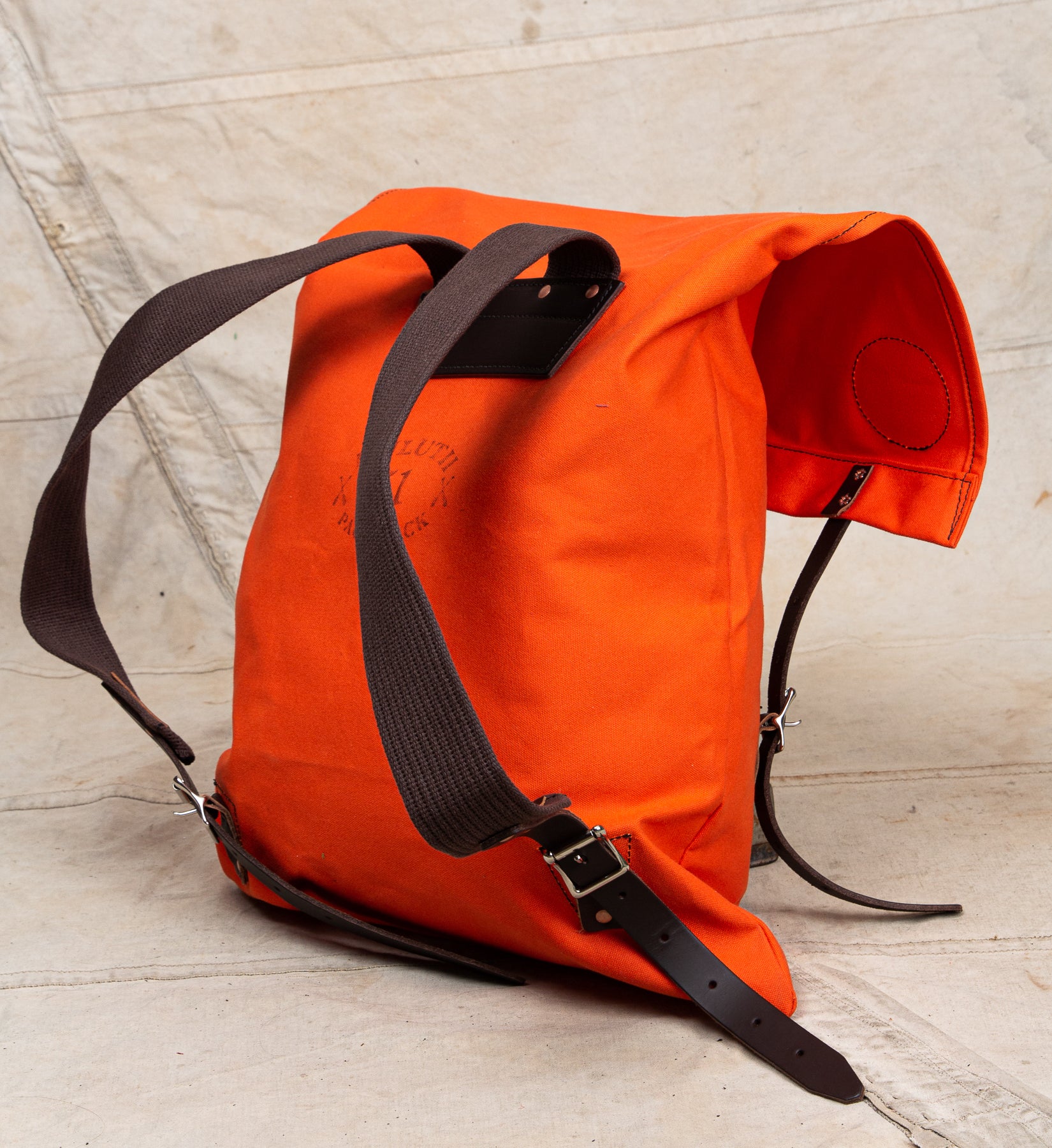 This variant is made in an unwaxed bright orange cotton canvas material. The tough 15-ounce canvas construction is a very durable material that is up all kinds of challenges and outdoor activities. Duluth Pack's made this version of the #51 model with three leather straps just for us at Second Sunrise! We think that adds just that little extra. The shoulder straps are easy to adjust while wearing the pack.