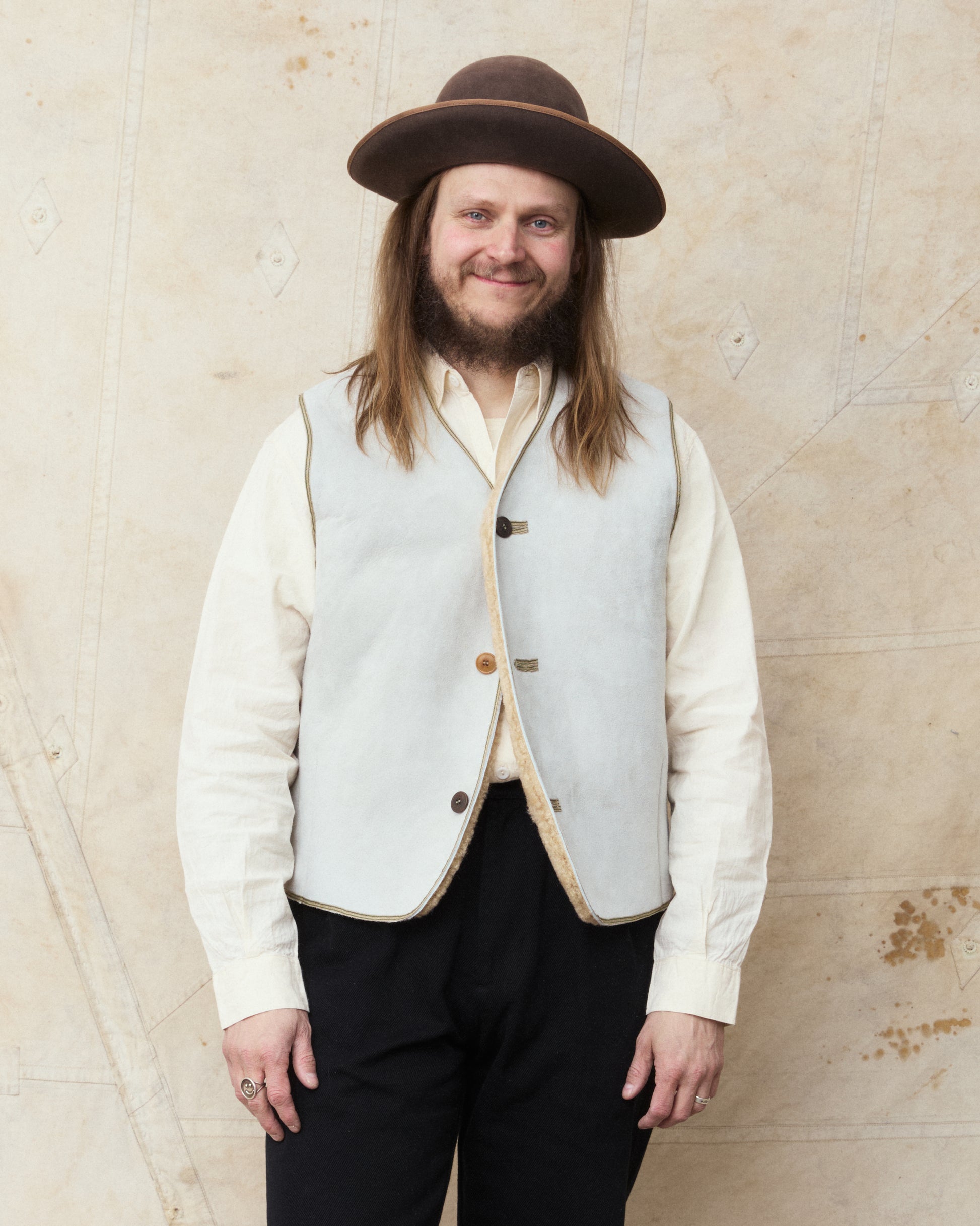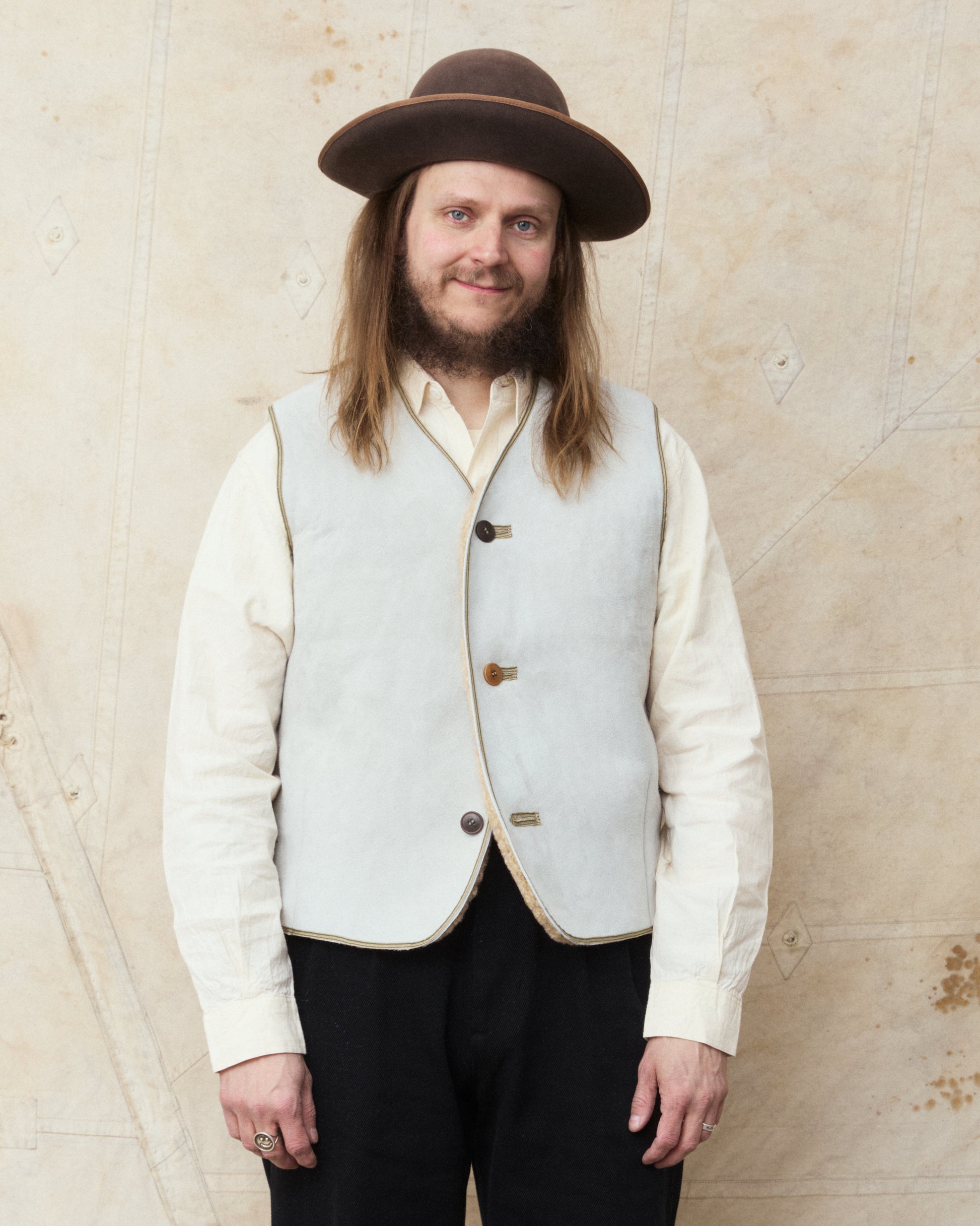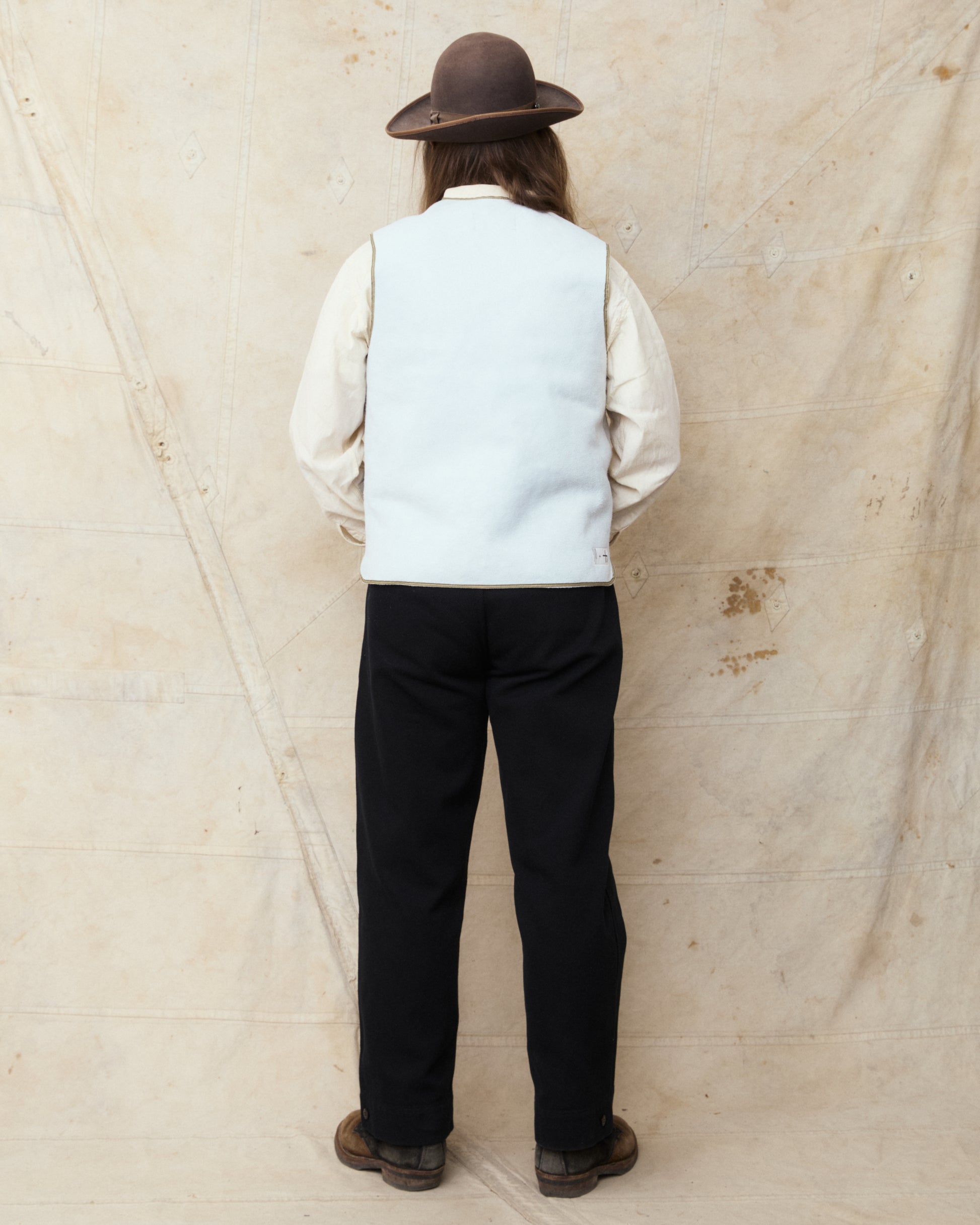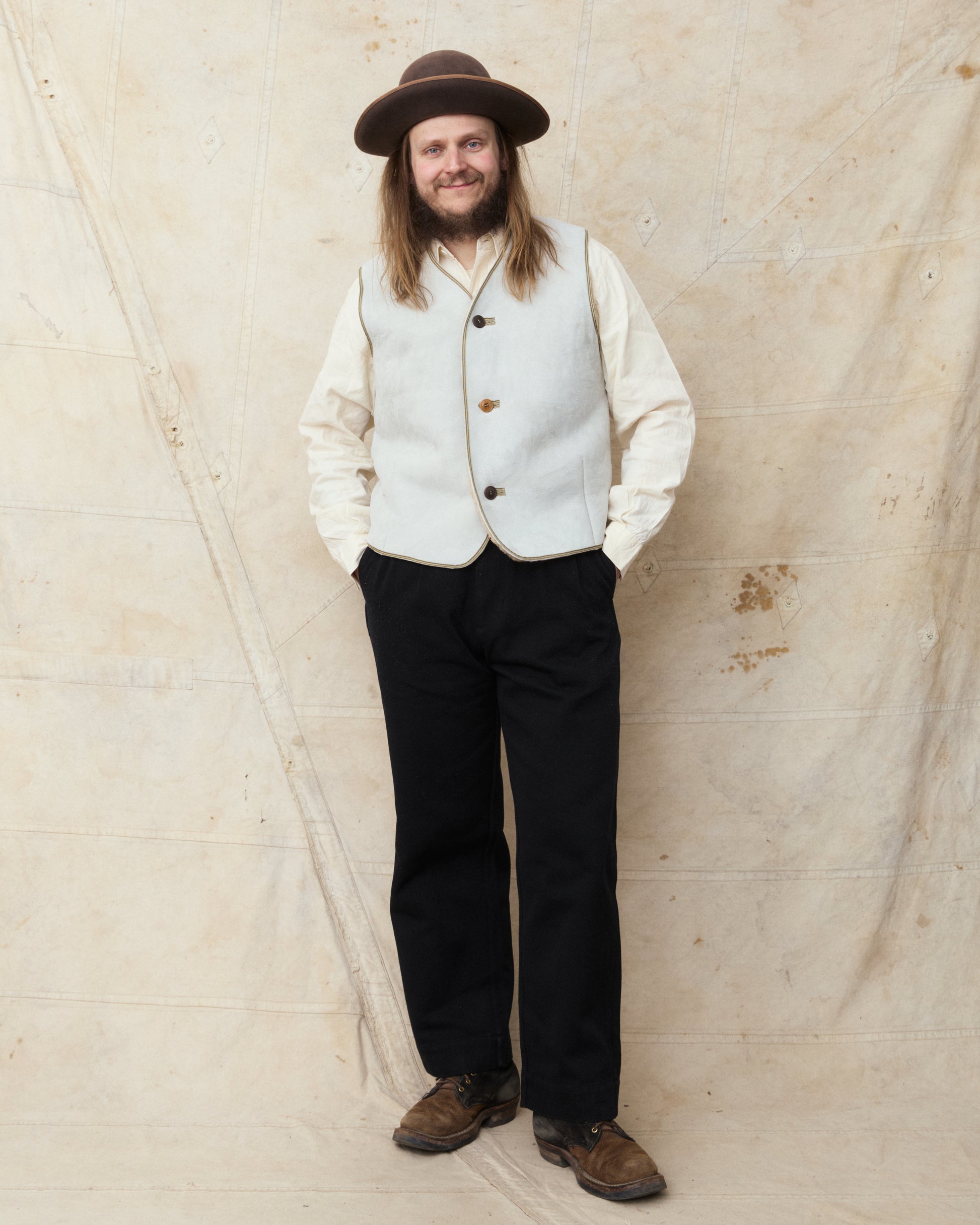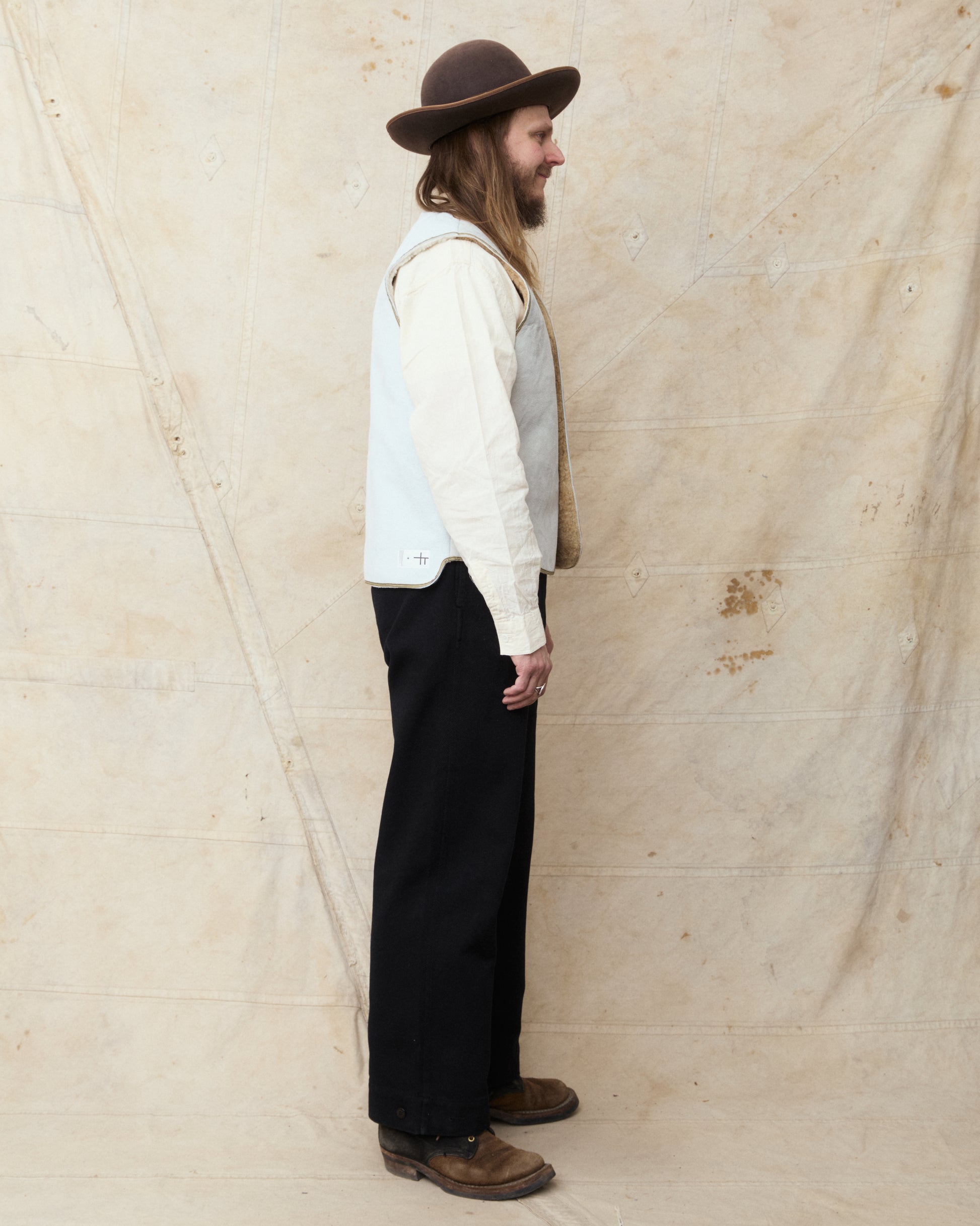 Douglas is 180 cm tall, weighs 87 kilos and wears a size L. He combines the vest with a pair of Gråbrodern Eke Chino Italian Black Twill, Buzz Rickson's chambray shirt and a pair of custom White's Dress Boots.