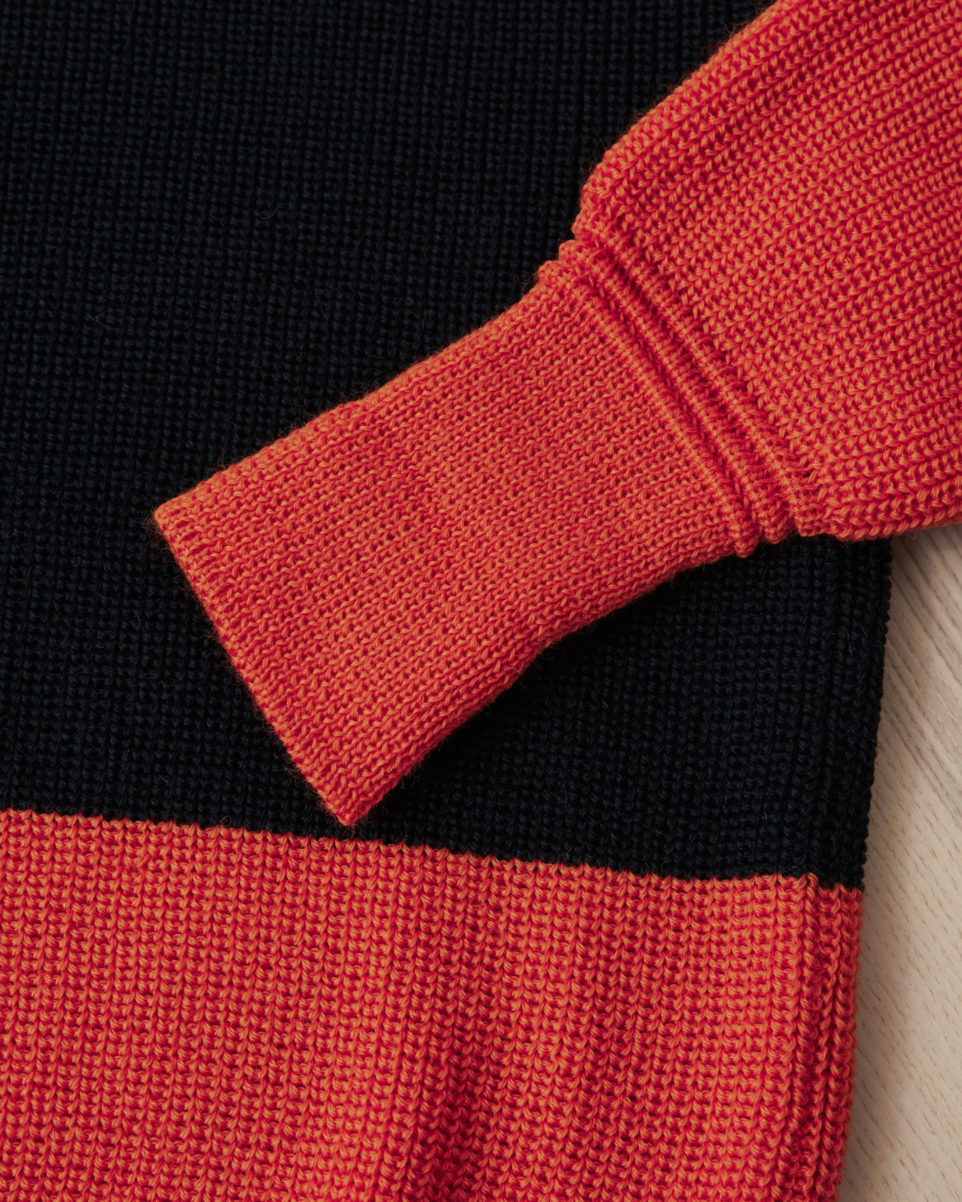 The inspiration for this sweater comes from vintage sailing and pit crew sweaters. These where often made out of bold colors, so to be as visible as possible.