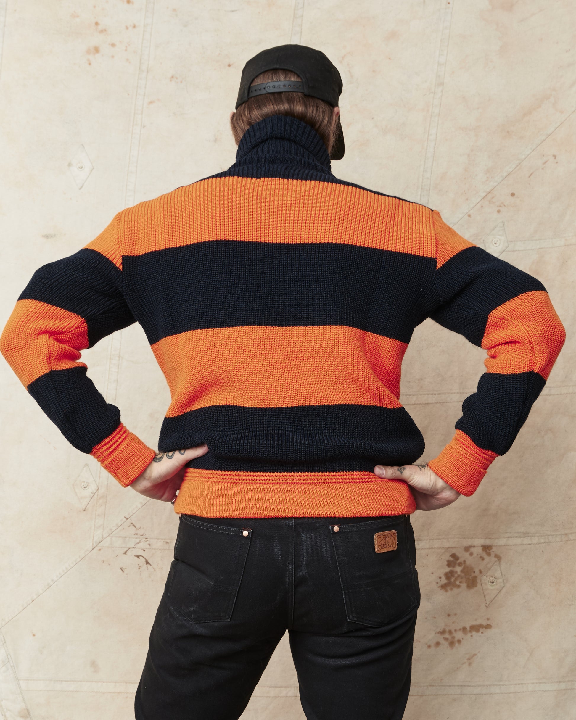 The inspiration for this sweater comes from vintage sailing and pit crew sweaters. These where often made out of bold colors, so to be as visible as possible.