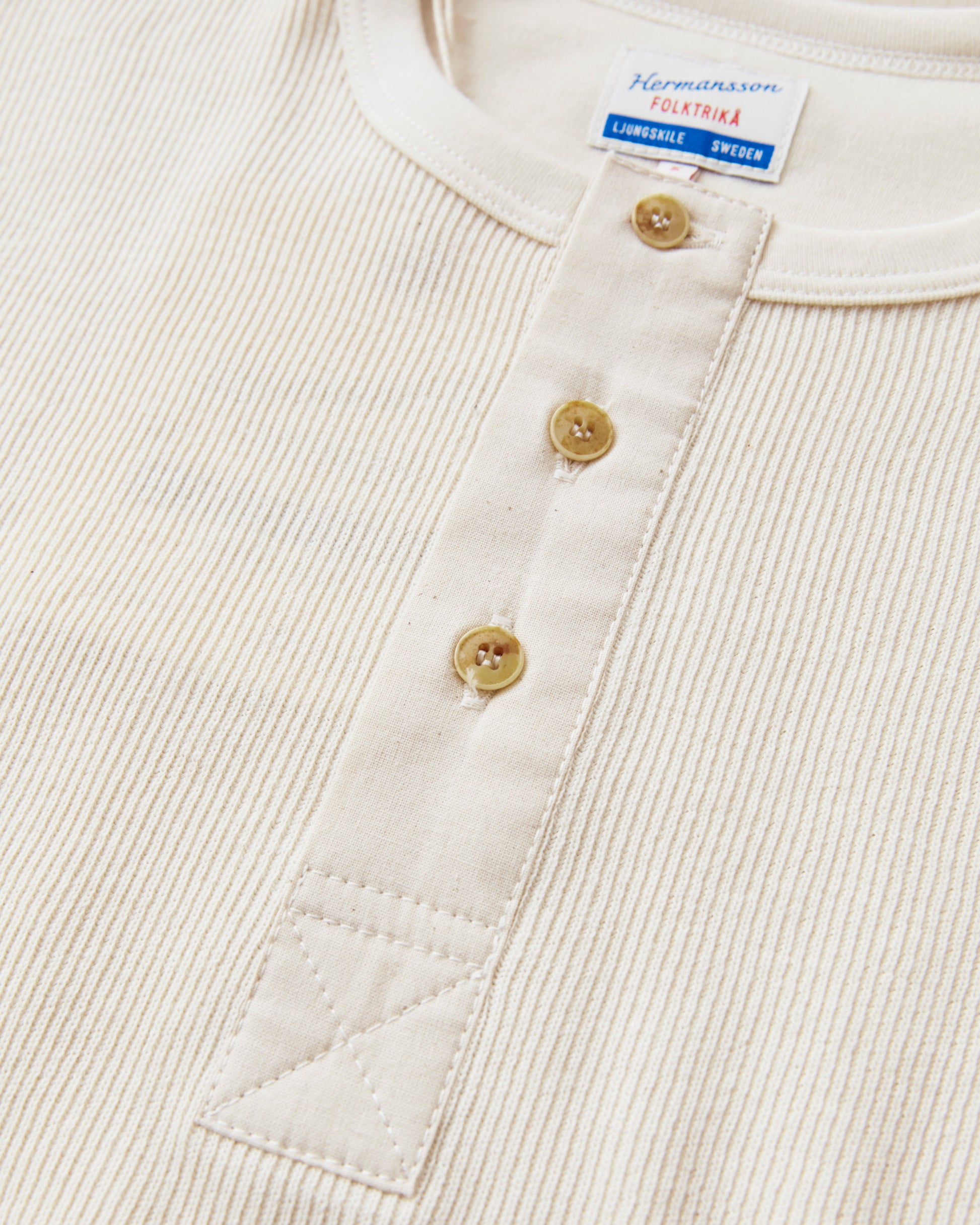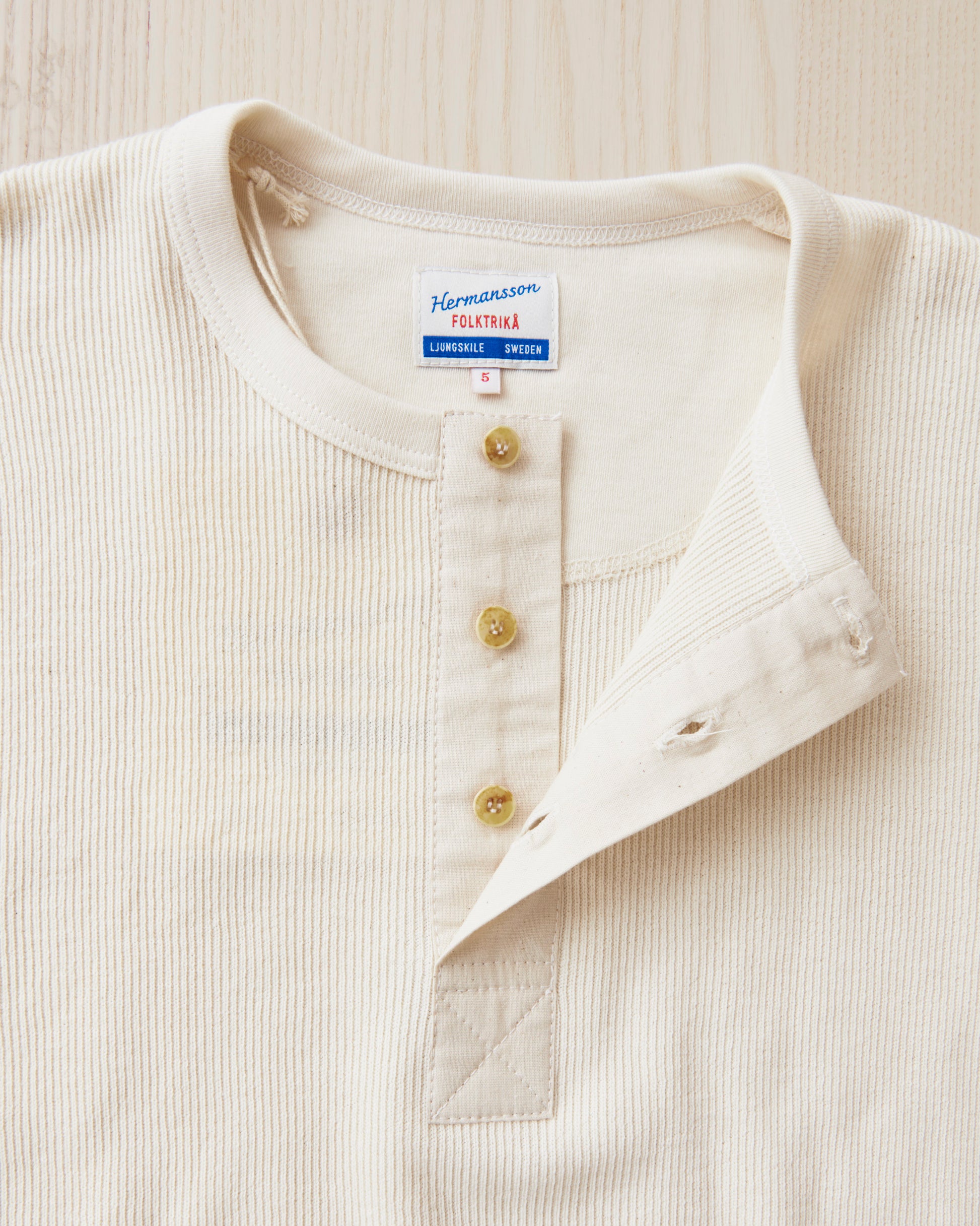 This is a long sleeve henley shirt made in a ribbed cotton fabric. It's got a three button front close and a slim cut, perfect to wear under a shirt or as a layering piece for added warmth. The garment is knitted, cut and sewn in Ljungskile, Sweden.
