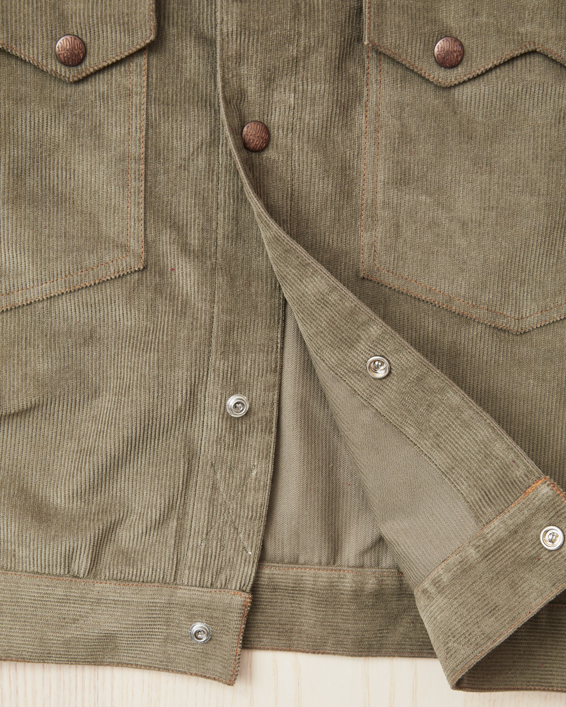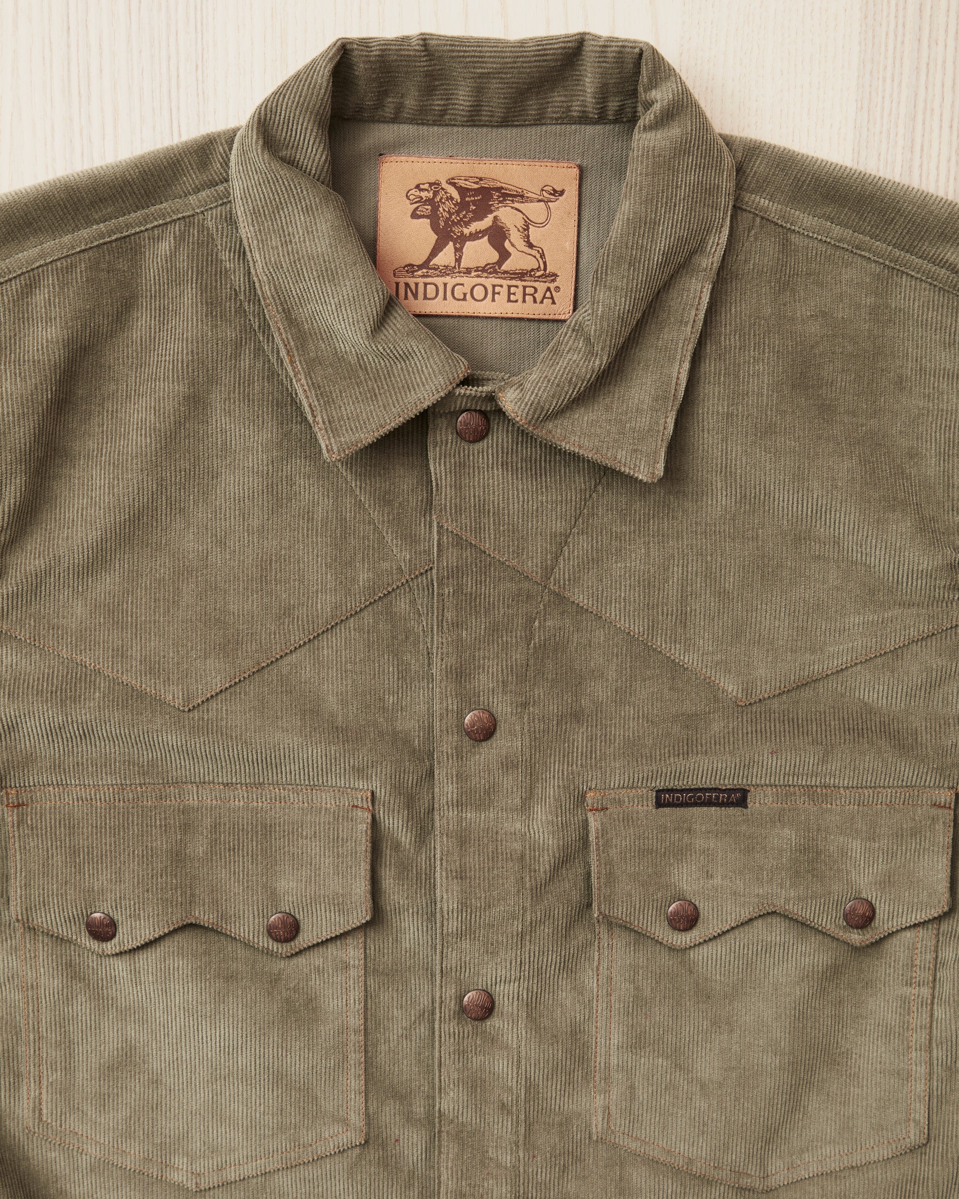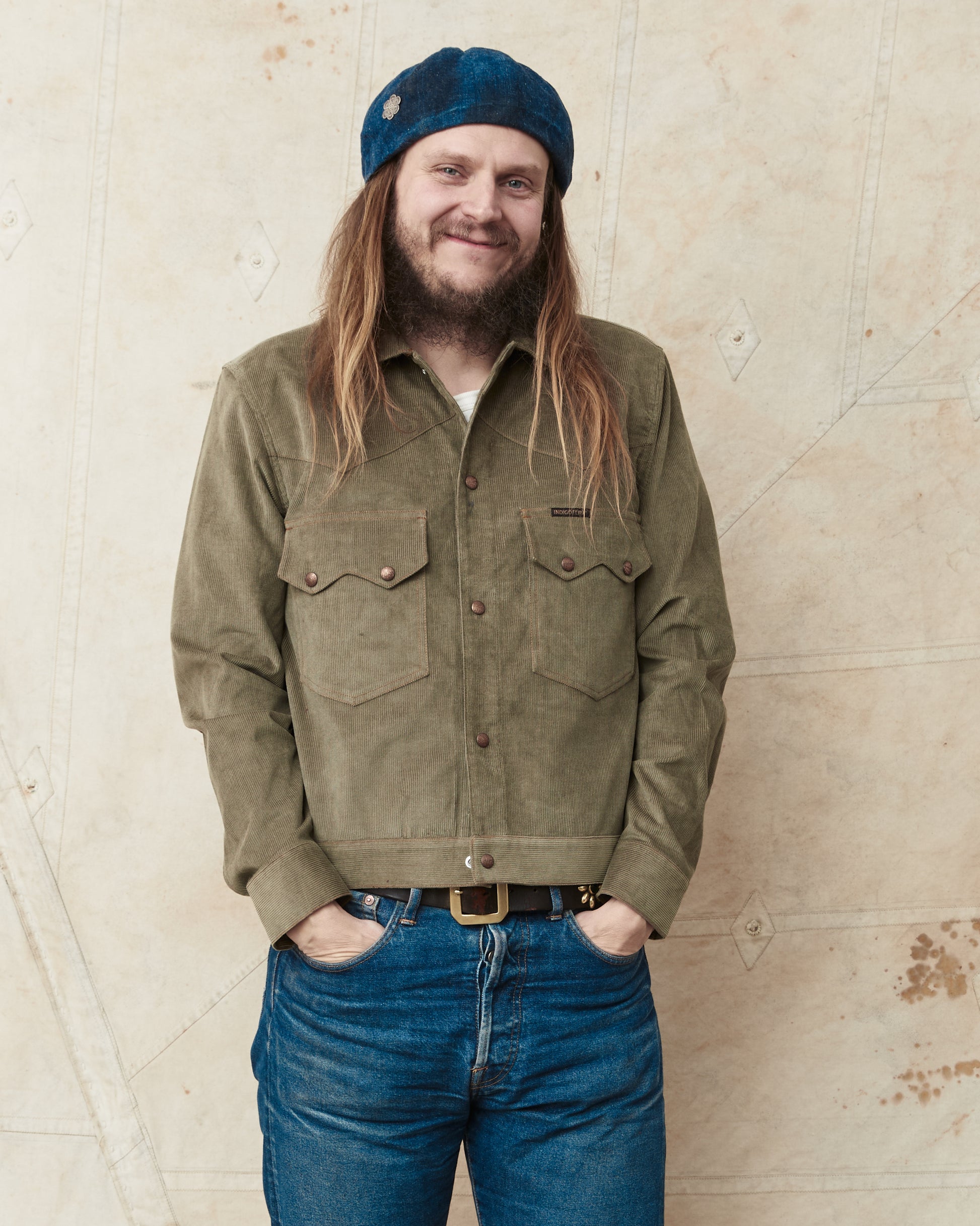 The fabric is a fantastic corduroy quality in an incredibly nice steel gray with a green hue, Indigofera calls this color Stone Green. This looks perfect in combination with both well-worn blue jeans. In our opinion, a nice jacket that has a unique spot in the wardrobe, with its combination of western style details, being waist long and with two large and functional breast pockets.