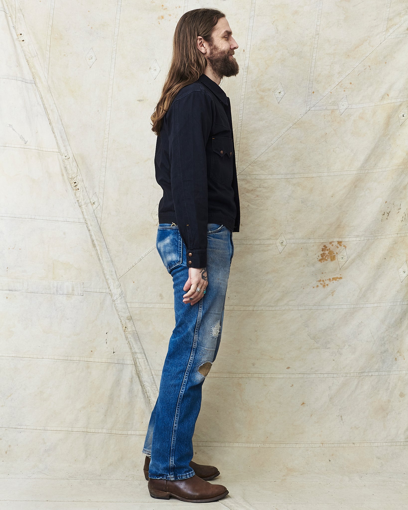 The fabric used is a black 10,5oz Japanese selvage woven at the mill Nihon Menpu in Japan. This fabric is called Soot Black and it´s a soft and comfortable fabric and this version of the jacket is sold rinsed.