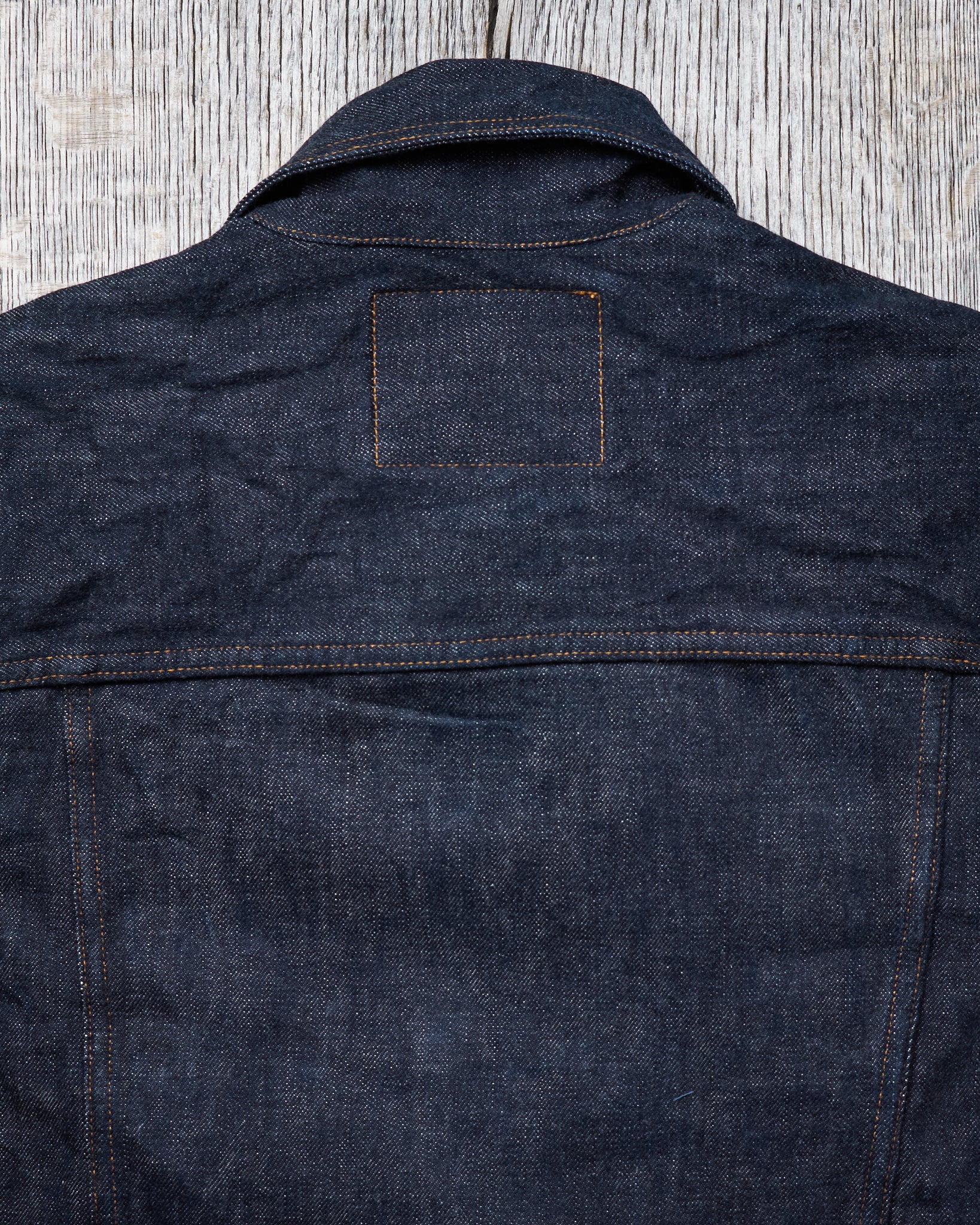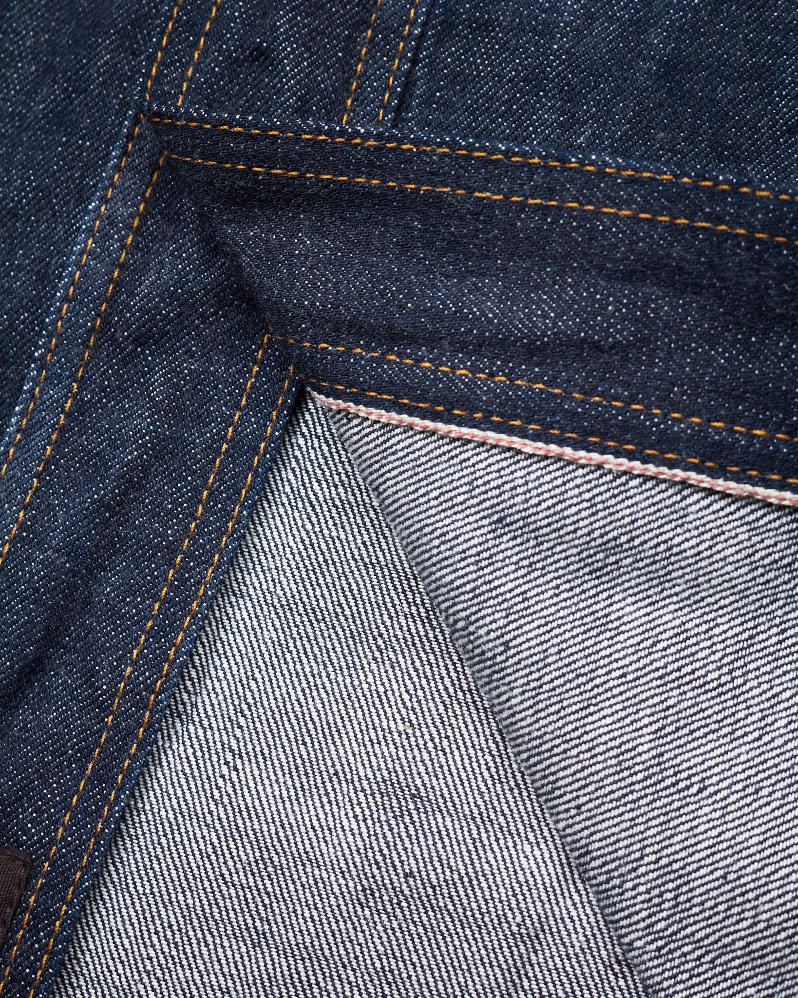 Fabric No. 3, S.T.P.F is the name of the fabric used, an 11,5 Oz selvage denim, Milled in Japan. The fabric has a natural irregular texture due to the low tension weavingprocess.