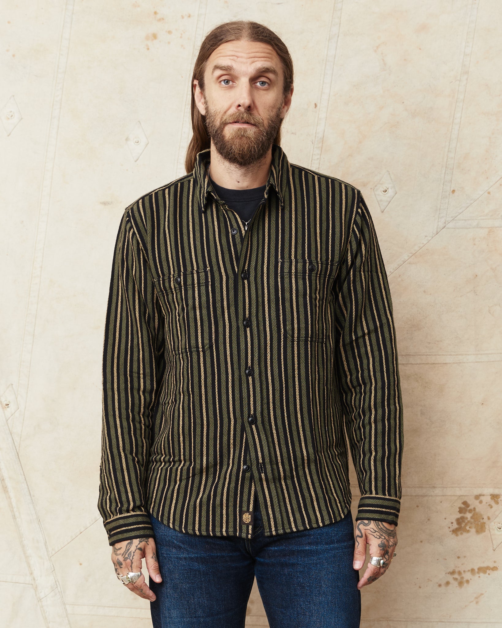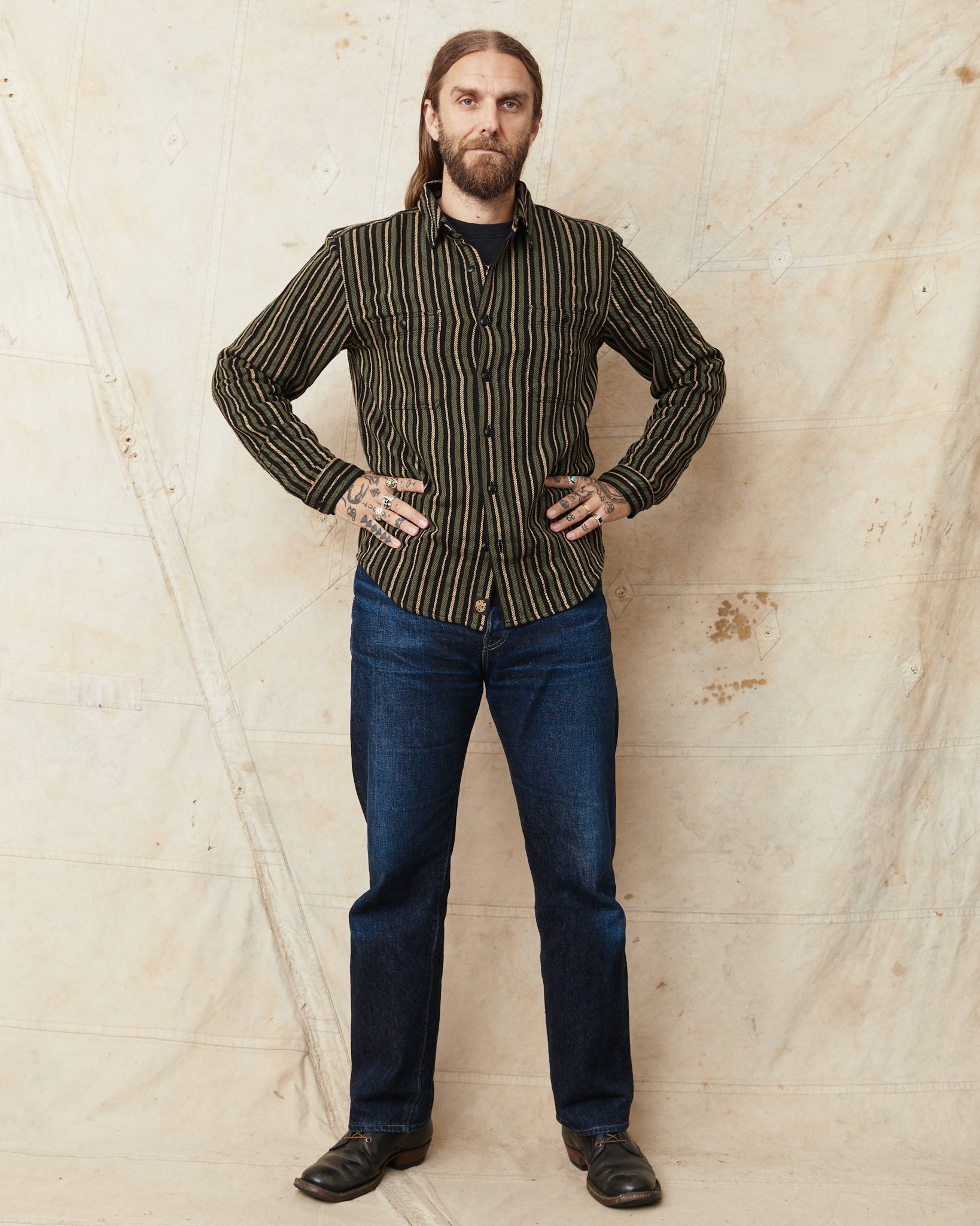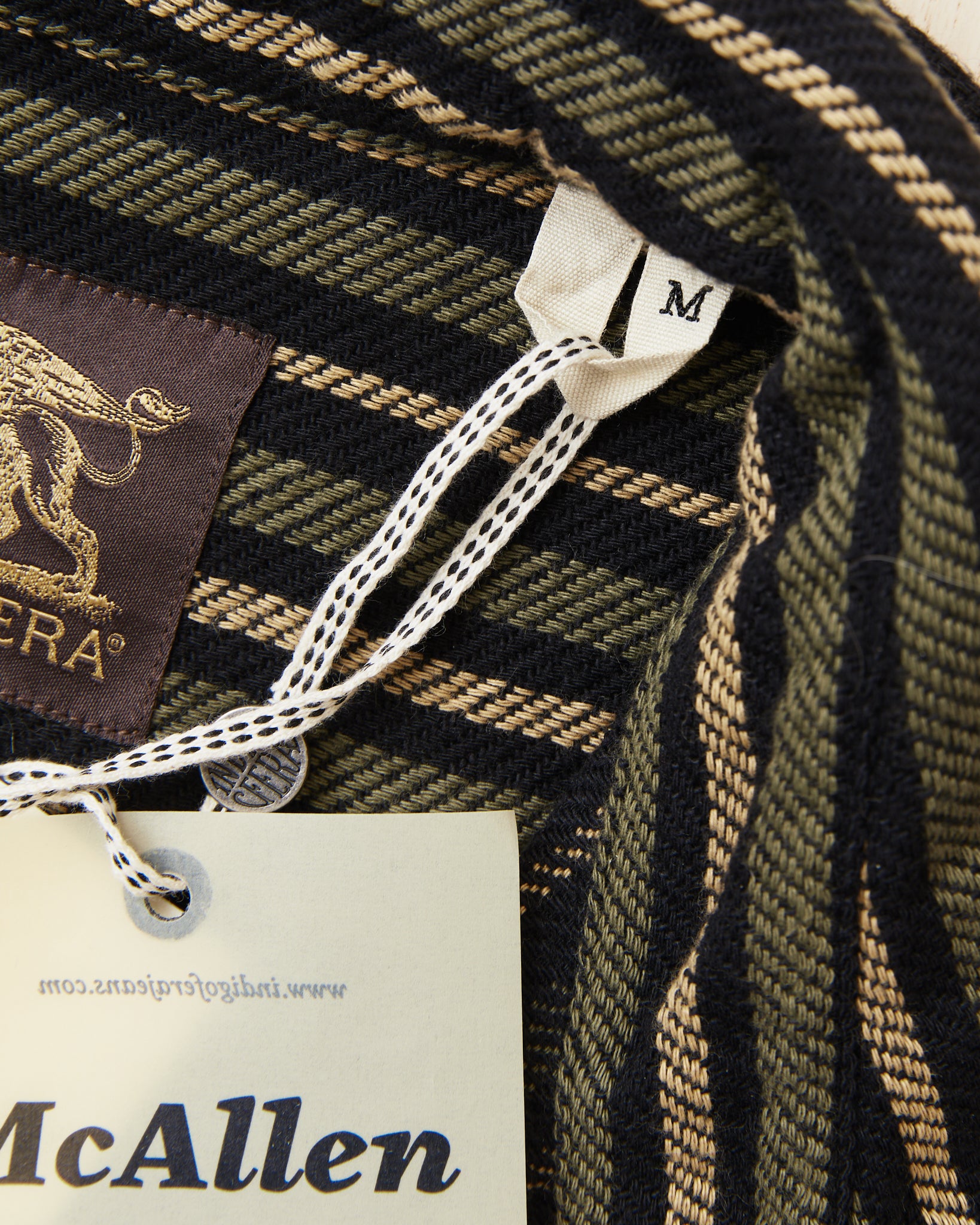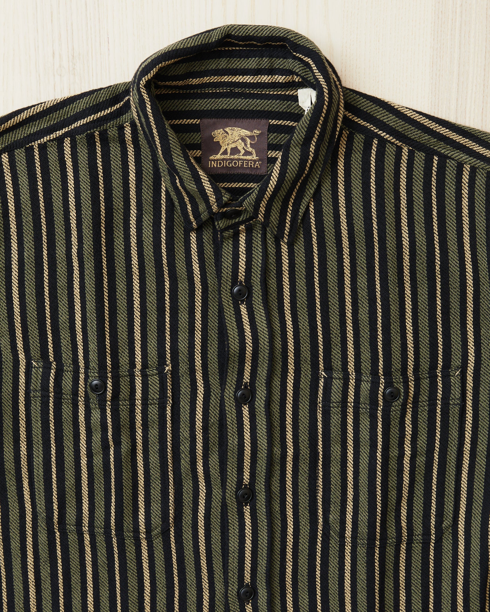 The McAllen shirt is a classic workwear shirt made by Indigofera. This version comes in a cotton twill fabric. The stripes gives a little 70's feel. The shirt is very soft and comfortable and can be worn outside of ones pants, or tucked in. It has two buttoned chest pockets.