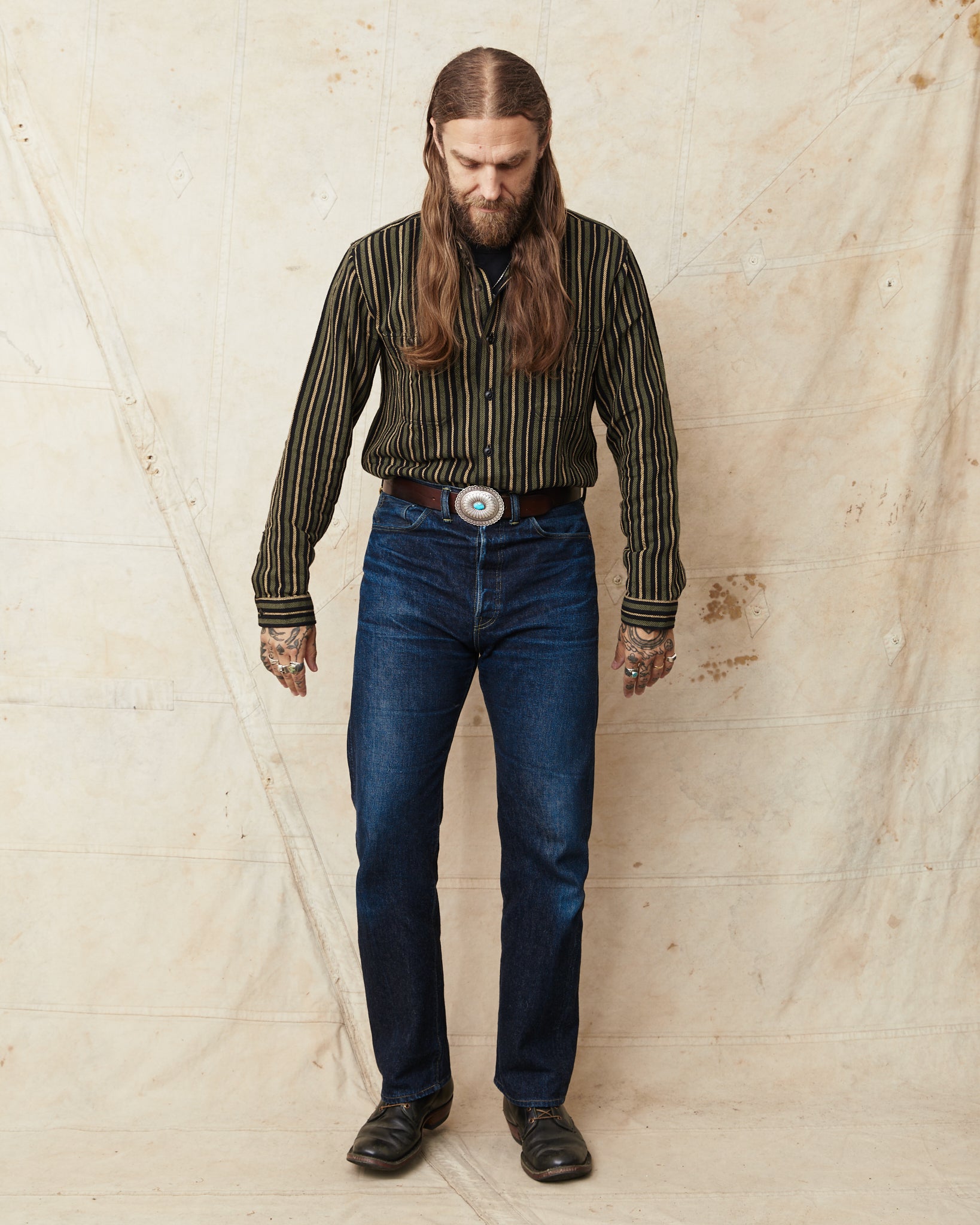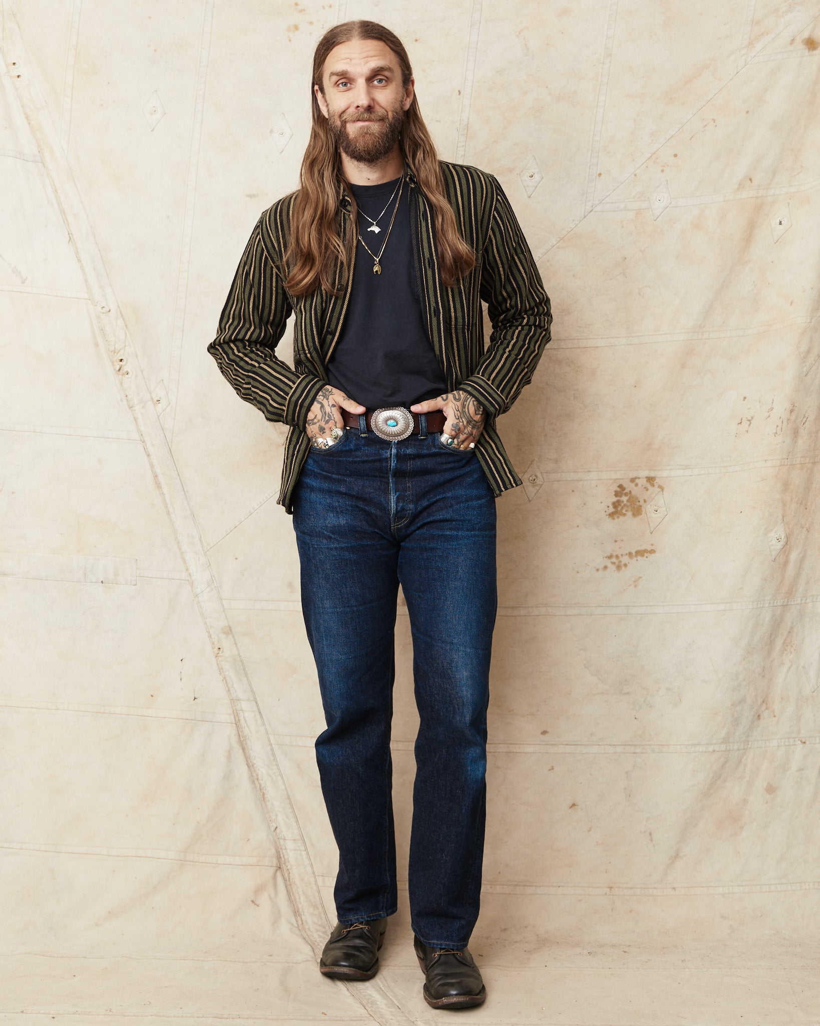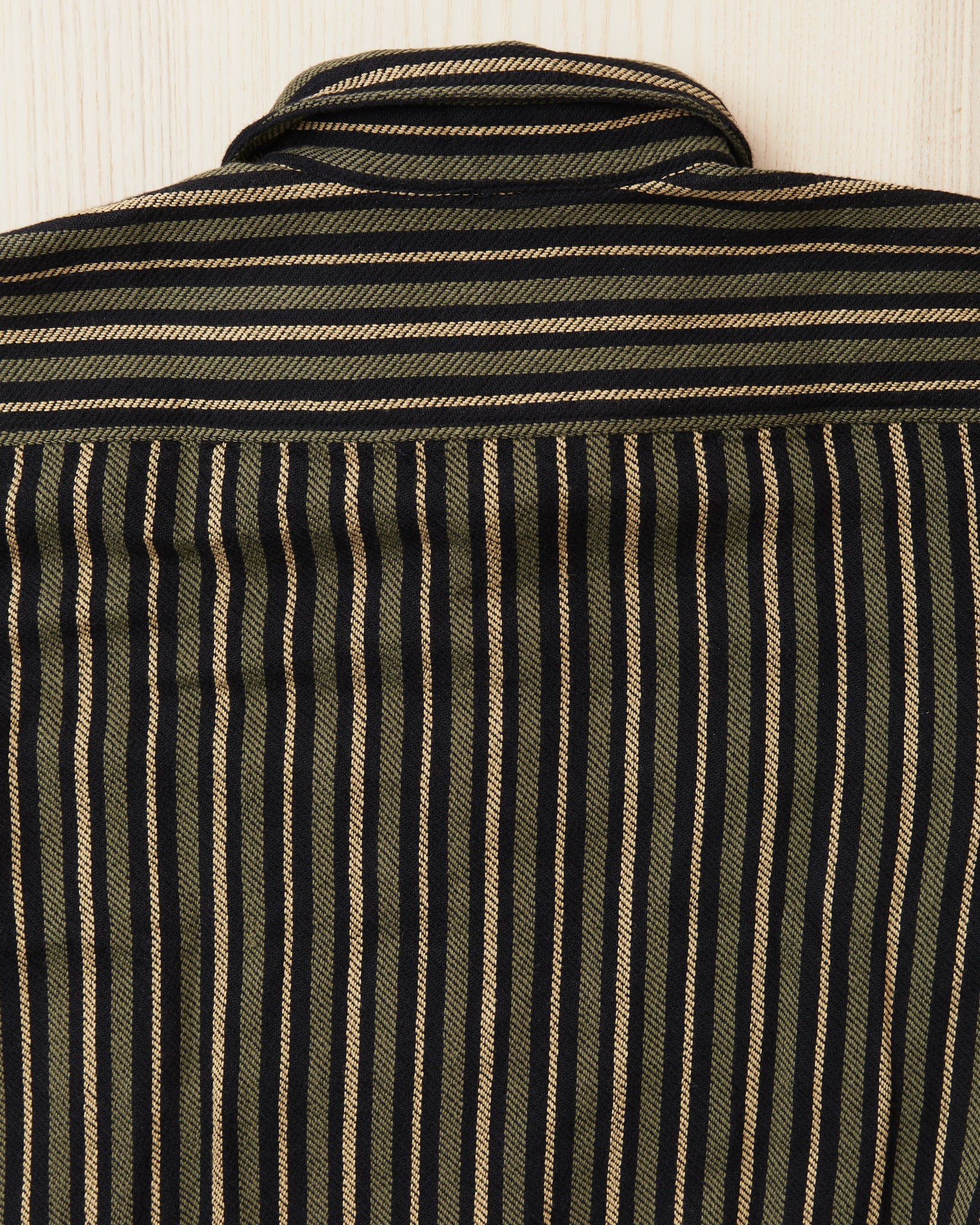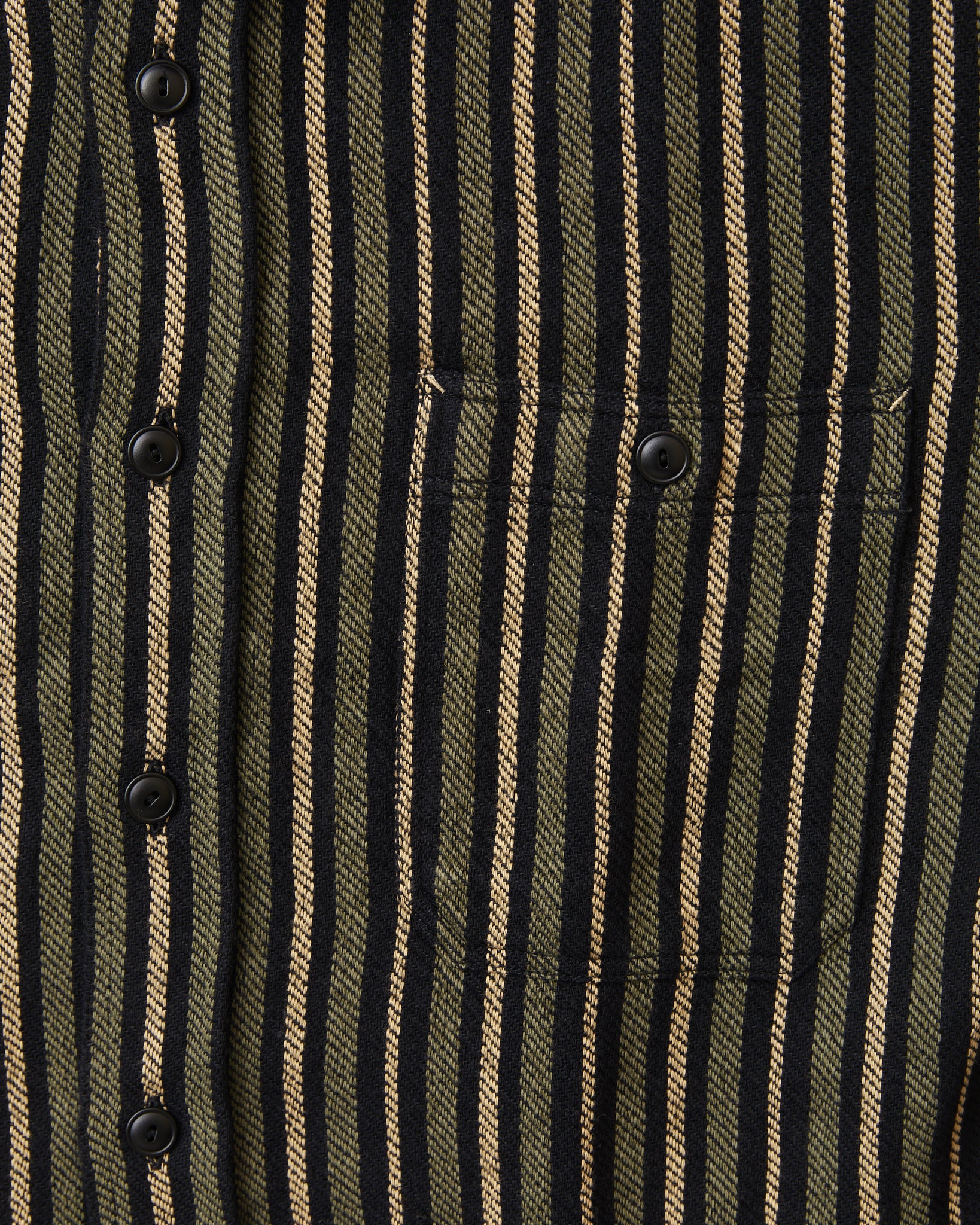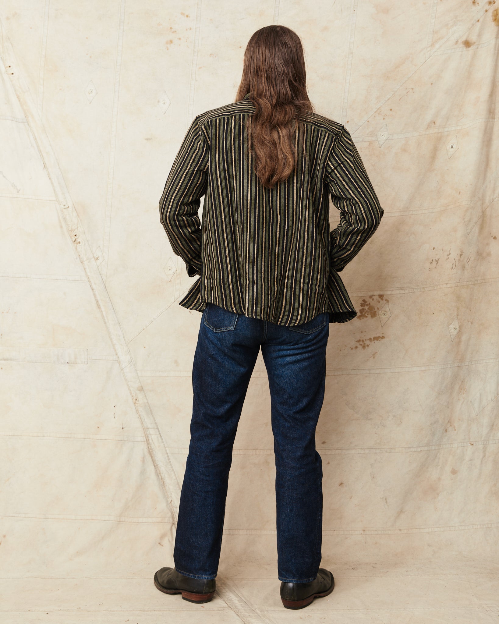 The McAllen shirt is a classic workwear shirt made by Indigofera. This version comes in a cotton twill fabric. The stripes gives a little 70's feel. The shirt is very soft and comfortable and can be worn outside of ones pants, or tucked in. It has two buttoned chest pockets.