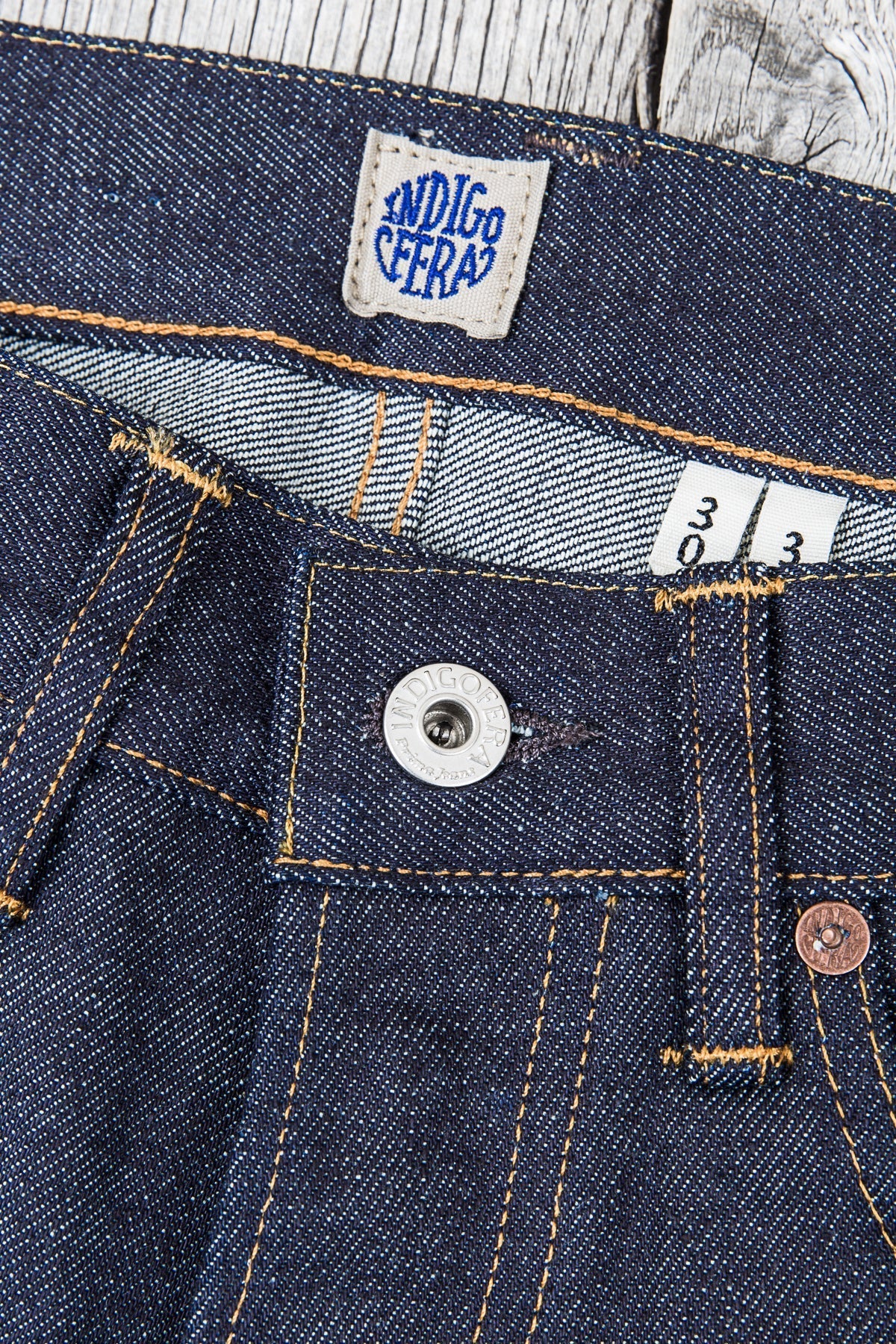 This version of Nash is sewn in a 13oz Japanese indigo selvage denim. The selvedge has the double red line, a detail that now has became synonymous with Indigofera. It is said that the color of the line was originally used by the mills to determine which fabric was ordered by which customer. According to legend, Levi's was red, Lee was blue and Wrangler was green. The fabric has a thickness of 13 oz making it super comfortable to wear and with time it will shape to the body in a great way!