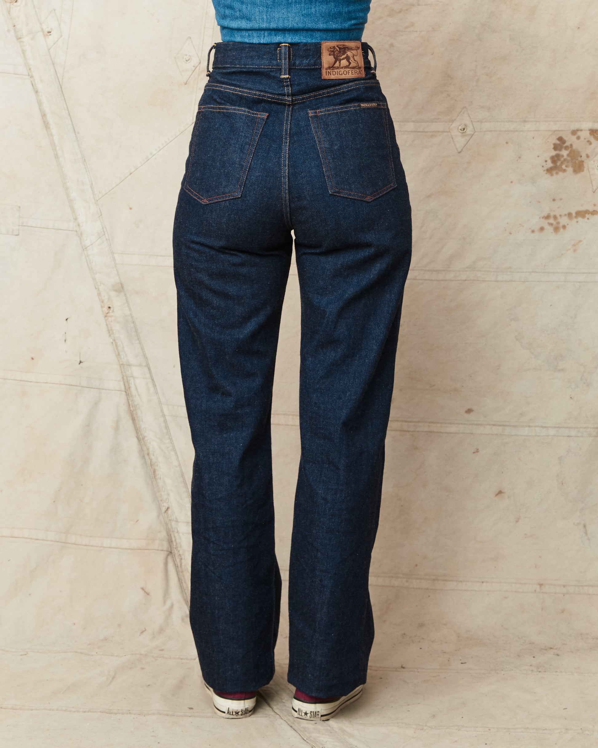 In our collection we have an old vintage original Levi's 701 from the 50's and we lent these to Indigofera because we wanted to see how they could make their own interpretation of these and now finally we have seen the result of their work. With a high waist, made in 100% cotton and cut with a curve that gives room for hips and seat without a gape at the waist.