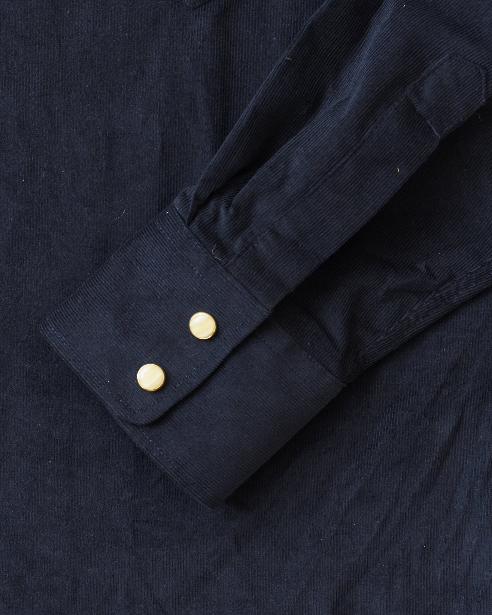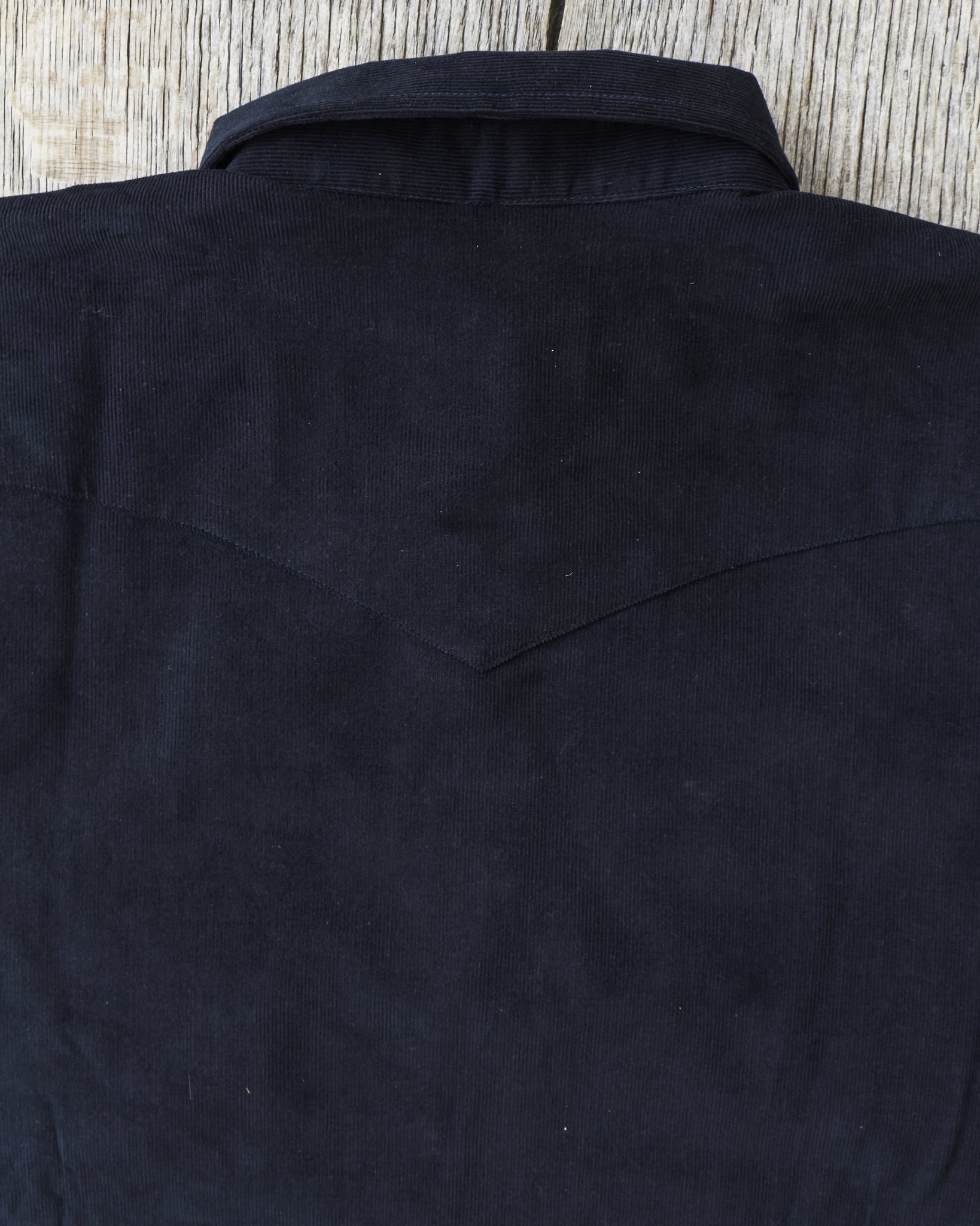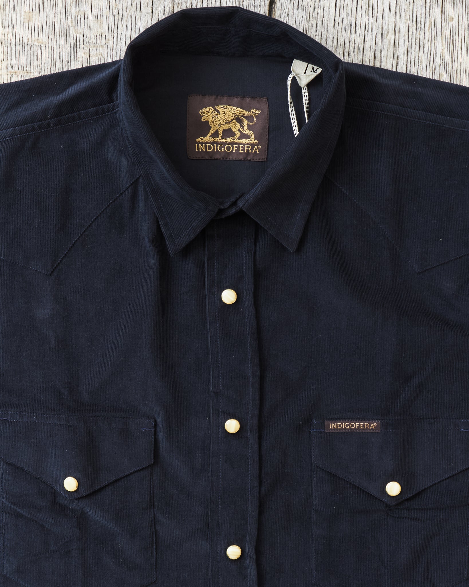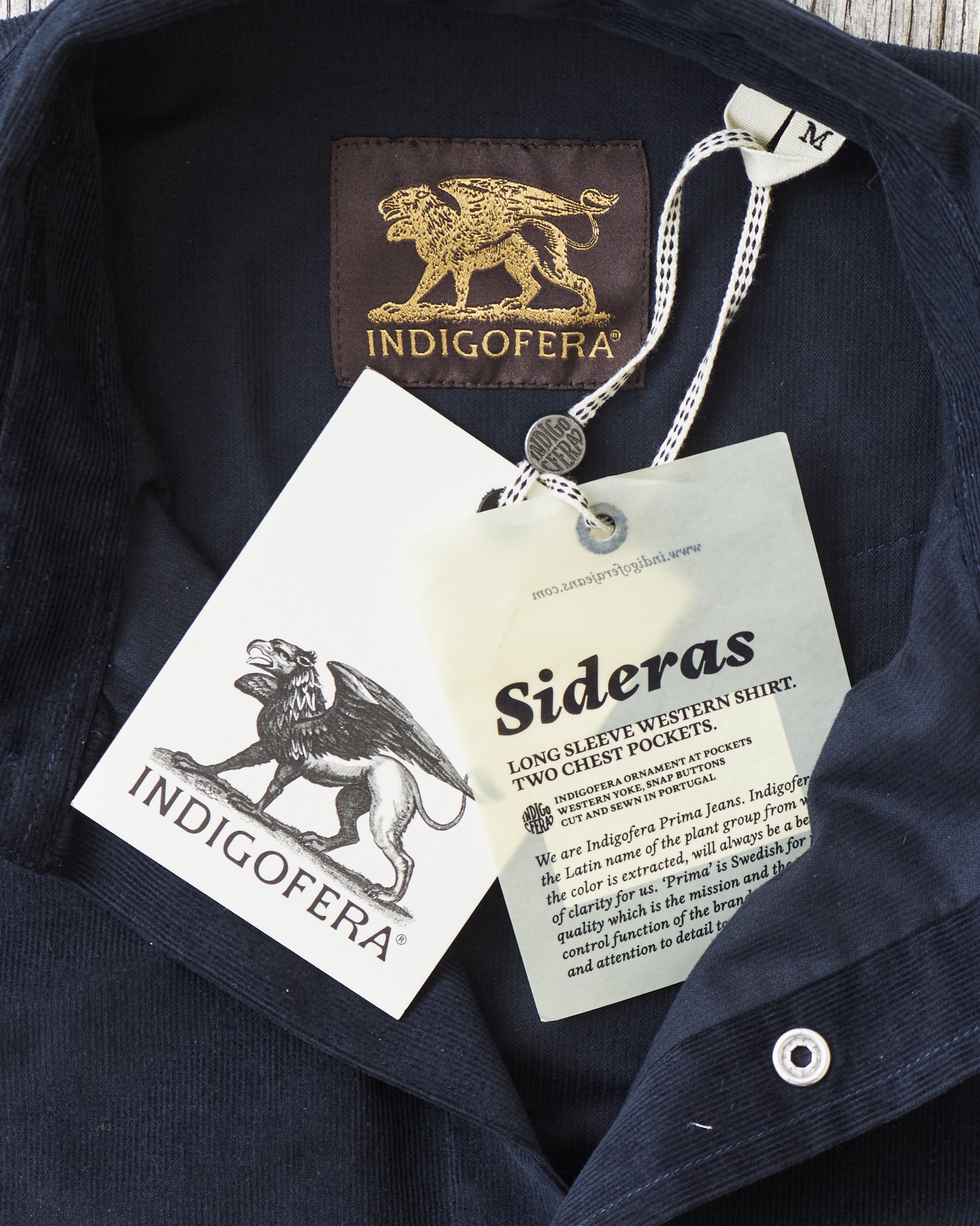 Sideras is a shirt from our friends at Indigofera. It´s truly a good looking western shirt with all the good details, western yoke, pearl snap buttons & a great look. This one is made out of a fine corduroy in a quite thin material. Very nice to wear. The fit is normal with a classic long tail, perfect to tuck into your pants. The color is called Navy and it´s a very dark, almost black color.