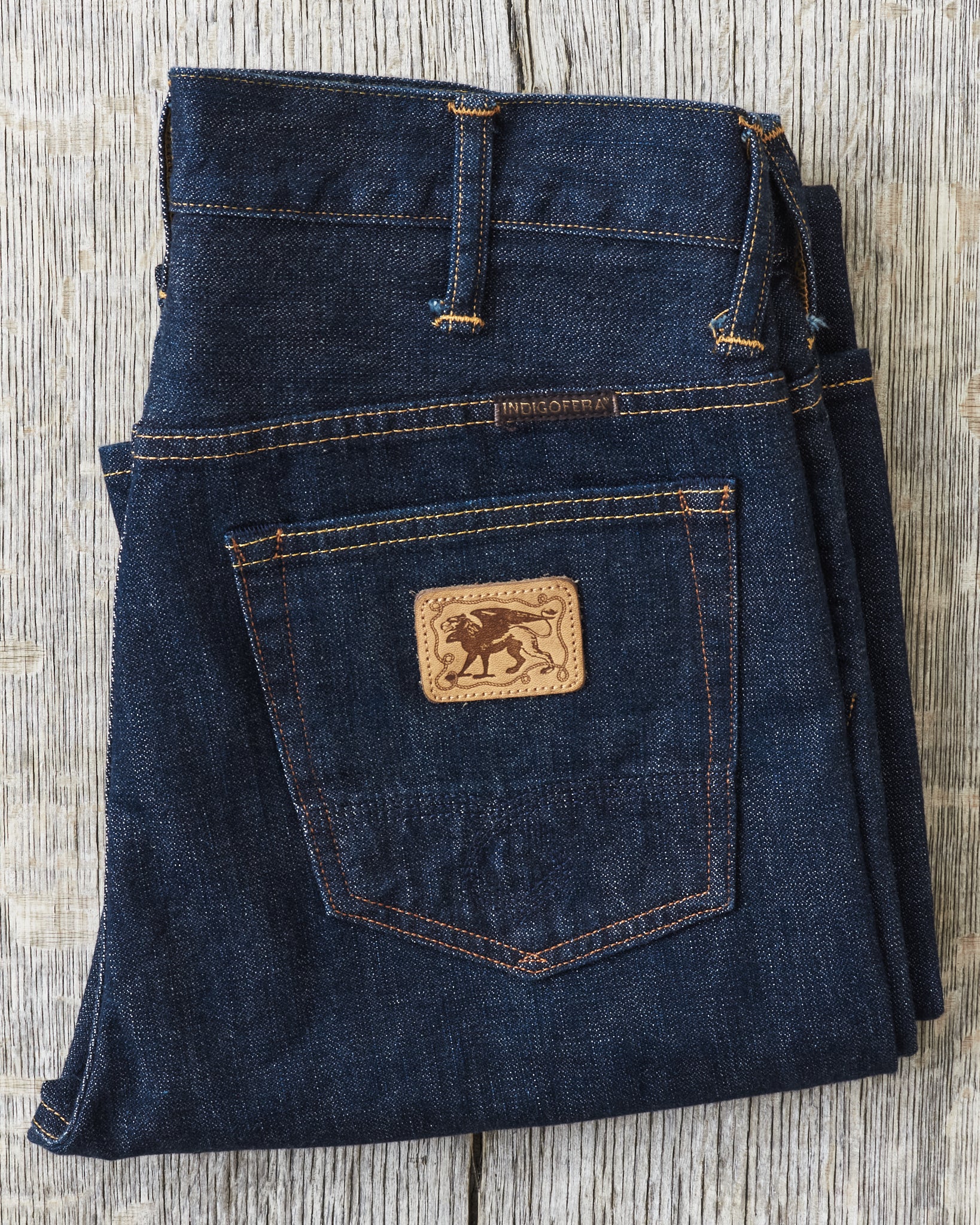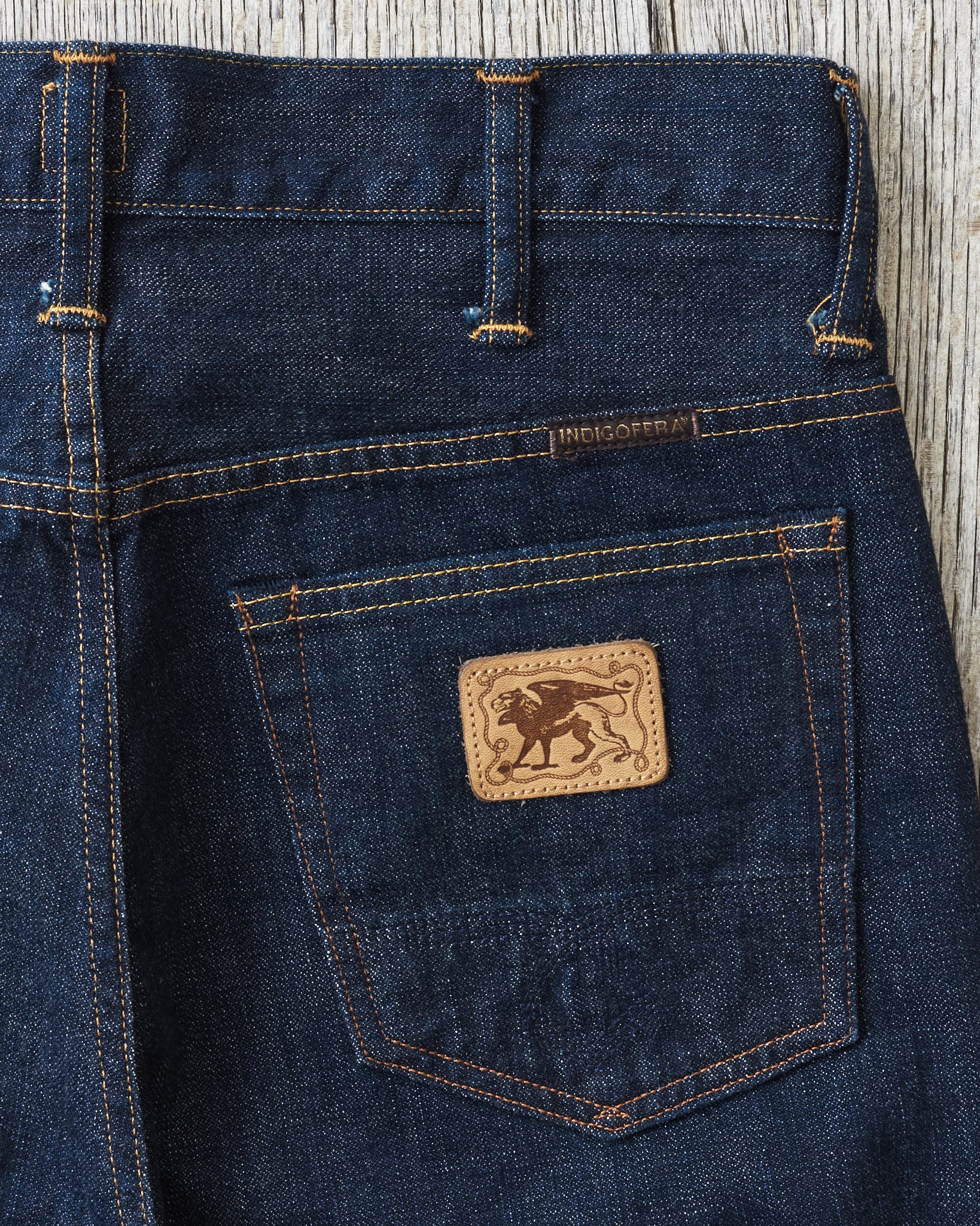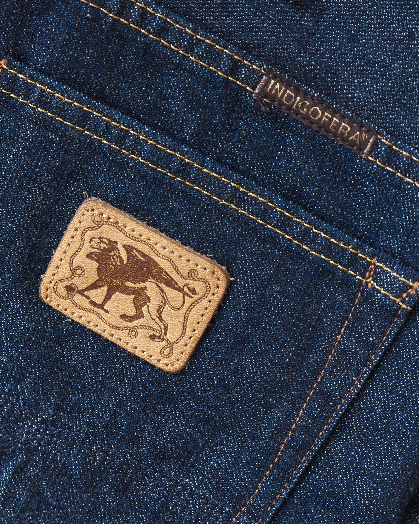 This is a reintroduction of a bootcut model by Indigofera. Wyatt is the predecessor of Hawk and the new version is with a higher waist, triple stitch decoration and a new leather patch on the rear pocket.