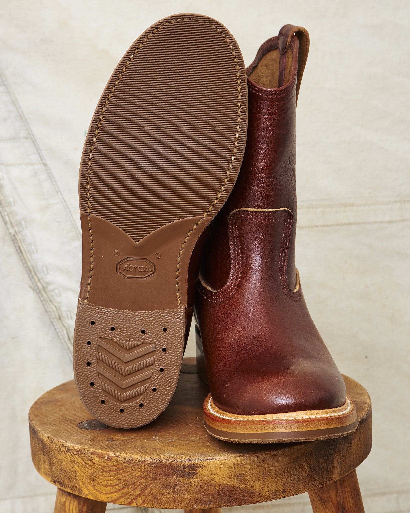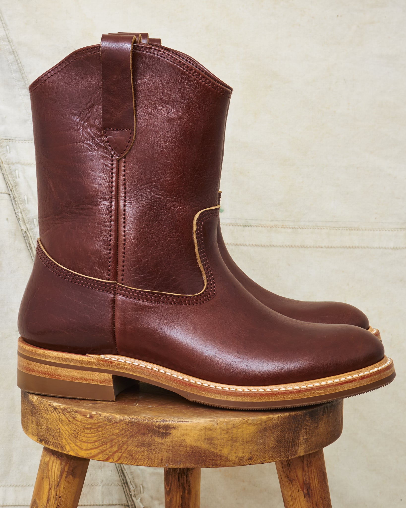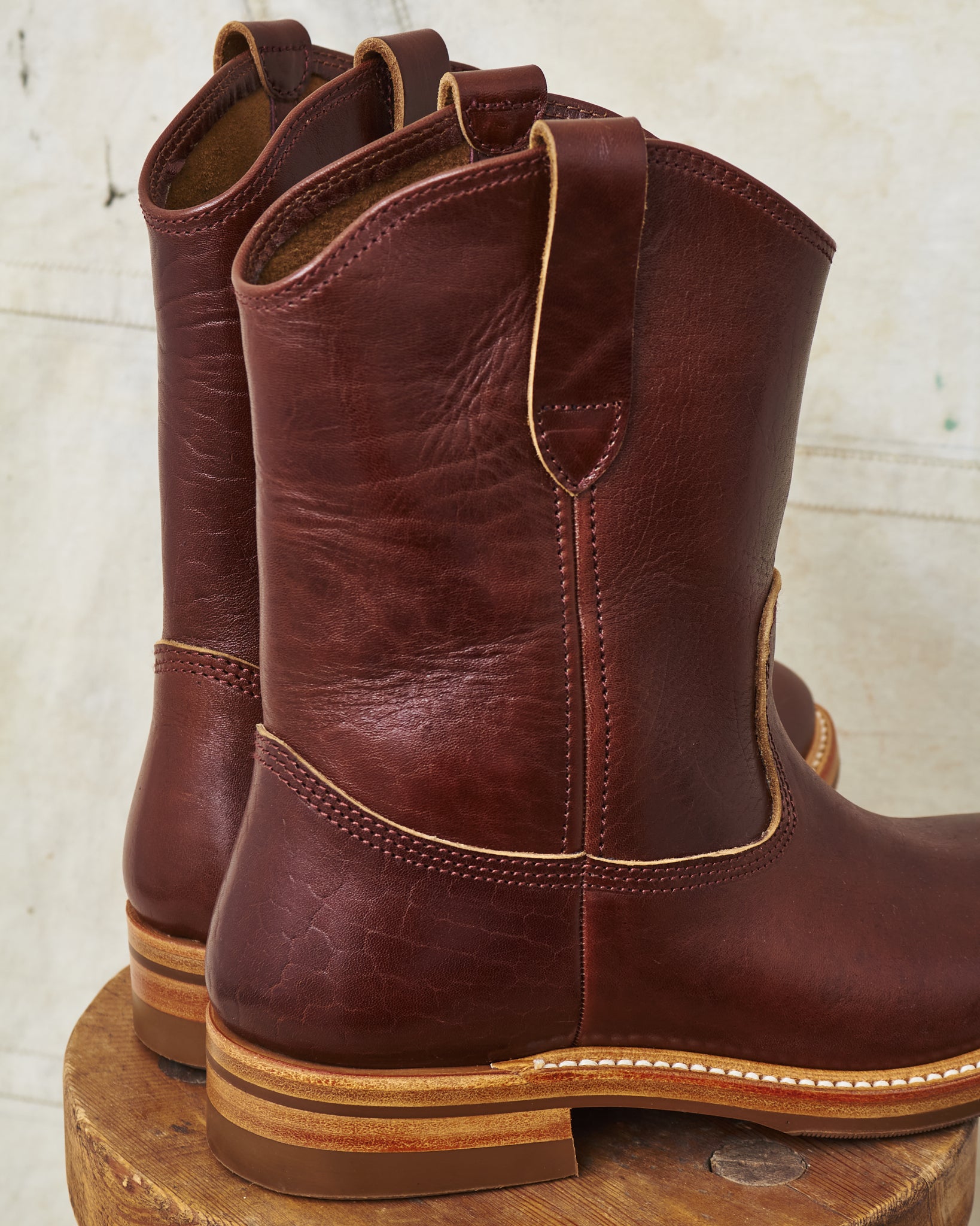These boots are made from start to finish by experienced craftsmen in Japan with no expenses spared in the sourcing of materials. The leather used is from the Shinki Hikaku tannery in Japan, a company that specializes in horsehide leather tanning. They are considered on of the best, if not the best, tanneries in the world. The leather might feel a bit stiff at the beginning but will soon soften and shape around your foot. A most beautiful patina will appear after years of wear.