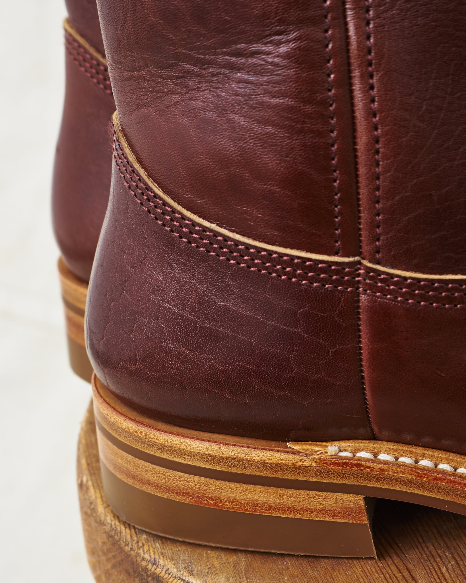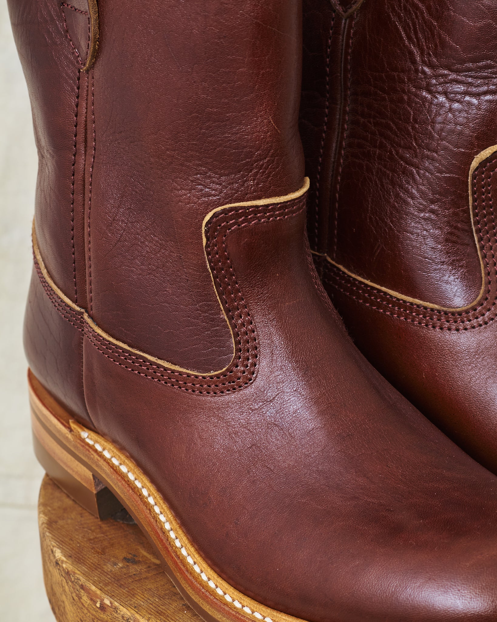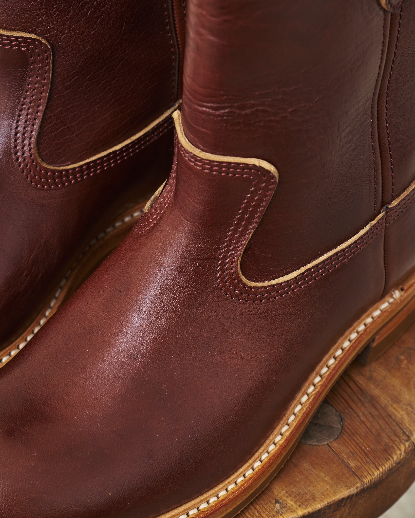 These boots are made from start to finish by experienced craftsmen in Japan with no expenses spared in the sourcing of materials. The leather used is from the Shinki Hikaku tannery in Japan, a company that specializes in horsehide leather tanning. They are considered on of the best, if not the best, tanneries in the world. The leather might feel a bit stiff at the beginning but will soon soften and shape around your foot. A most beautiful patina will appear after years of wear.