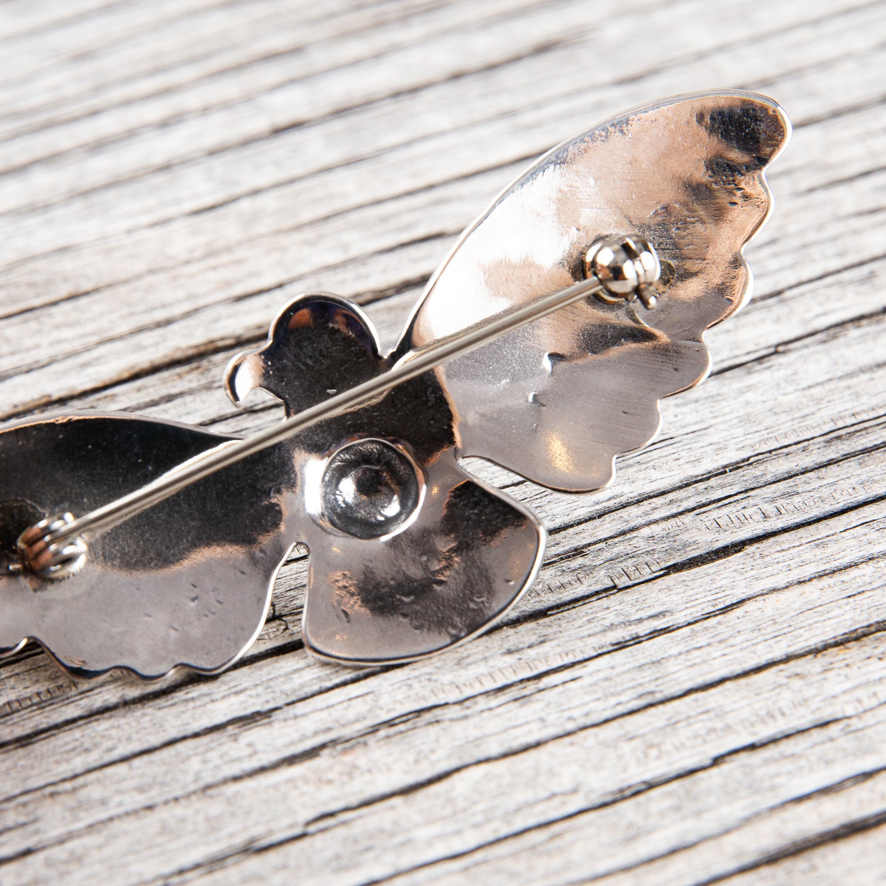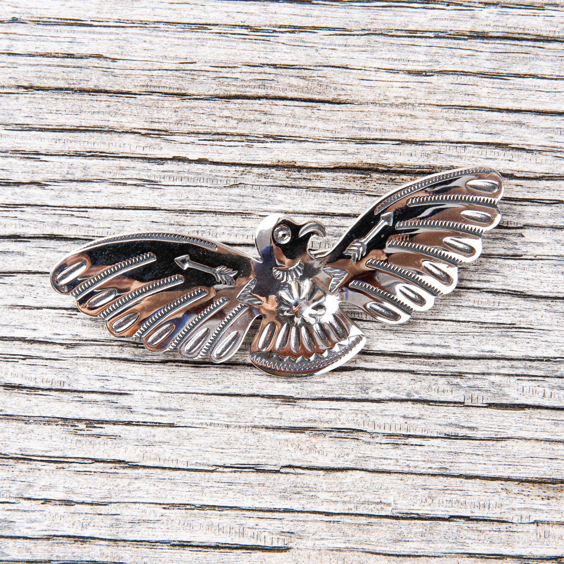 Thunderbird silver brooch made by hand in Japan by Larry Smith. Inspired by Native American jewelry from the so called "Fred Harvey era" dating back to the early 20th century.