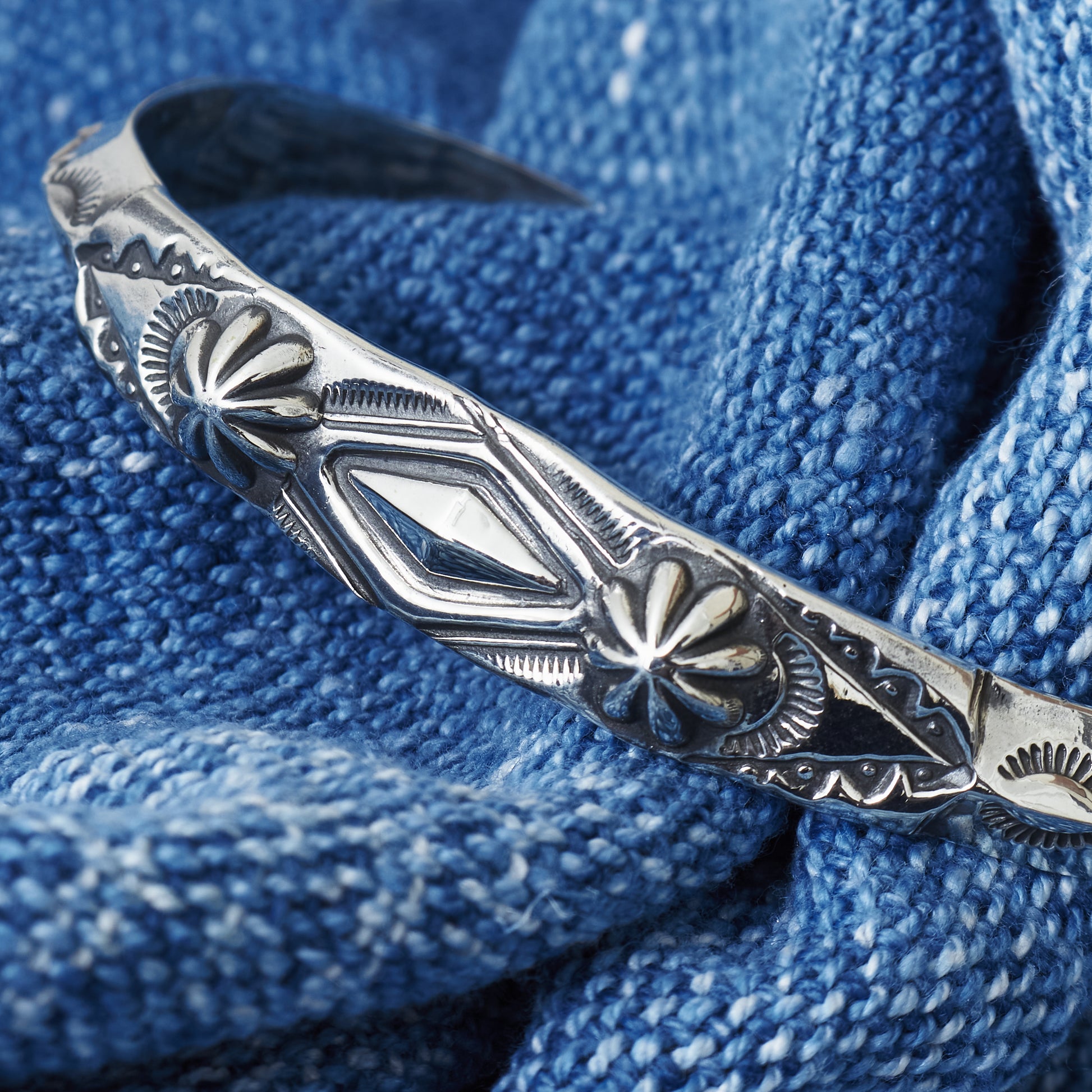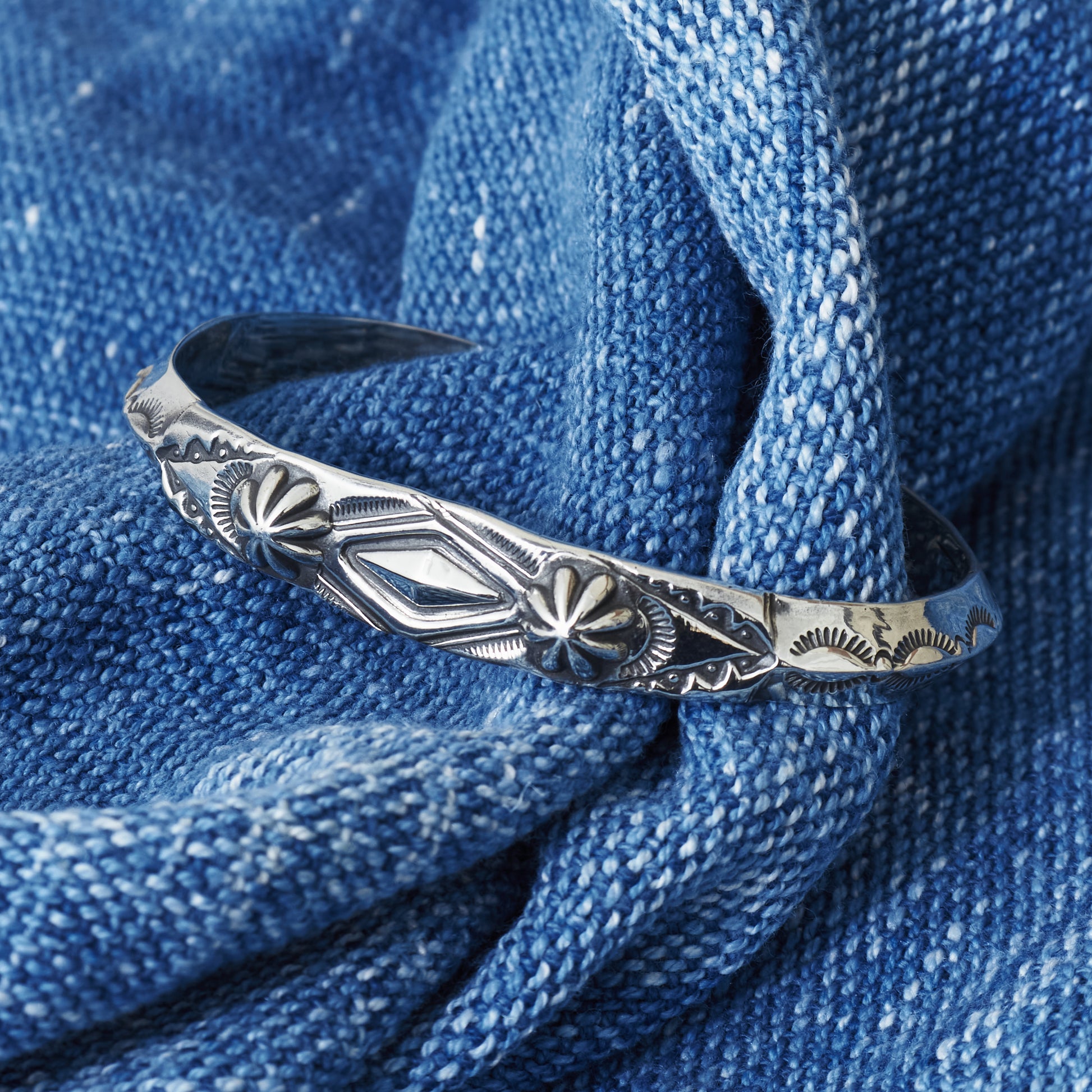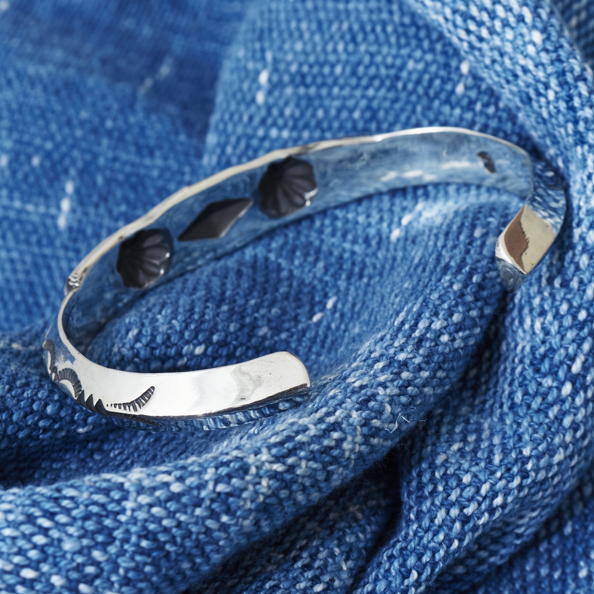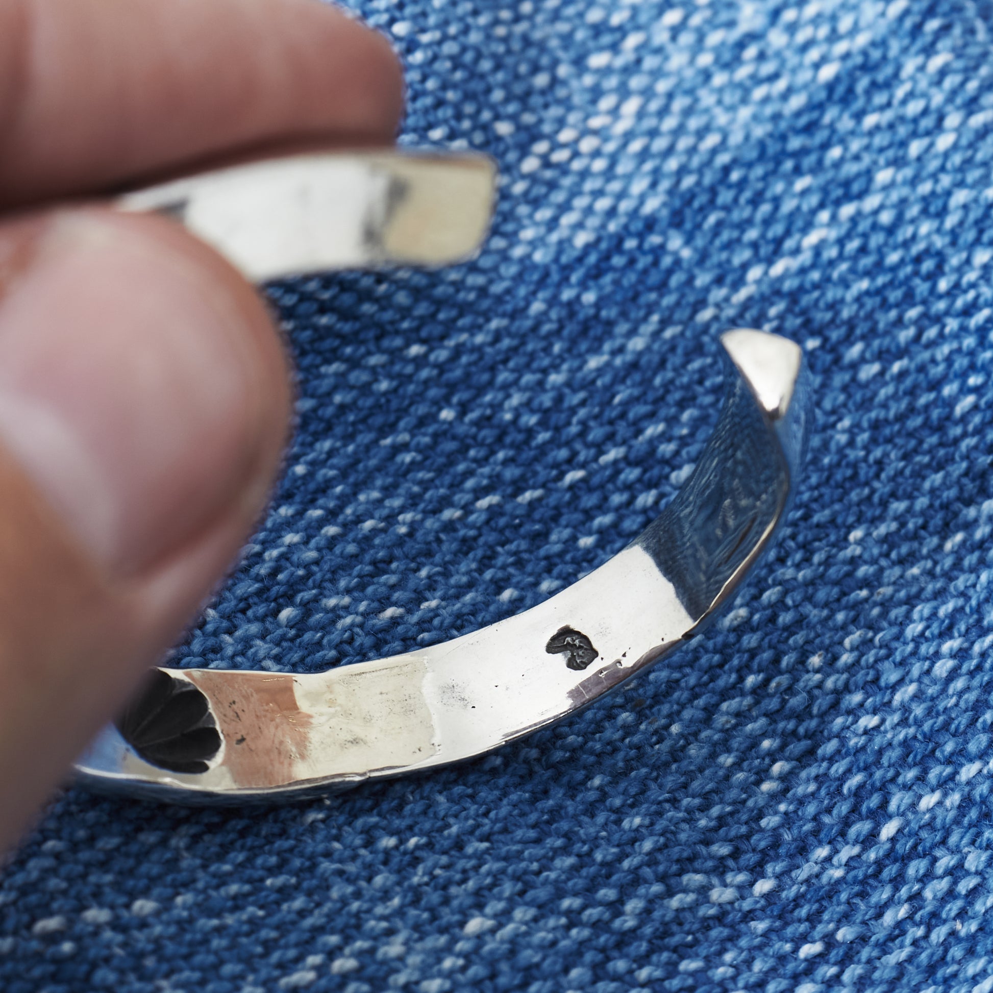 This silver bracelet is all handmade made by Larry Smith in Japan. Inspired by Native American jewelry from the so called Fred Harvey era dating back to the early 20th century. This thin bracelet looks great worn as it is or combined with other bracelets around you wrist.